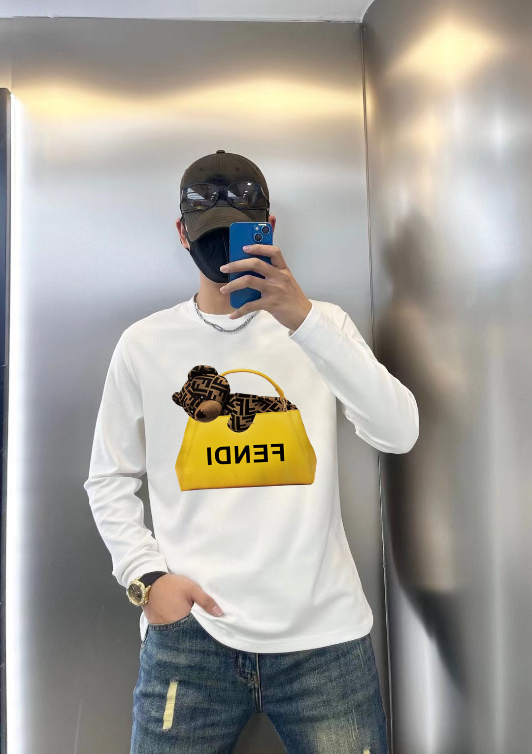 这款衣服是AAAAA 1:1 质量 (非常棒). 使用了和原版一模一样的材料. 商标部分也保持了和芬迪/Fendi一样. 图片拍摄是实物衣服拍摄, 您所收到的实物保证和我们图片一模一样.
