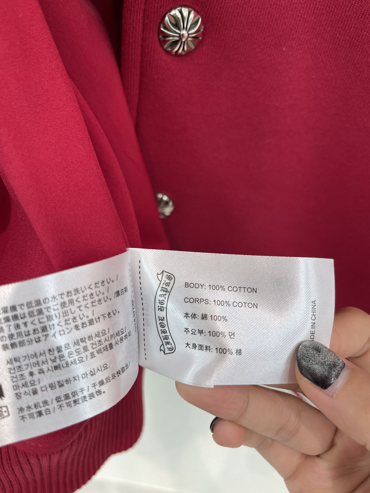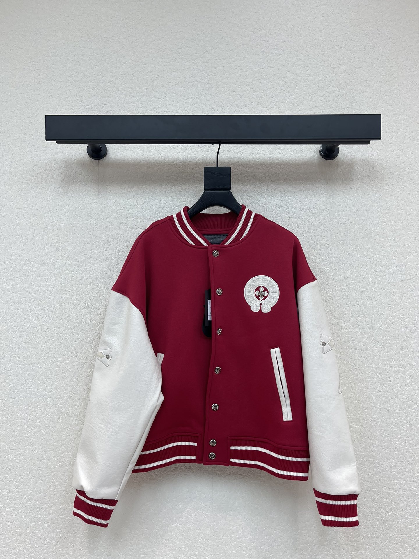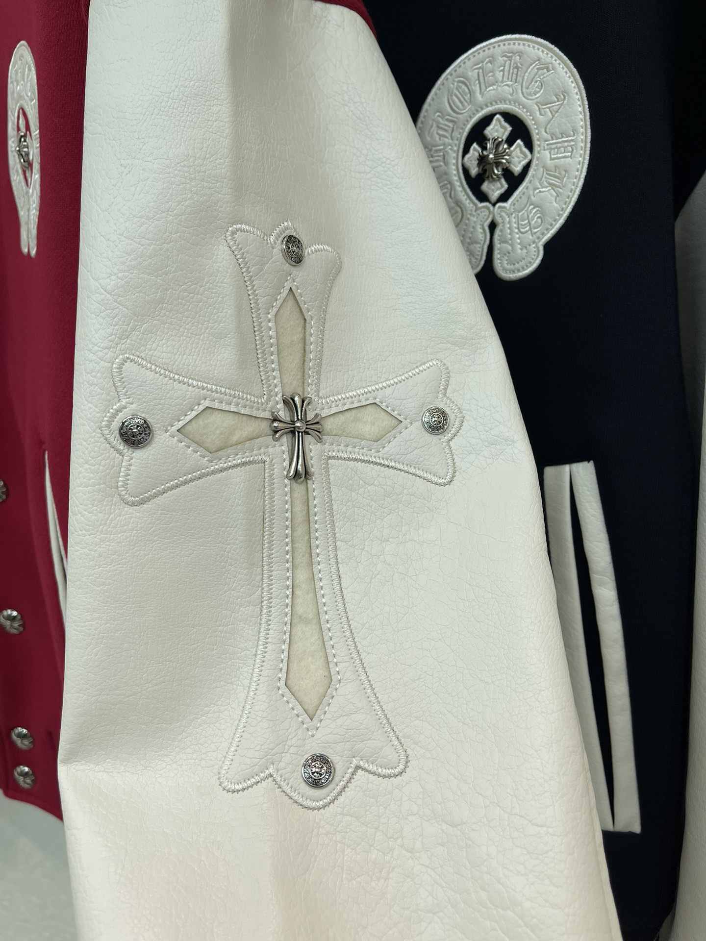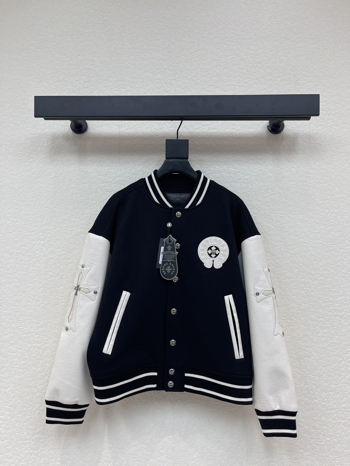 这款衣服是AAAAA 1:1 质量 (非常棒). 使用了和原版一模一样的材料. 商标部分也保持了和克罗心/Chrome Hearts一样. 图片拍摄是实物衣服拍摄, 您所收到的实物保证和我们图片一模一样.