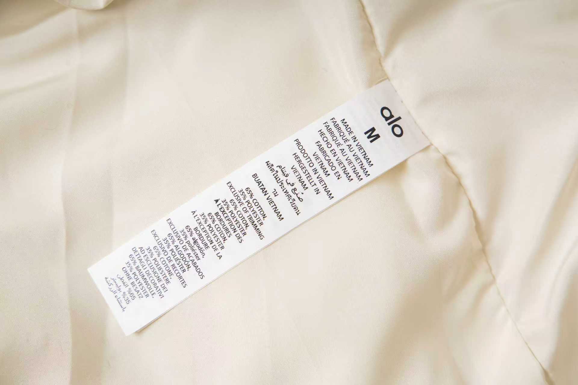 这款衣服是AAAAA 1:1 质量 (非常棒). 使用了和原版一模一样的材料. 商标部分也保持了和Alo Yoga一样. 图片拍摄是实物衣服拍摄, 您所收到的实物保证和我们图片一模一样.