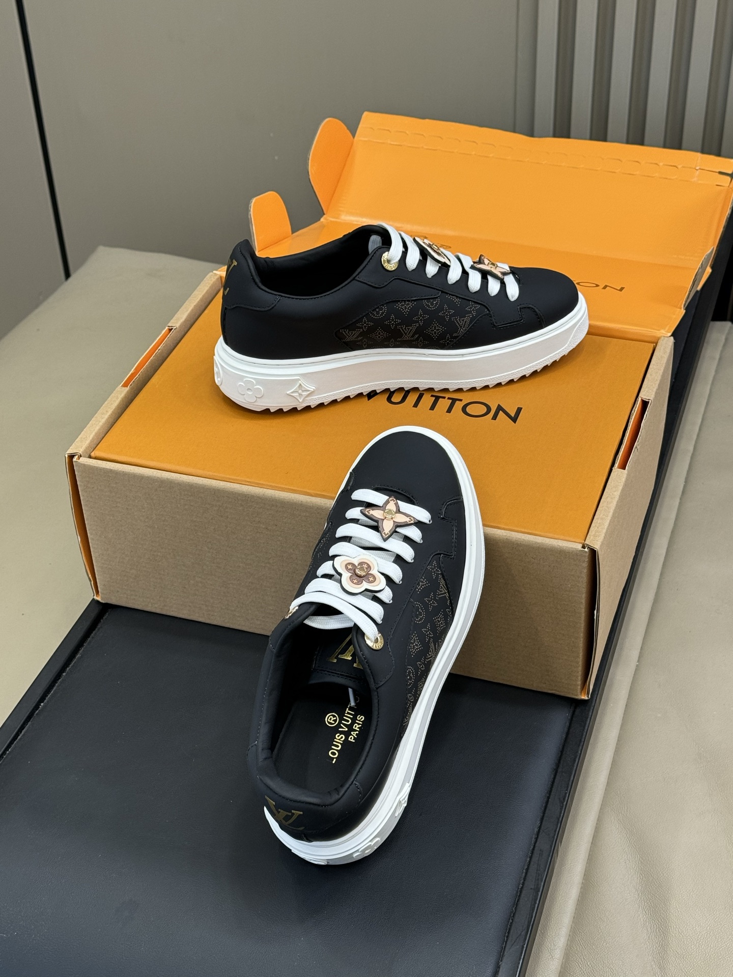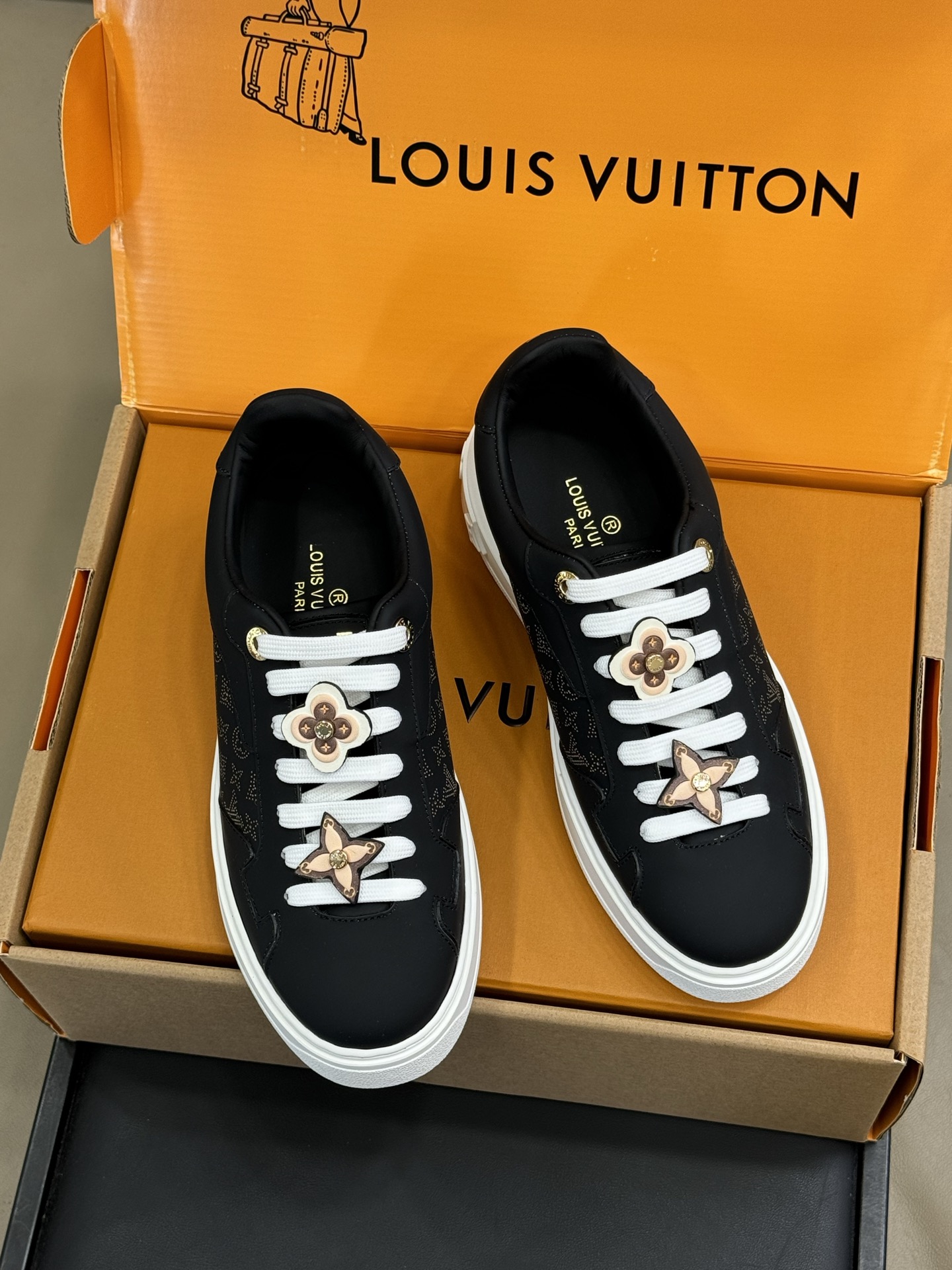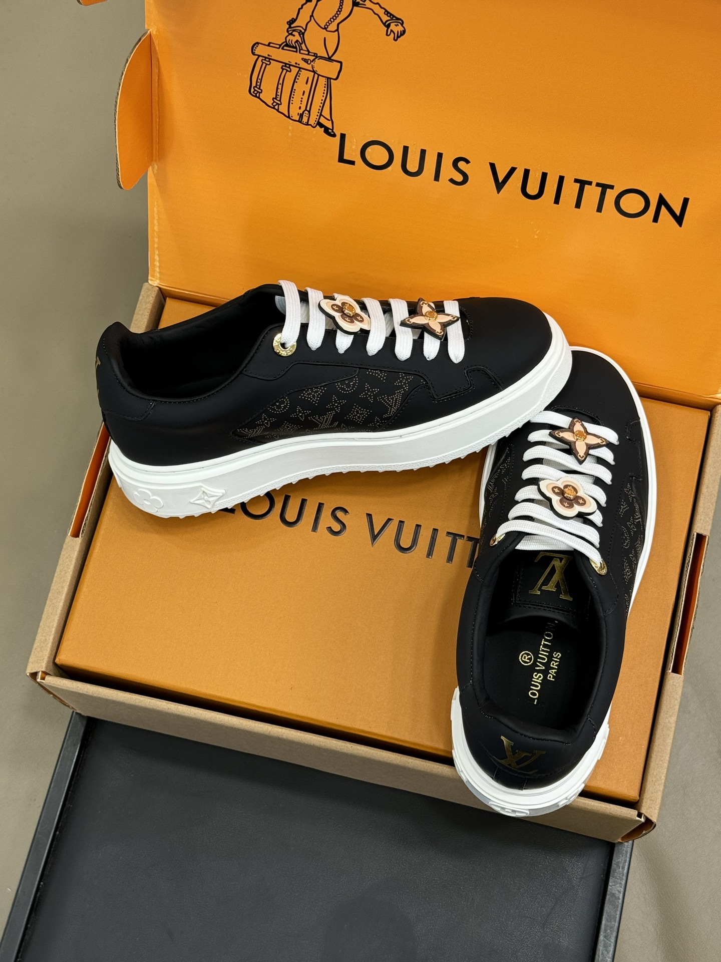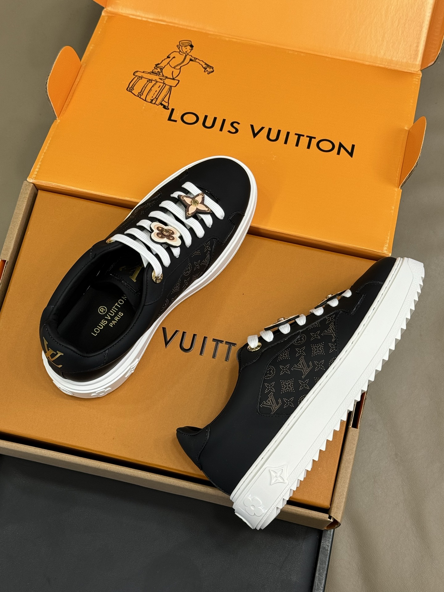 这款鞋子是AAAAA 1:1 质量 (非常棒). 使用了和原版一模一样的材料. 商标部分也保持了和路易威登/Louis Vuitton一样. 图片拍摄是实物鞋子拍摄, 您所收到的实物保证和我们图片一模一样.