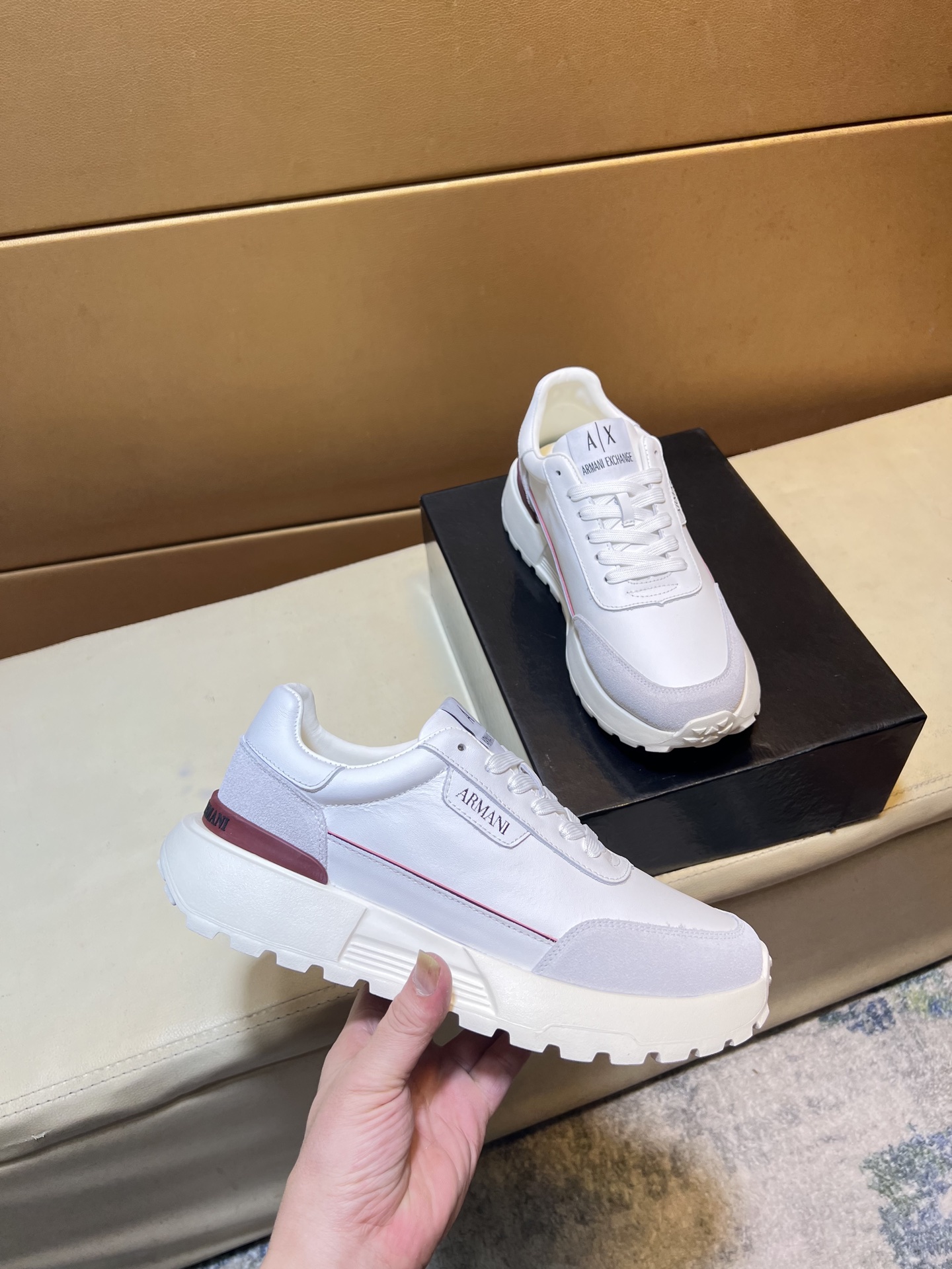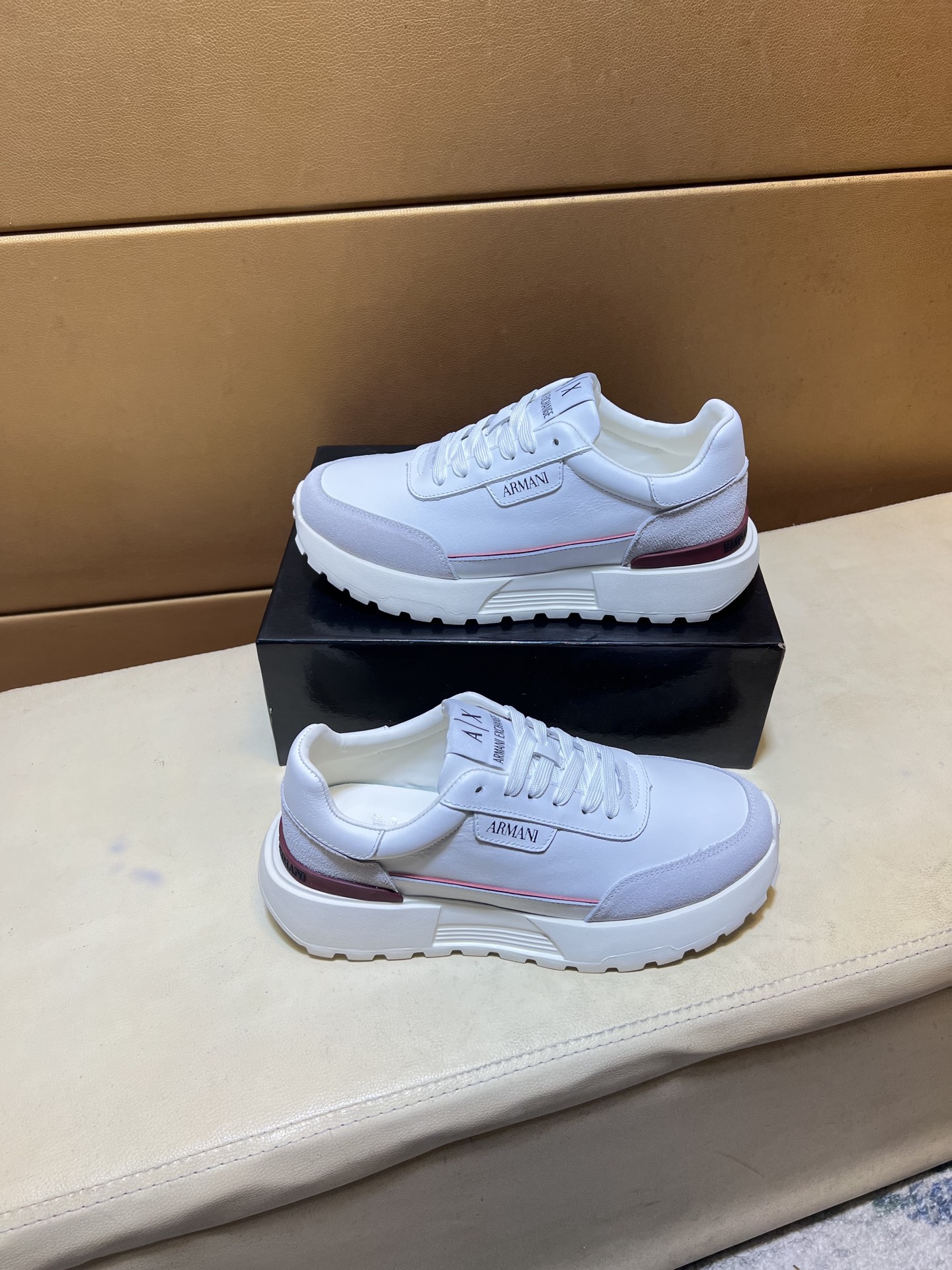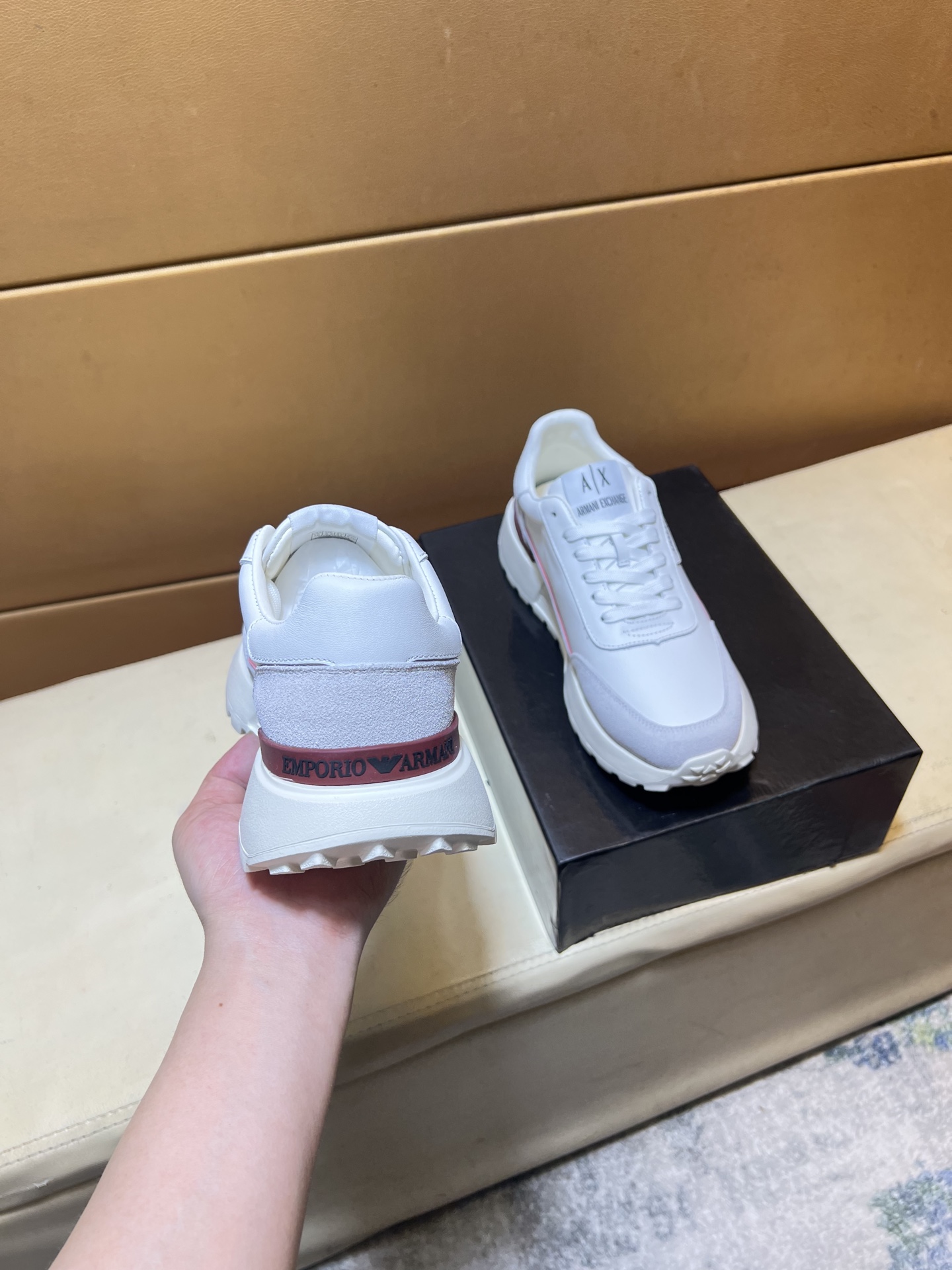 这款鞋子是AAAAA 1:1 质量 (非常棒). 使用了和原版一模一样的材料. 商标部分也保持了和阿玛尼/Armani一样. 图片拍摄是实物鞋子拍摄, 您所收到的实物保证和我们图片一模一样.