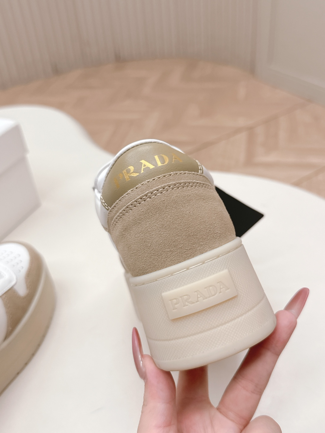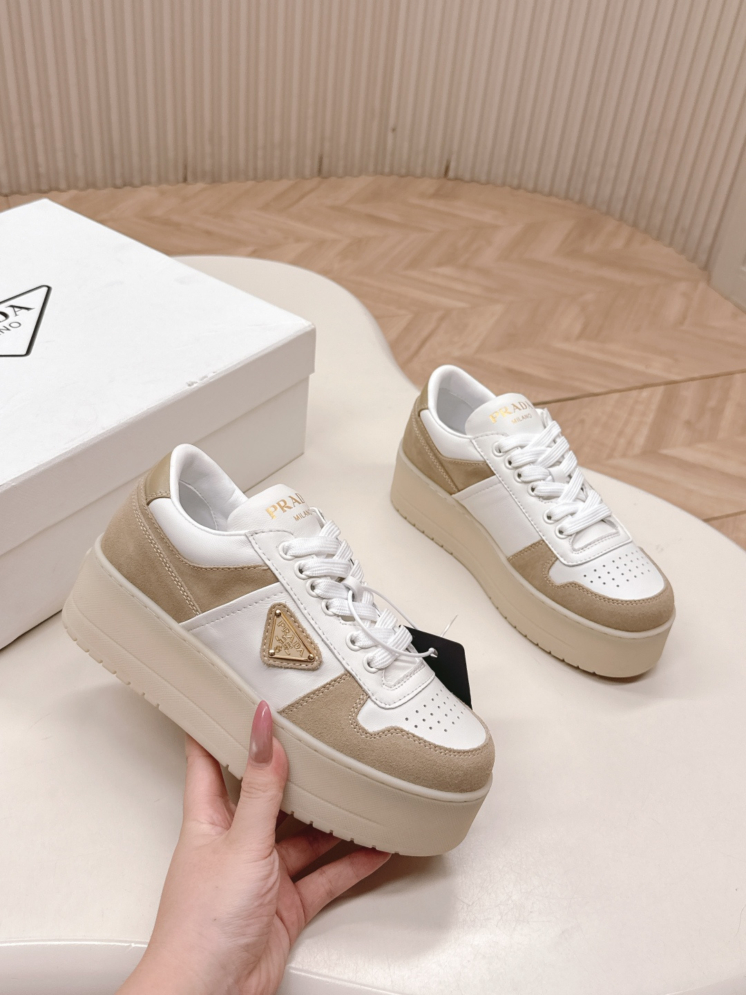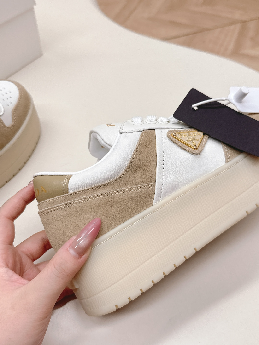 这款鞋子是AAAAA 1:1 质量 (非常棒). 使用了和原版一模一样的材料. 商标部分也保持了和普拉达/Prada一样. 图片拍摄是实物鞋子拍摄, 您所收到的实物保证和我们图片一模一样.