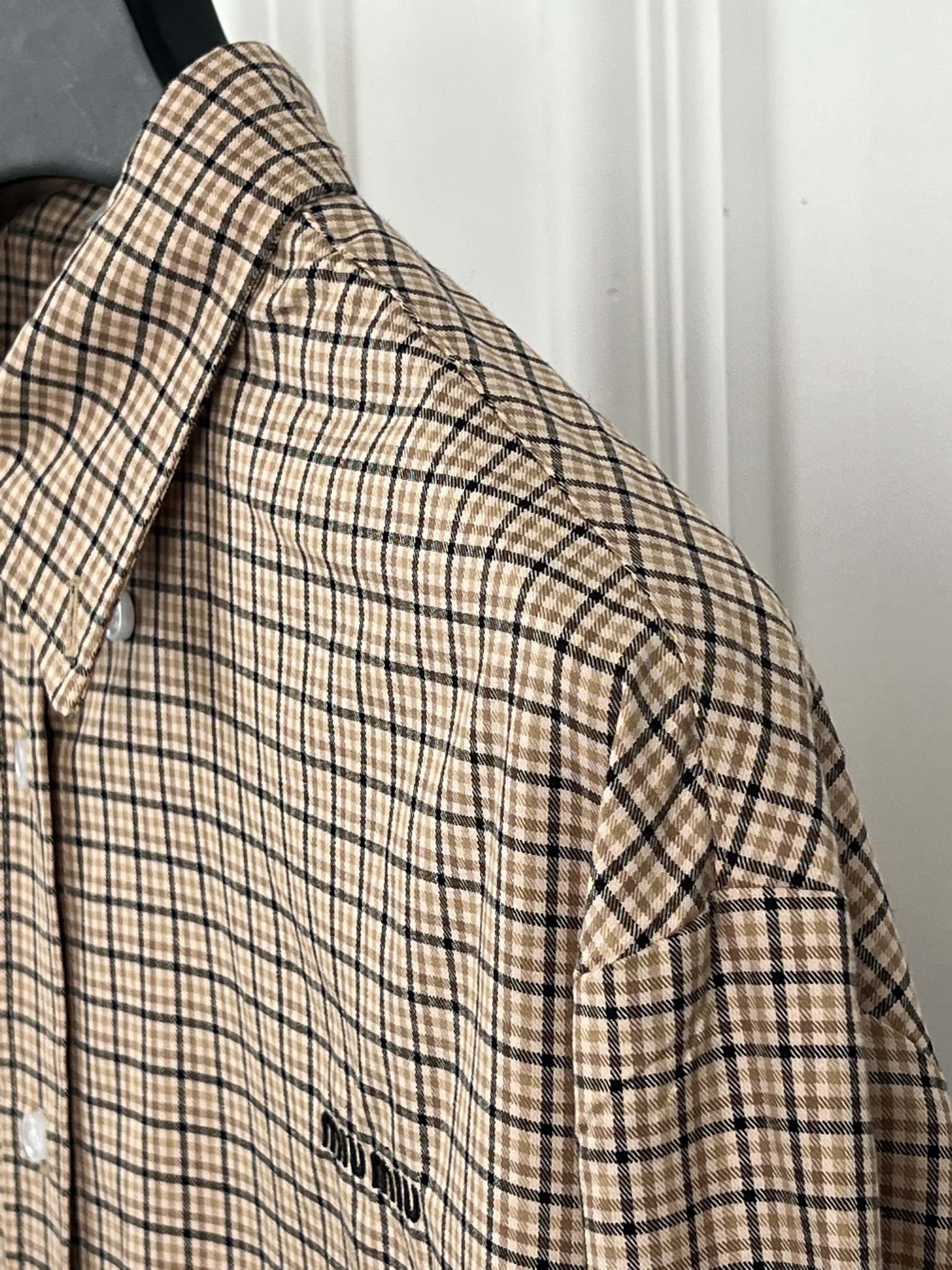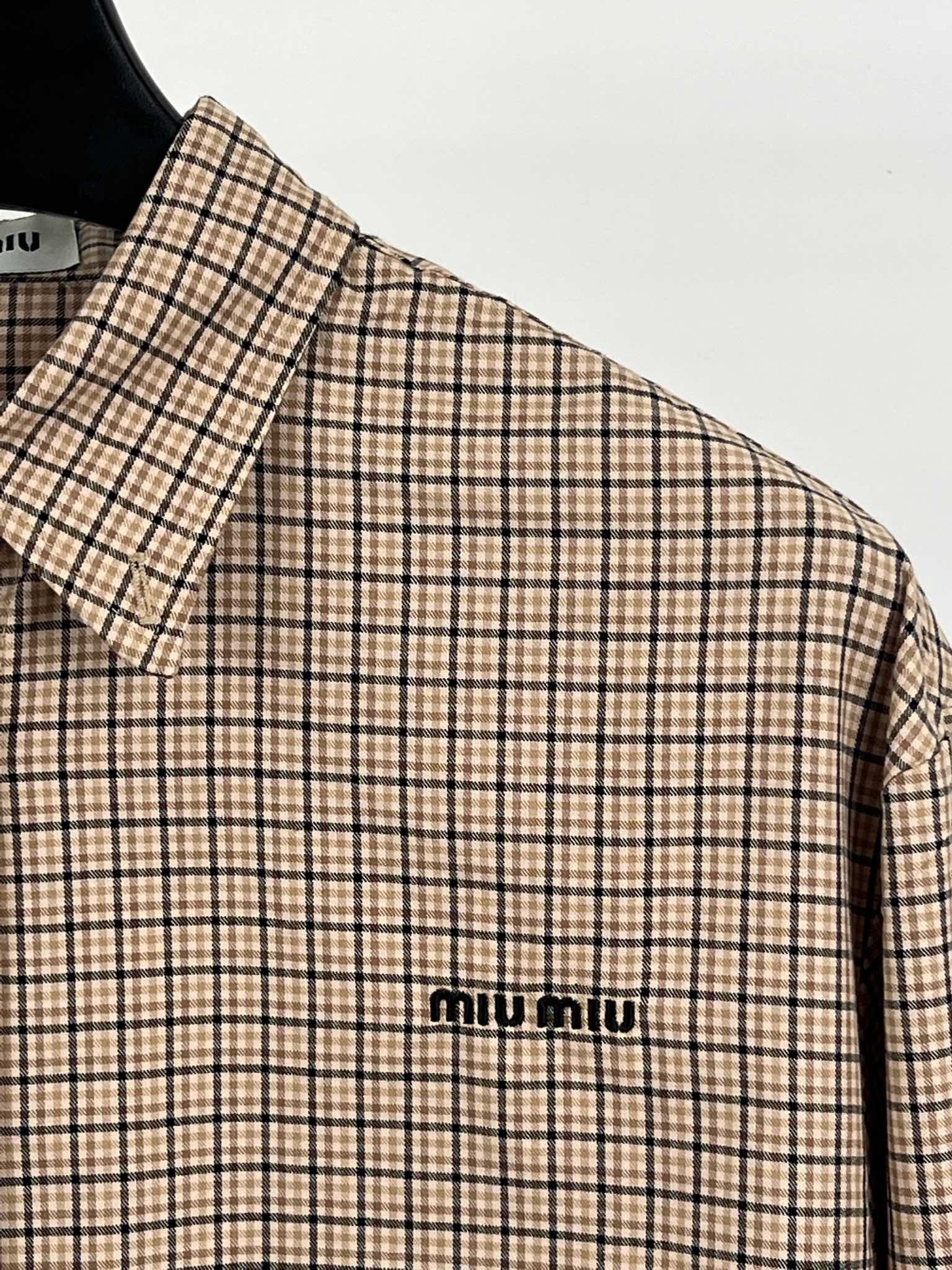 这款衣服是AAAAA 1:1 质量 (非常棒). 使用了和原版一模一样的材料. 商标部分也保持了和缪缪/Miu Miu一样. 图片拍摄是实物衣服拍摄, 您所收到的实物保证和我们图片一模一样.