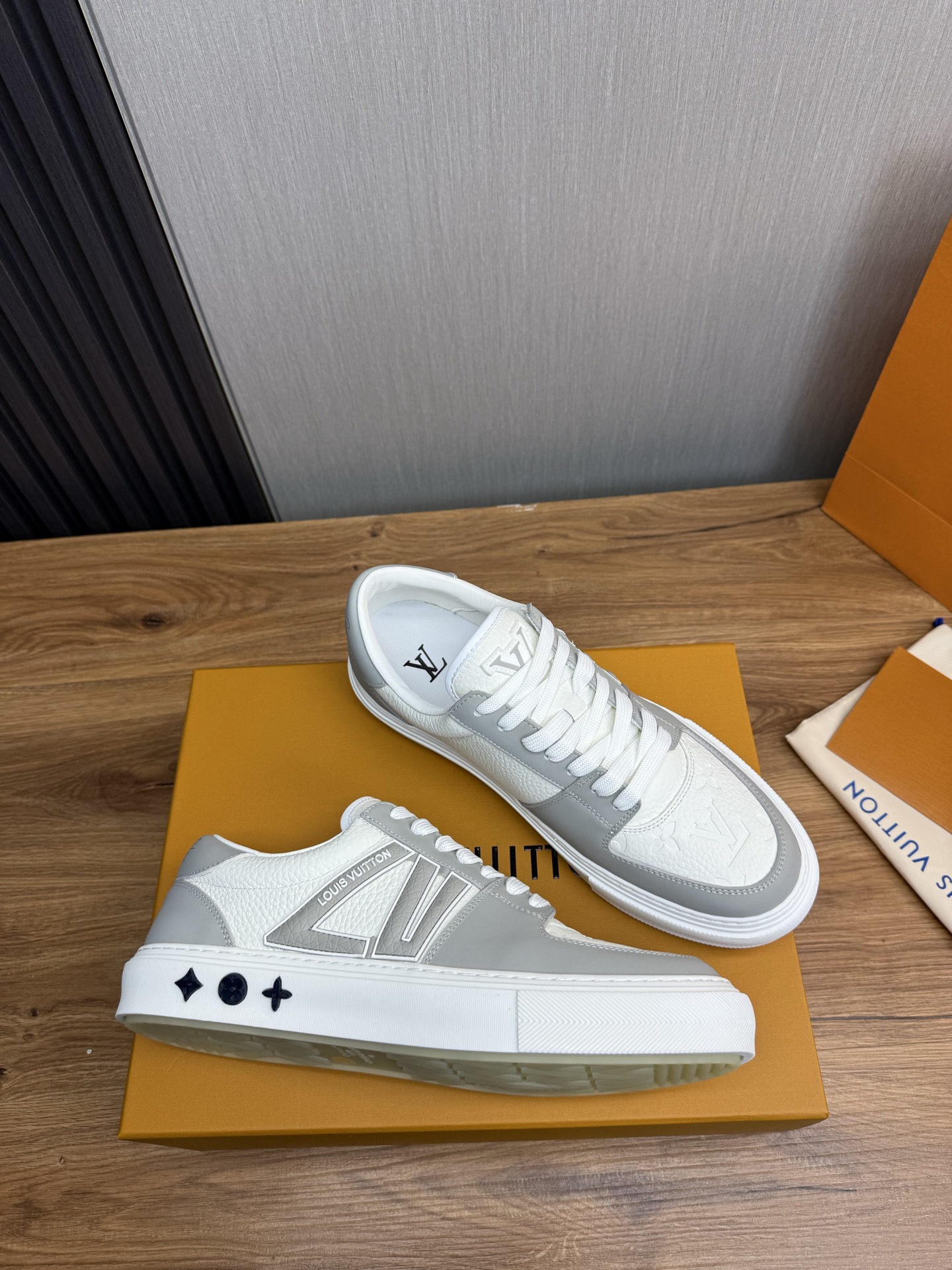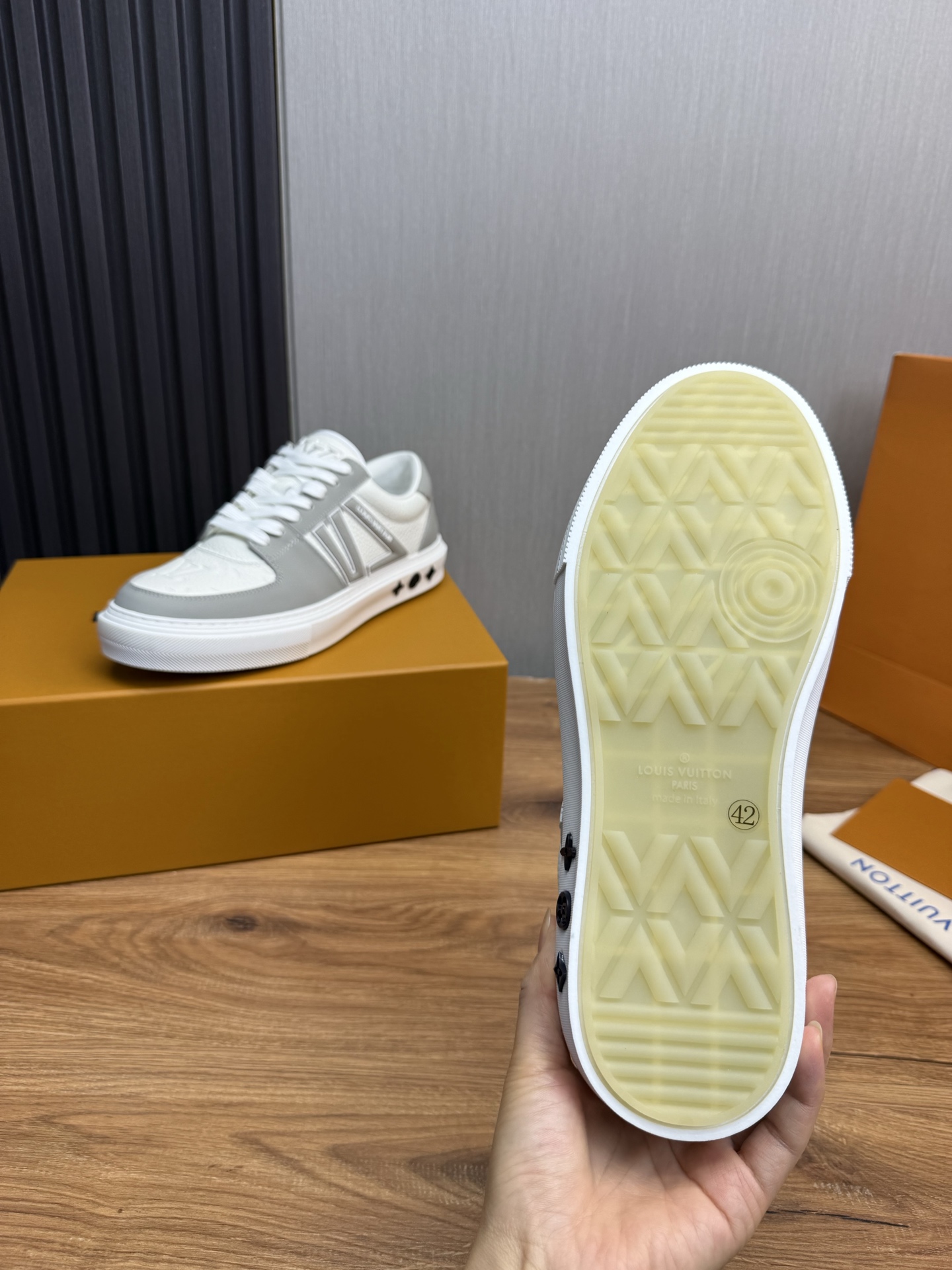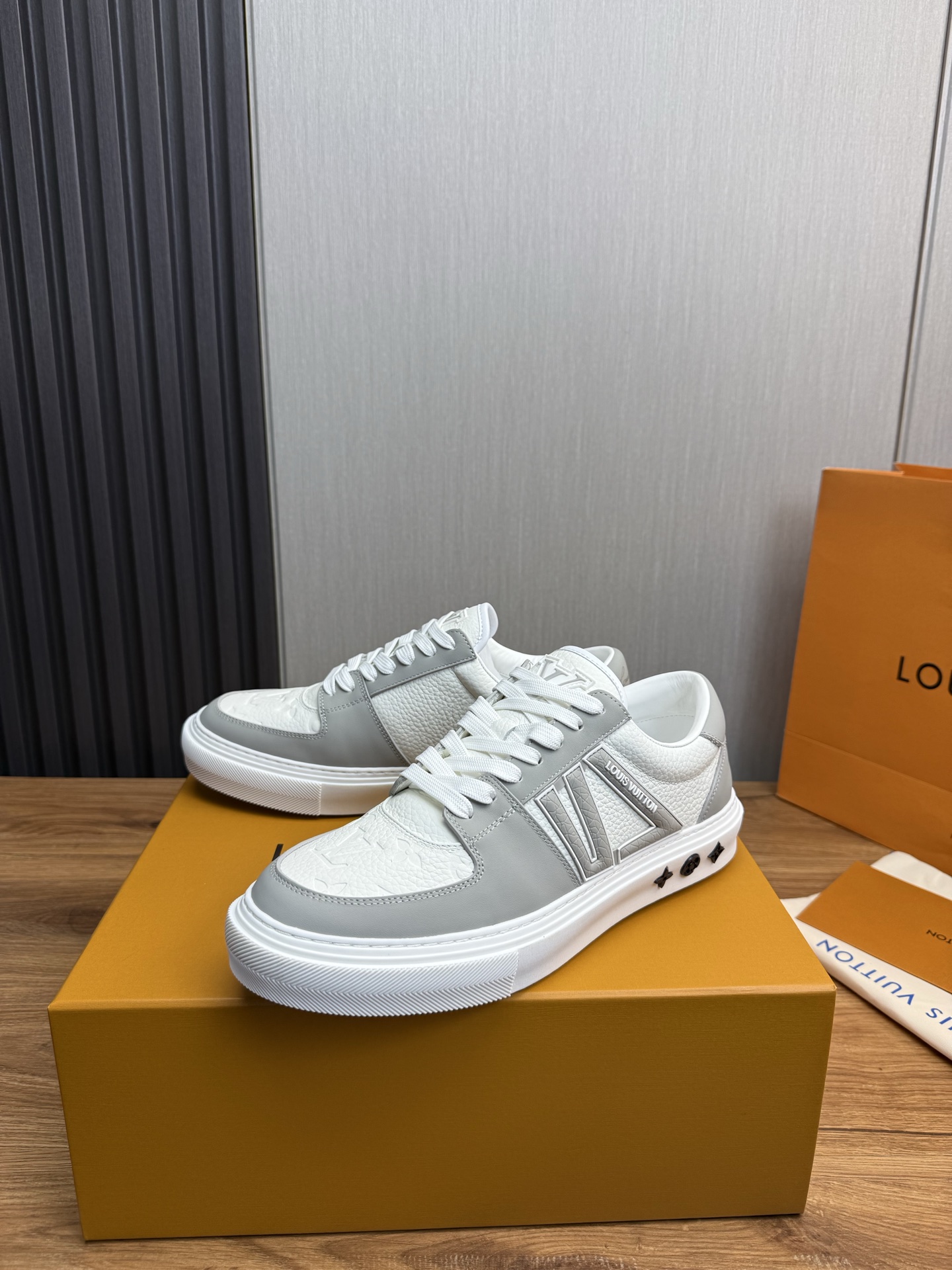 这款鞋子是AAAAA 1:1 质量 (非常棒). 使用了和原版一模一样的材料. 商标部分也保持了和路易威登/Louis Vuitton一样. 图片拍摄是实物鞋子拍摄, 您所收到的实物保证和我们图片一模一样.