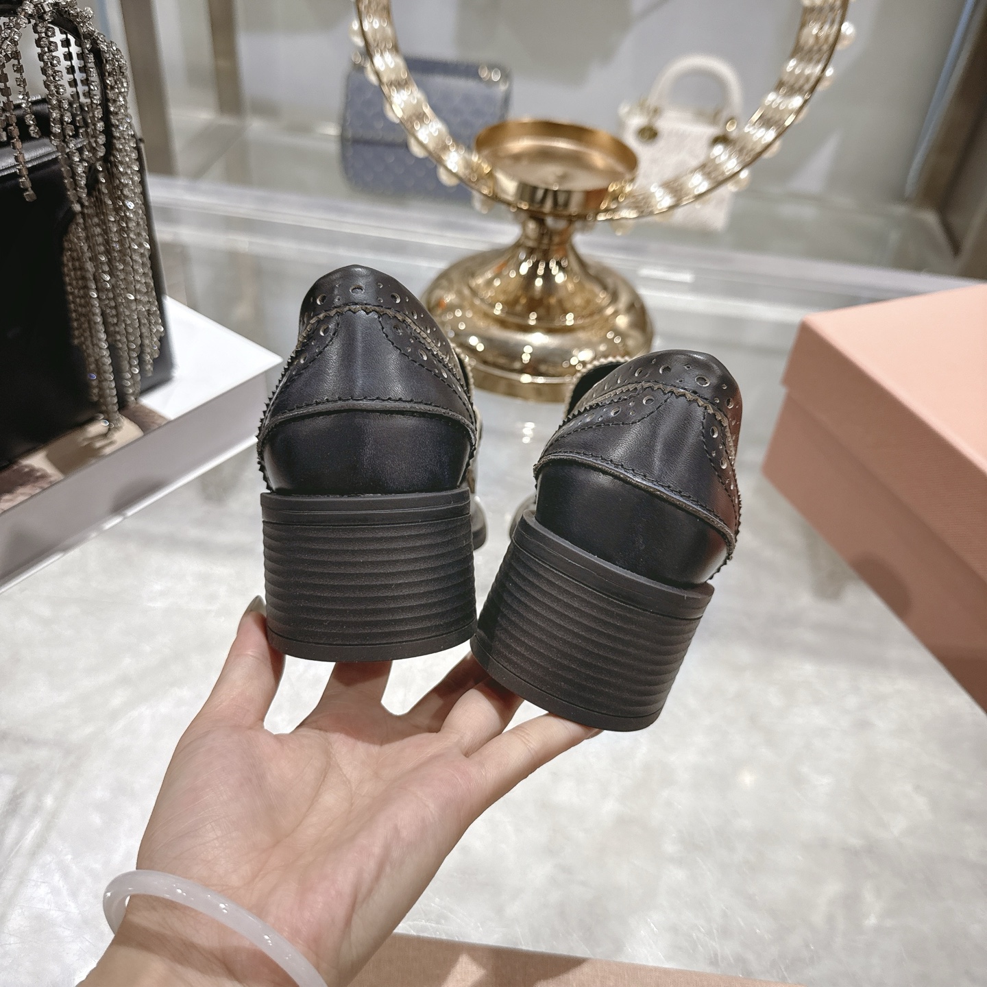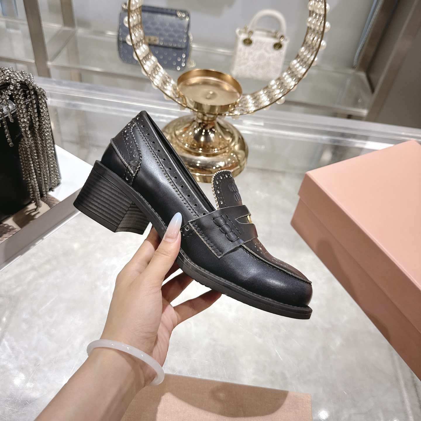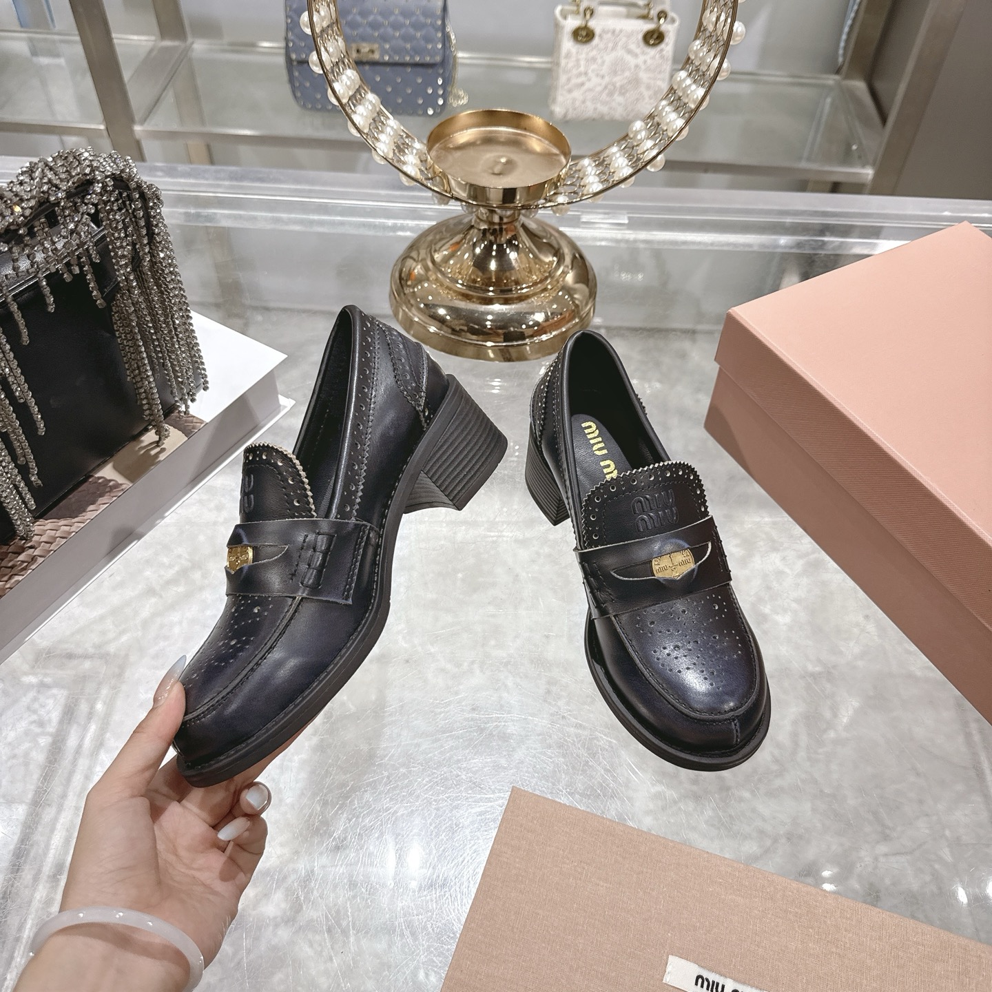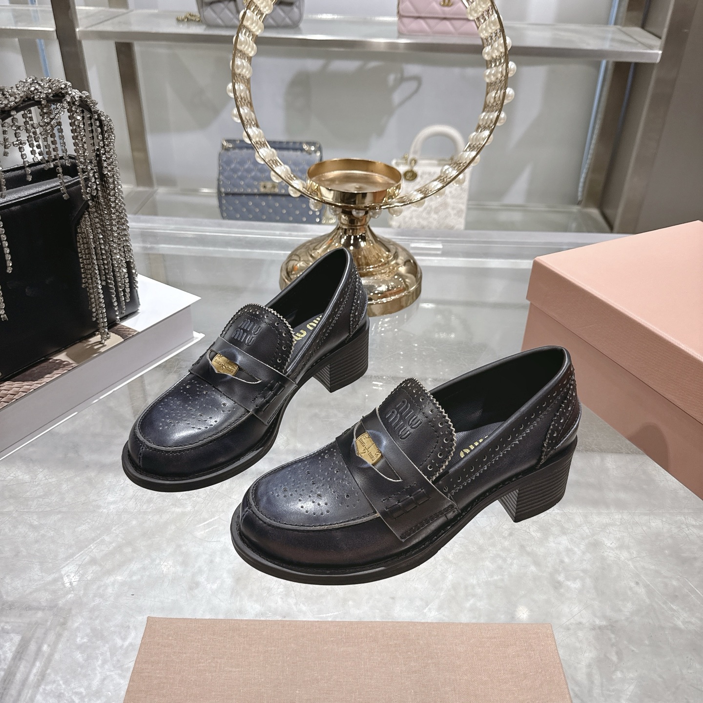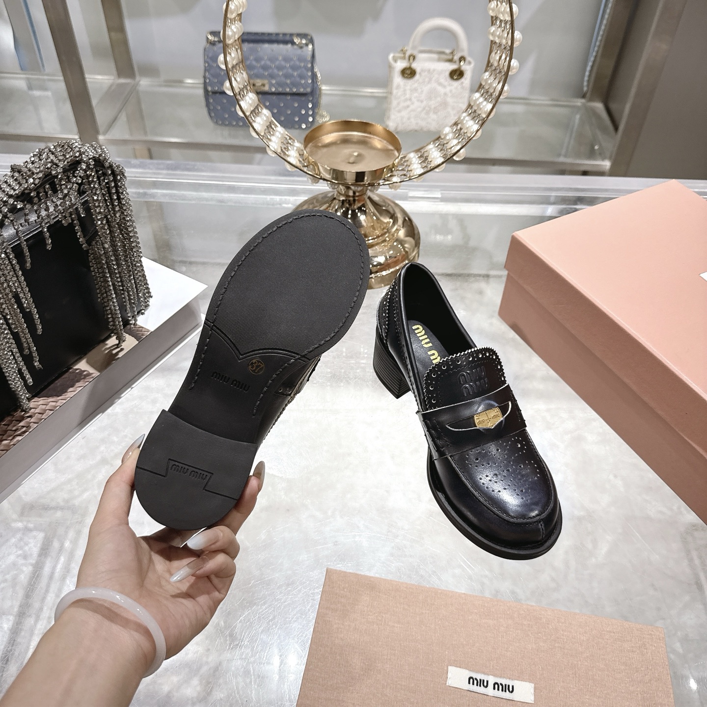 这款鞋子是AAAAA 1:1 质量 (非常棒). 使用了和原版一模一样的材料. 商标部分也保持了和缪缪/Miu Miu一样. 图片拍摄是实物鞋子拍摄, 您所收到的实物保证和我们图片一模一样.