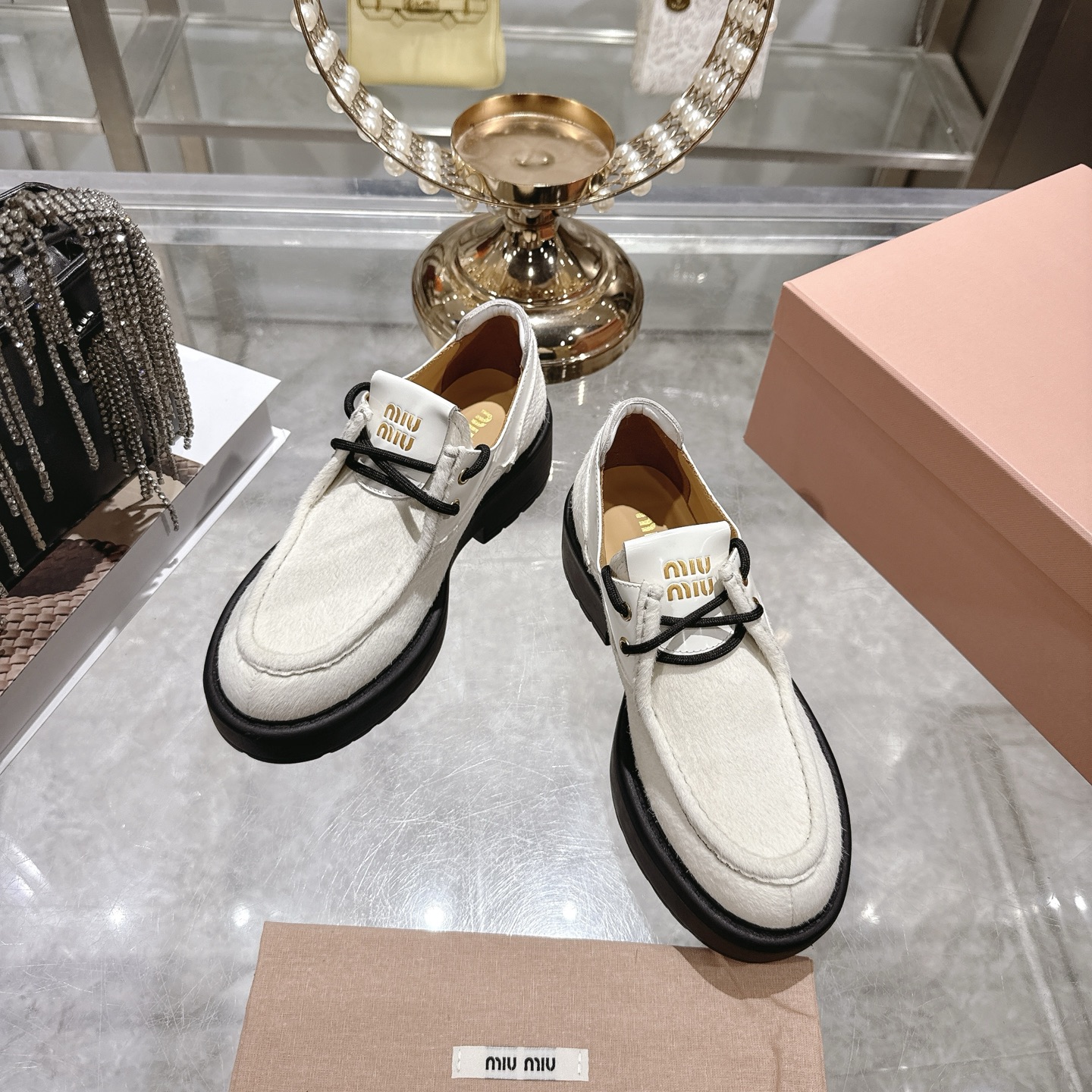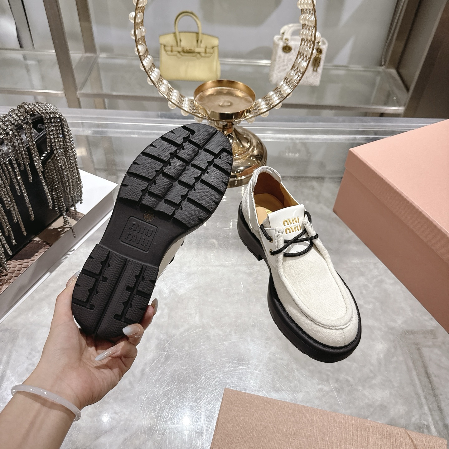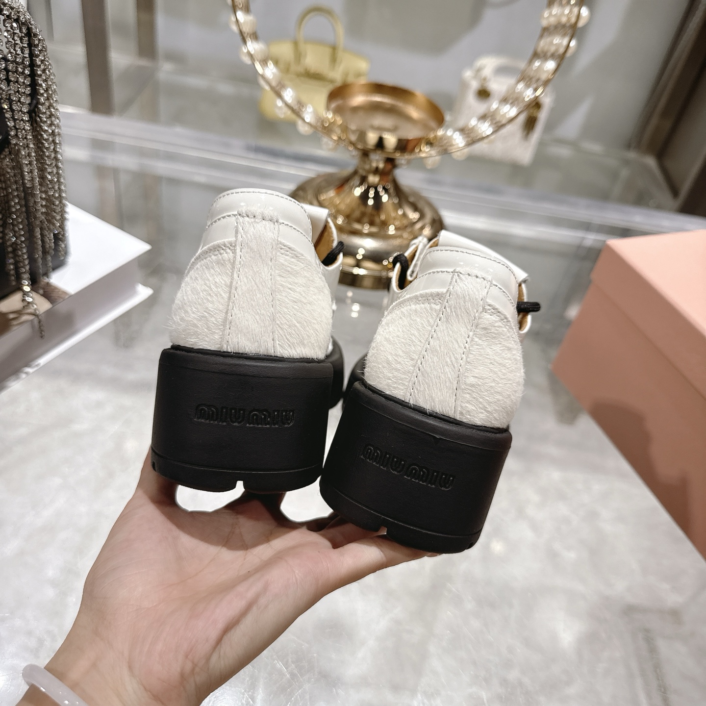 这款鞋子是AAAAA 1:1 质量 (非常棒). 使用了和原版一模一样的材料. 商标部分也保持了和缪缪/Miu Miu一样. 图片拍摄是实物鞋子拍摄, 您所收到的实物保证和我们图片一模一样.