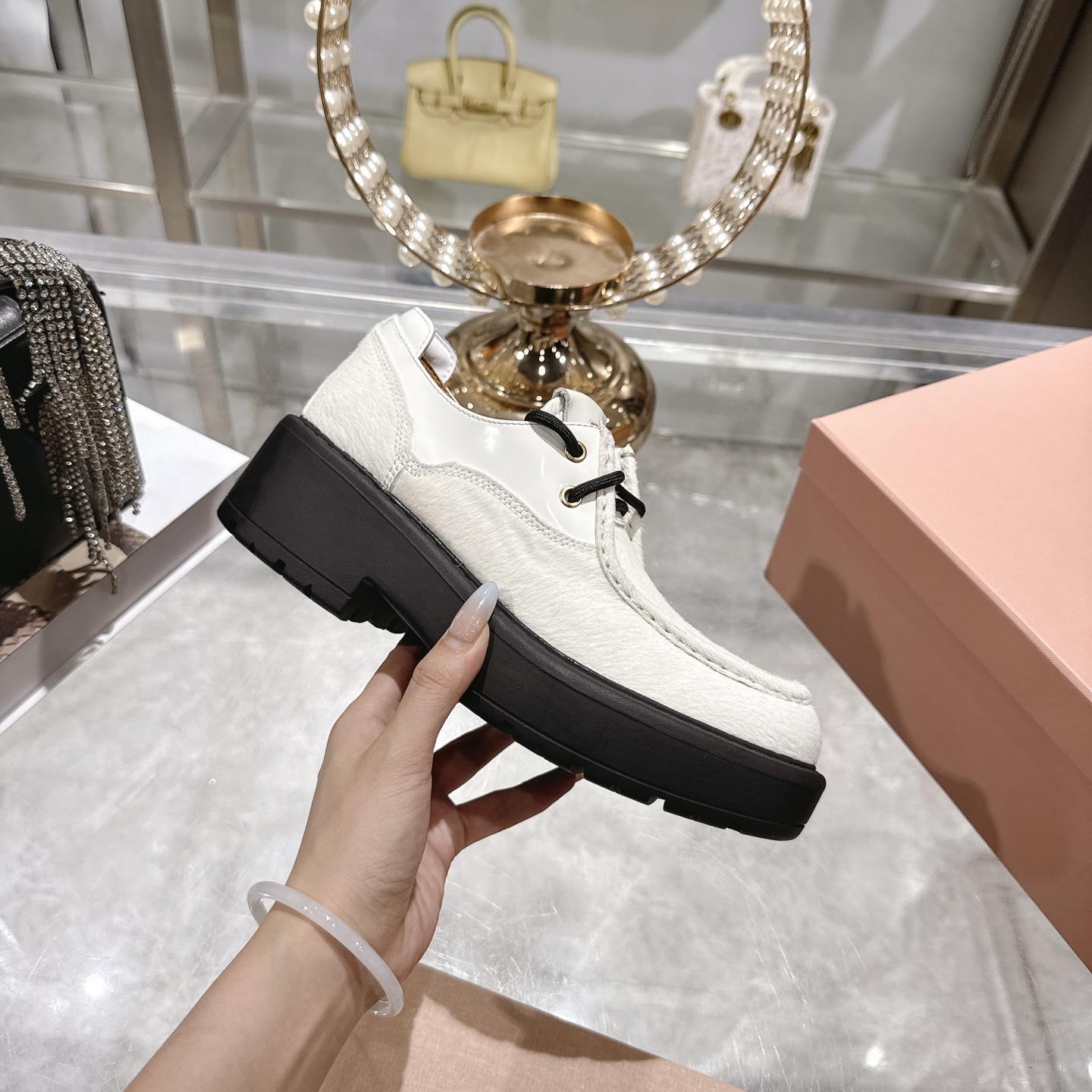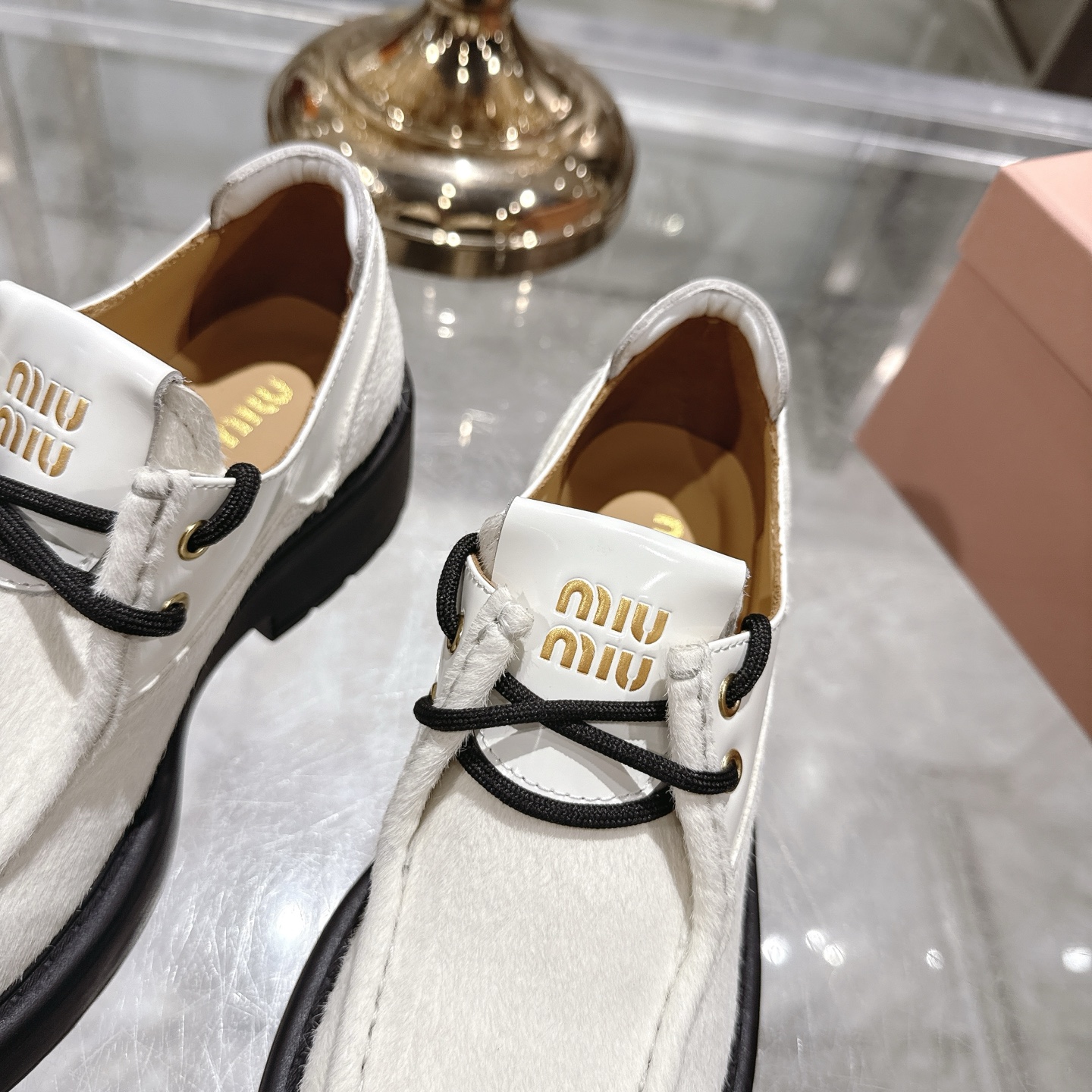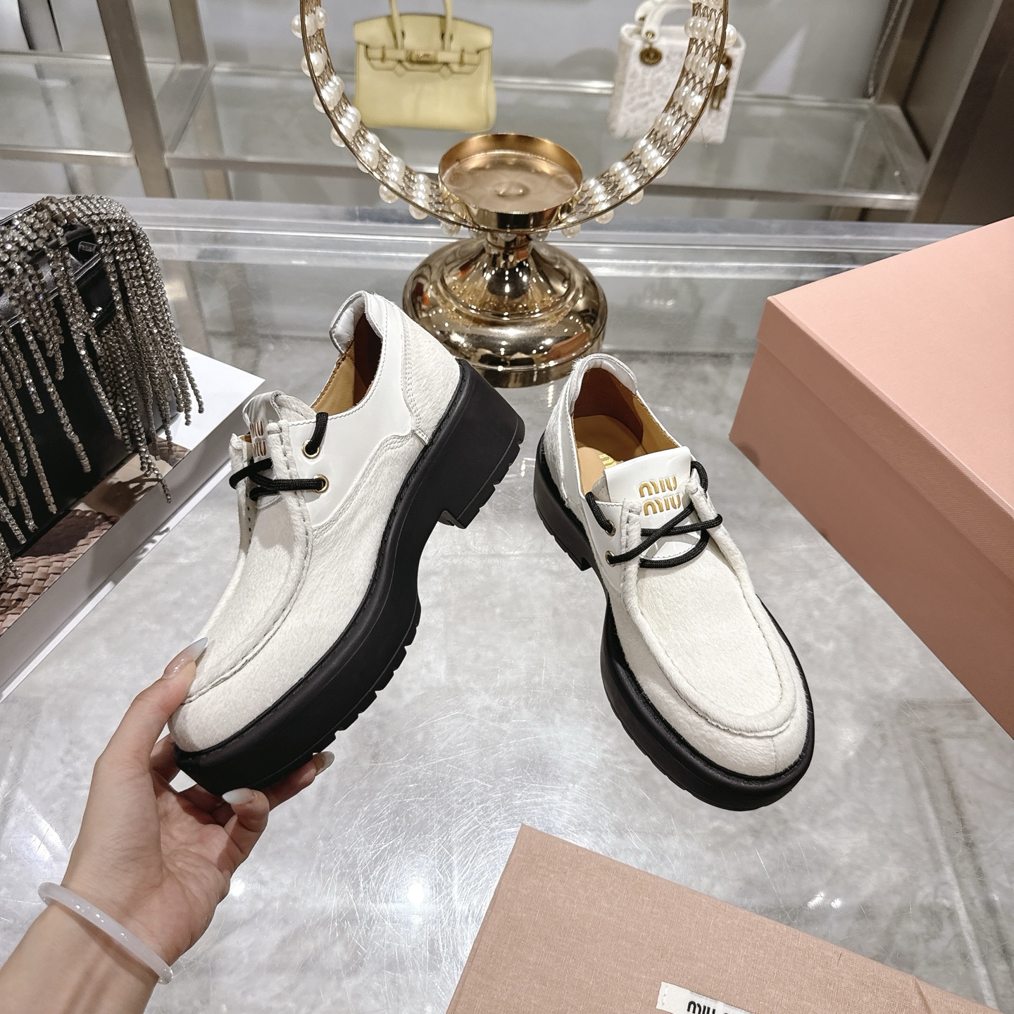 这款鞋子是AAAAA 1:1 质量 (非常棒). 使用了和原版一模一样的材料. 商标部分也保持了和缪缪/Miu Miu一样. 图片拍摄是实物鞋子拍摄, 您所收到的实物保证和我们图片一模一样.