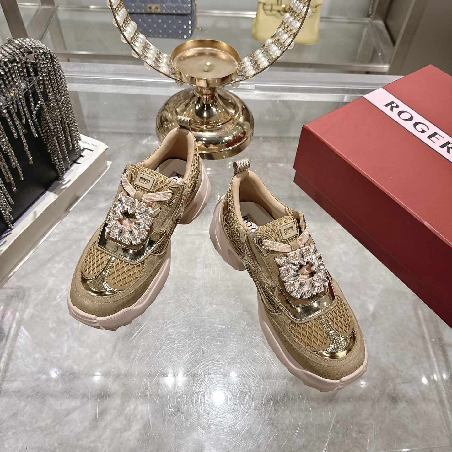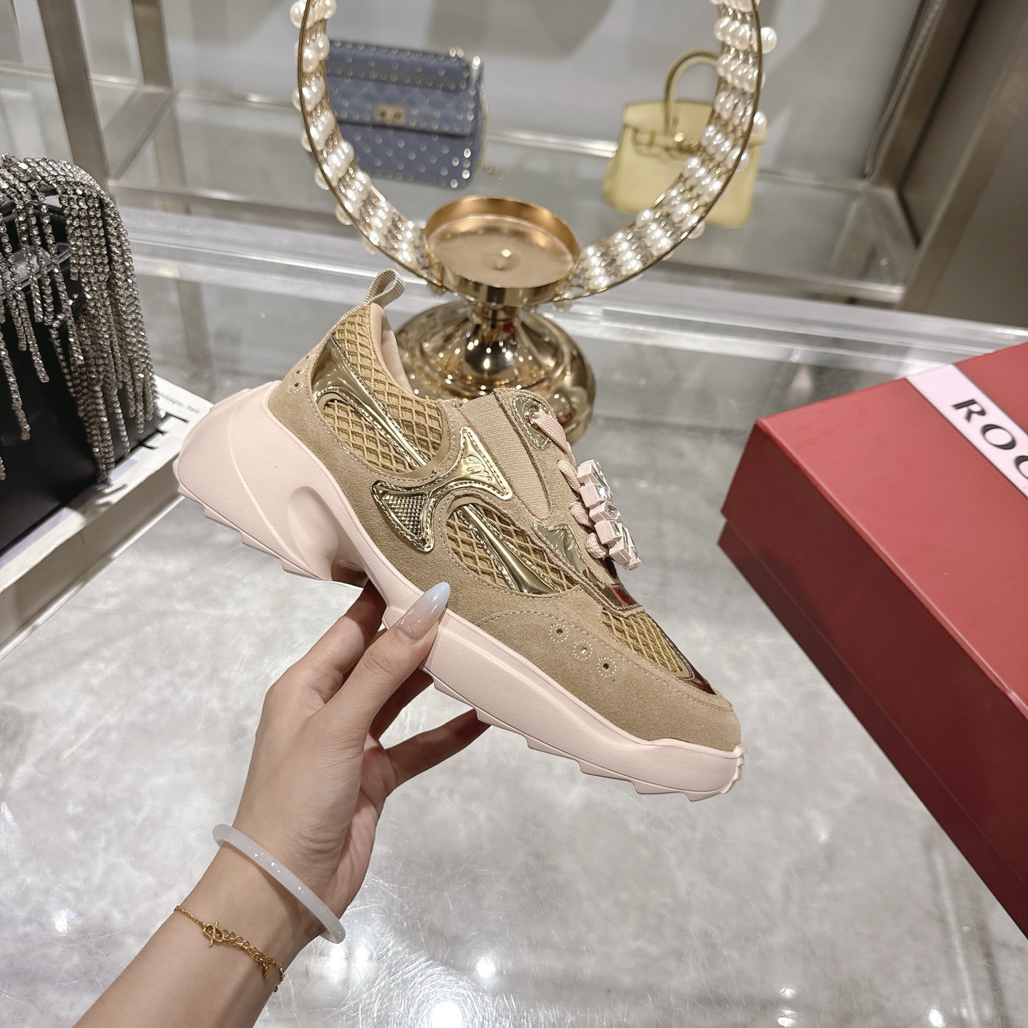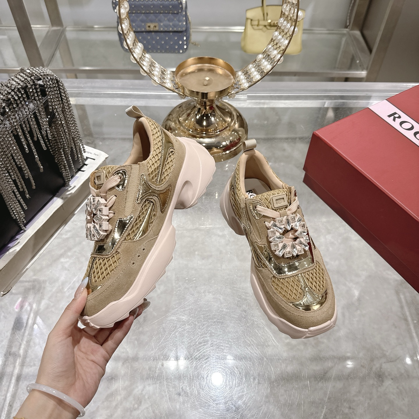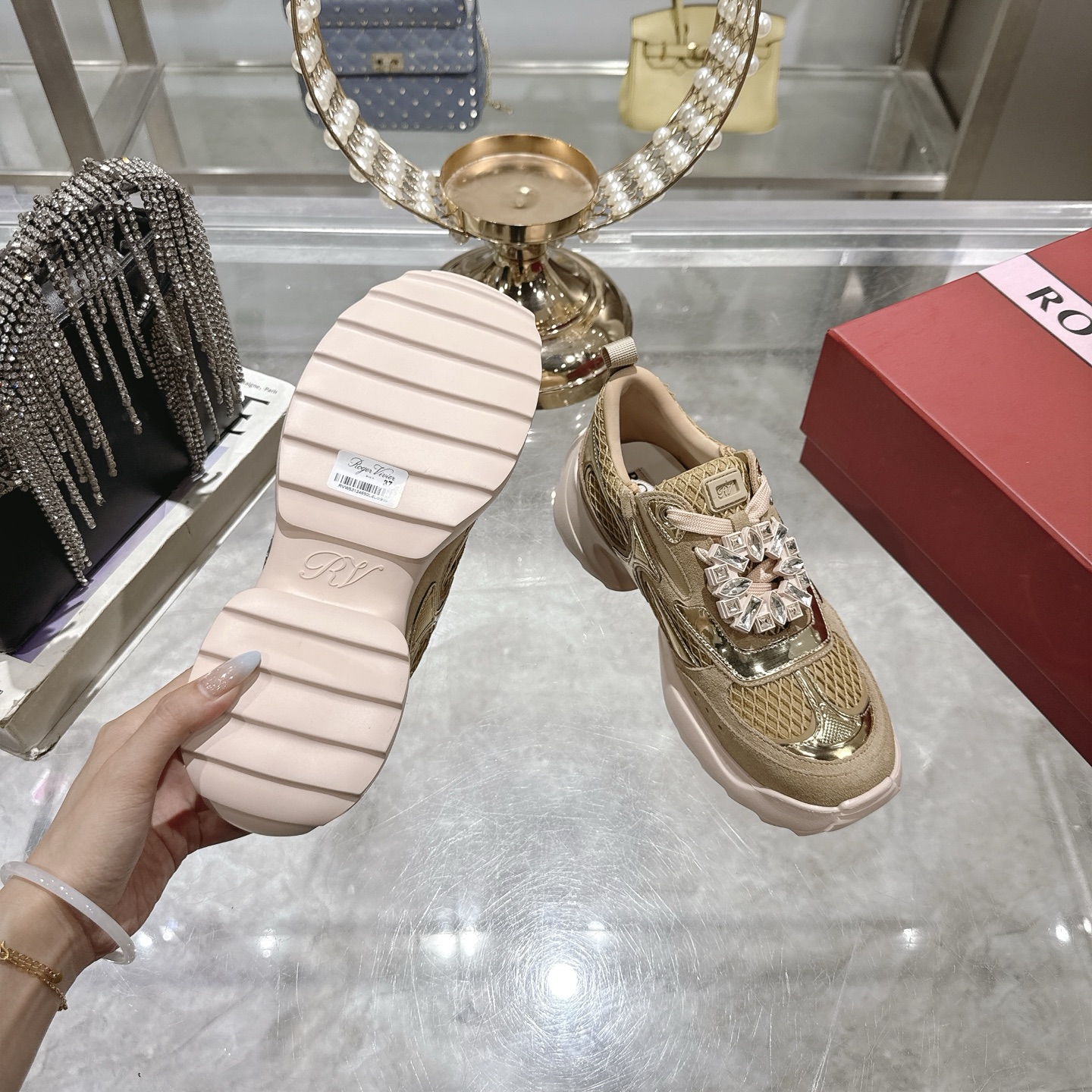 这款鞋子是AAAAA 1:1 质量 (非常棒). 使用了和原版一模一样的材料. 商标部分也保持了和罗杰维维耶/Roger Vivier一样. 图片拍摄是实物鞋子拍摄, 您所收到的实物保证和我们图片一模一样.