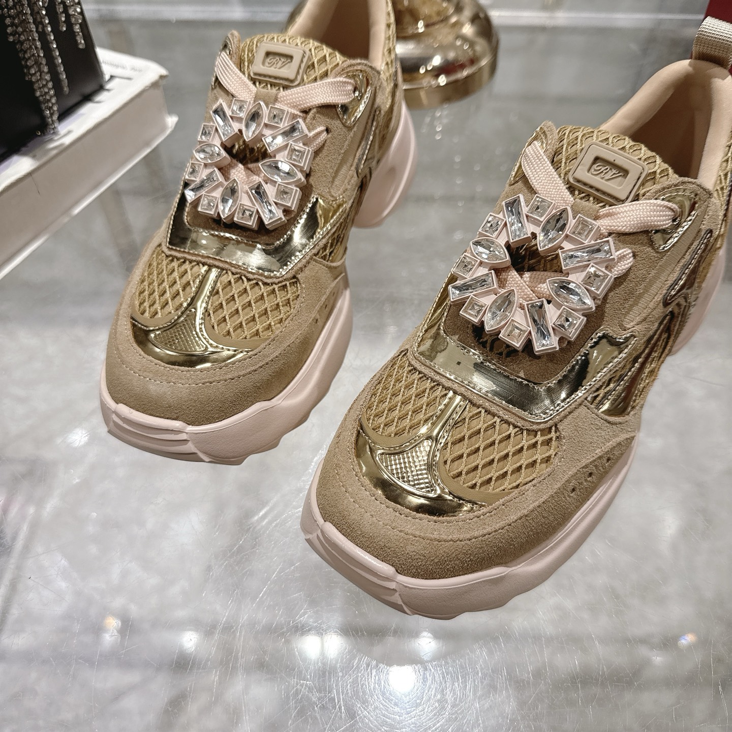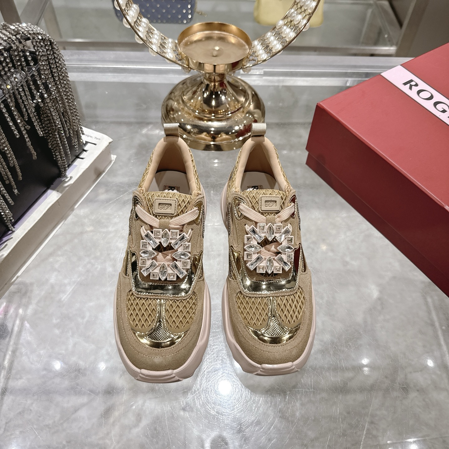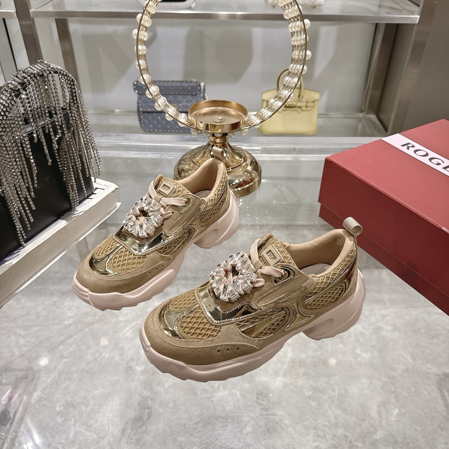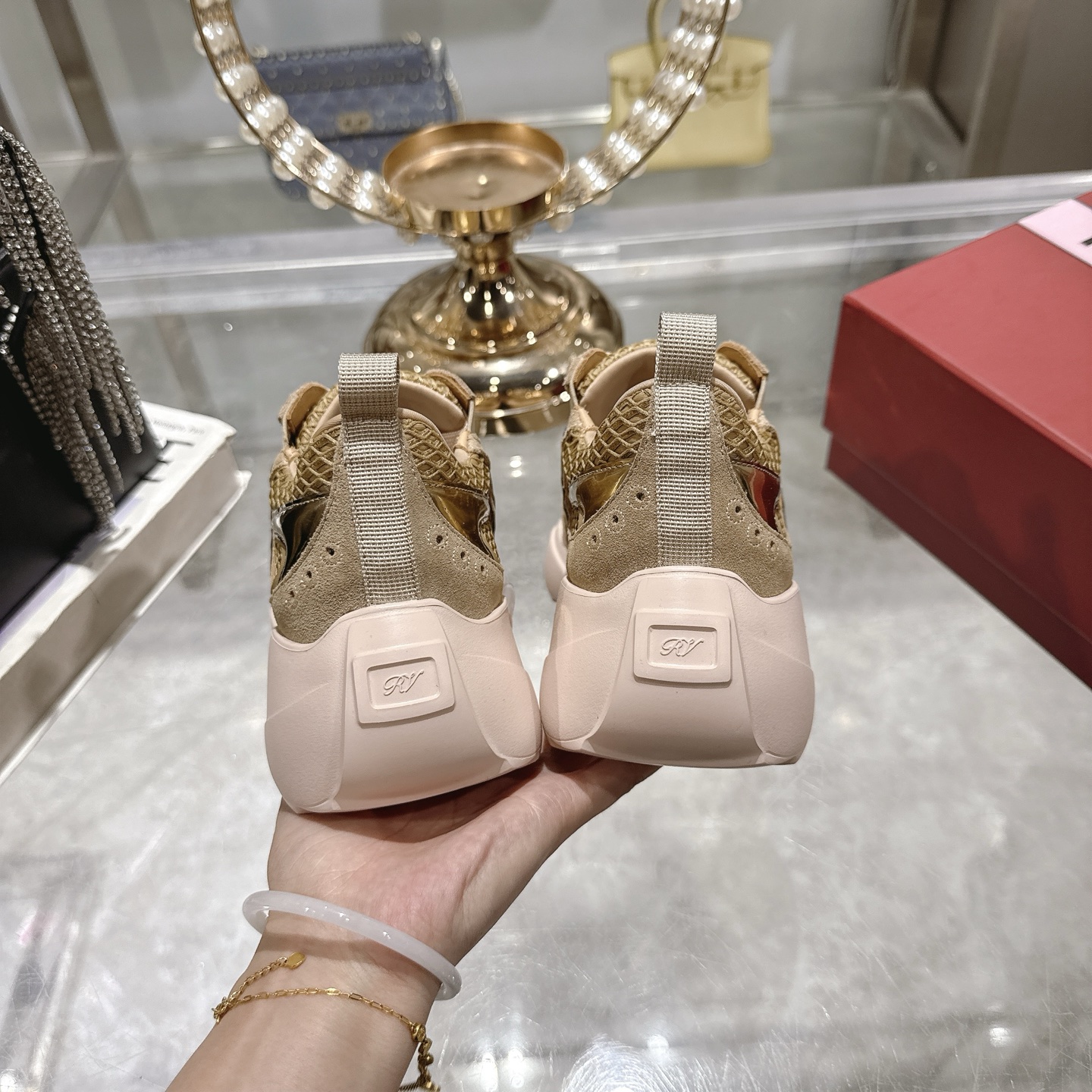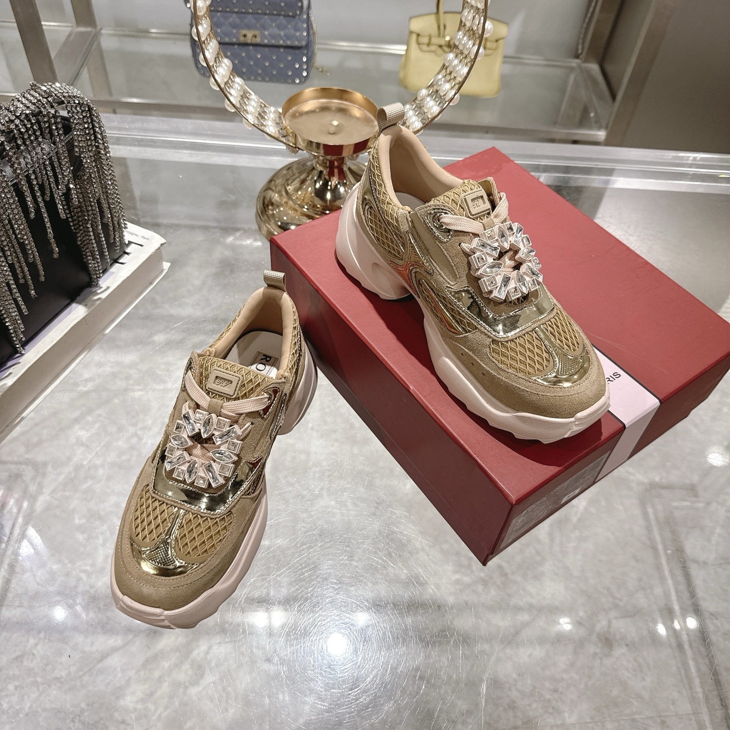 这款鞋子是AAAAA 1:1 质量 (非常棒). 使用了和原版一模一样的材料. 商标部分也保持了和罗杰维维耶/Roger Vivier一样. 图片拍摄是实物鞋子拍摄, 您所收到的实物保证和我们图片一模一样.