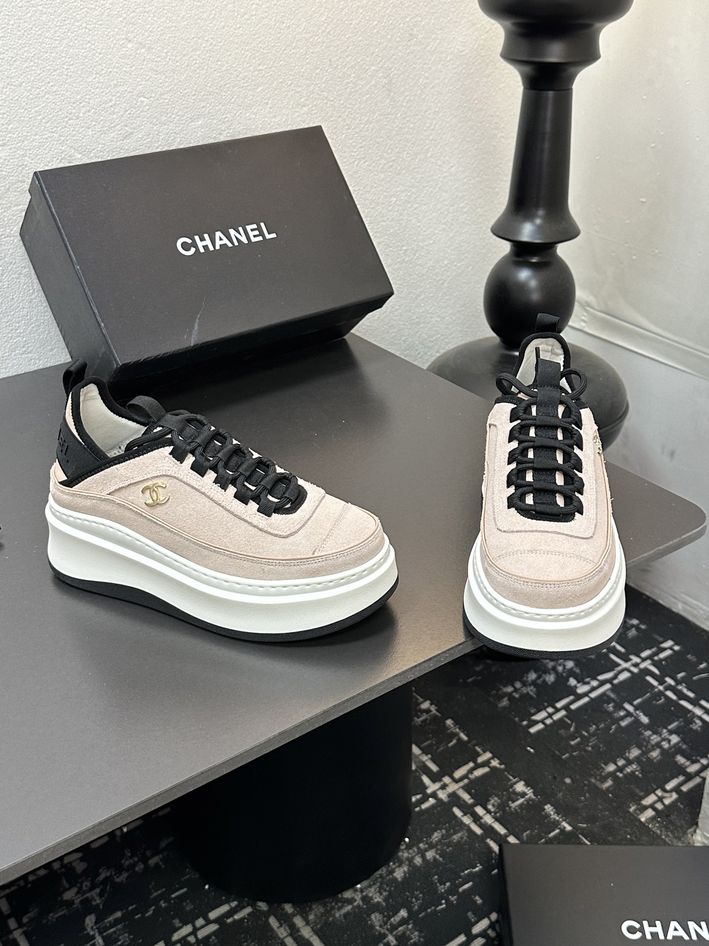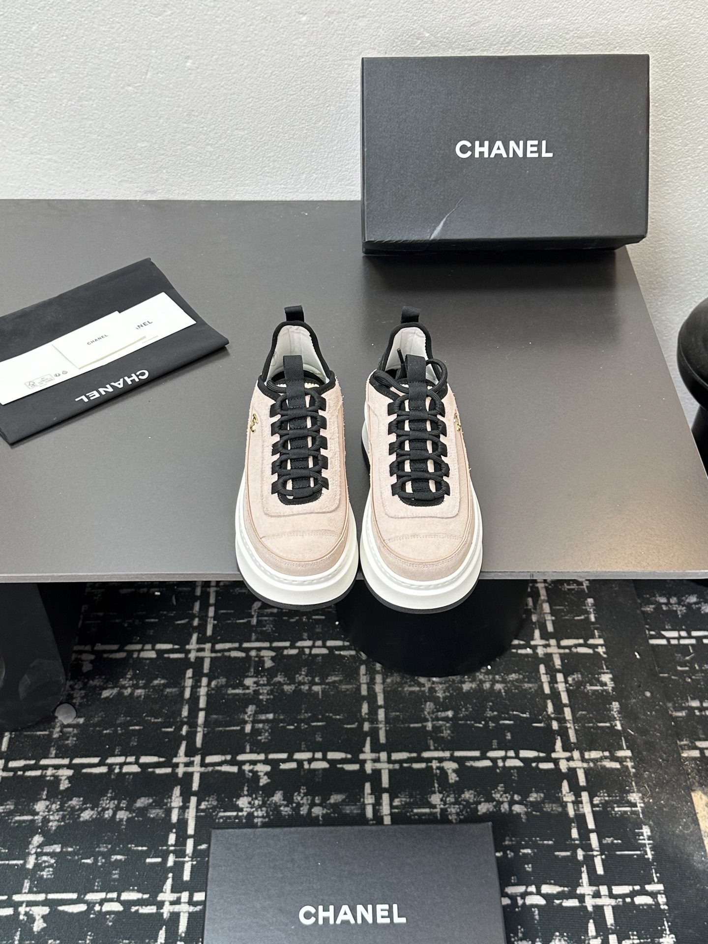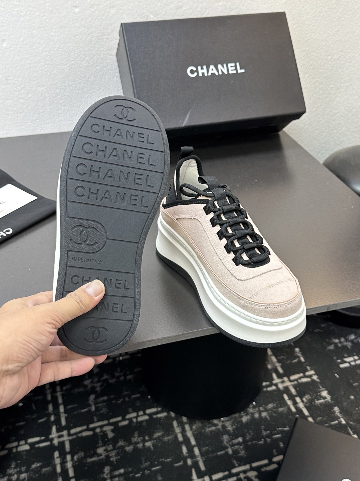 这款鞋子是AAAAA 1:1 质量 (非常棒). 使用了和原版一模一样的材料. 商标部分也保持了和香奈儿/Chanel一样. 图片拍摄是实物鞋子拍摄, 您所收到的实物保证和我们图片一模一样.