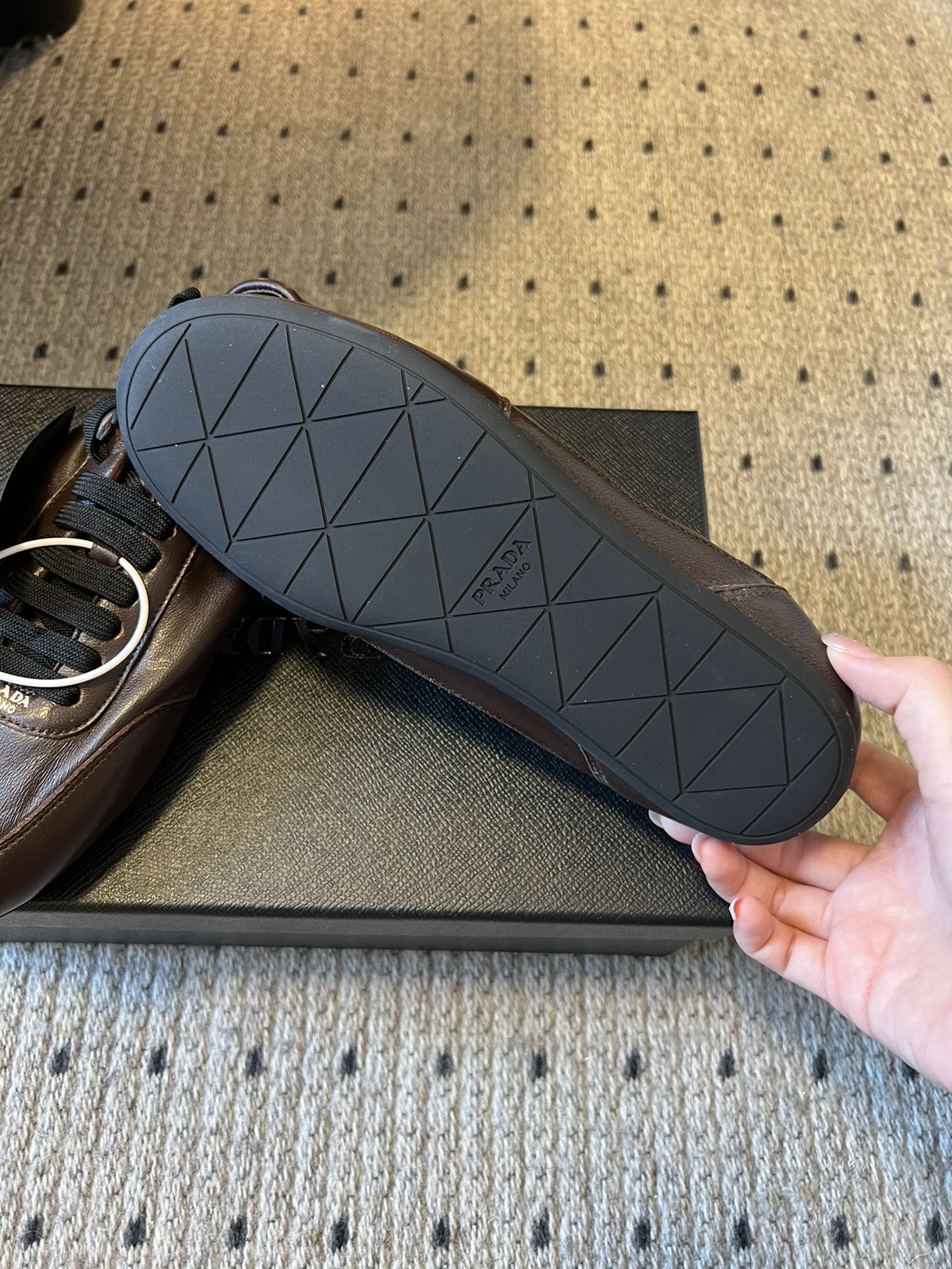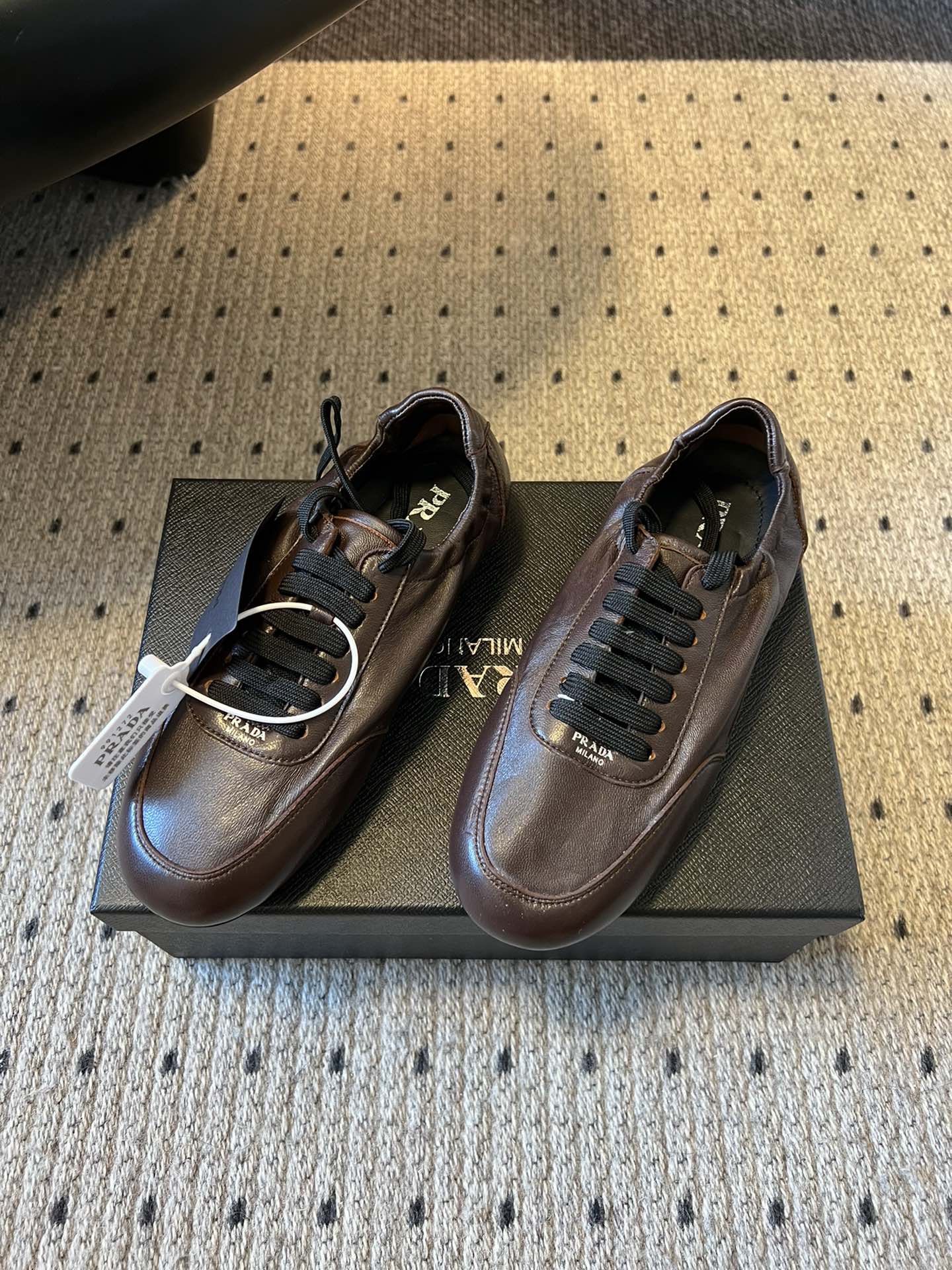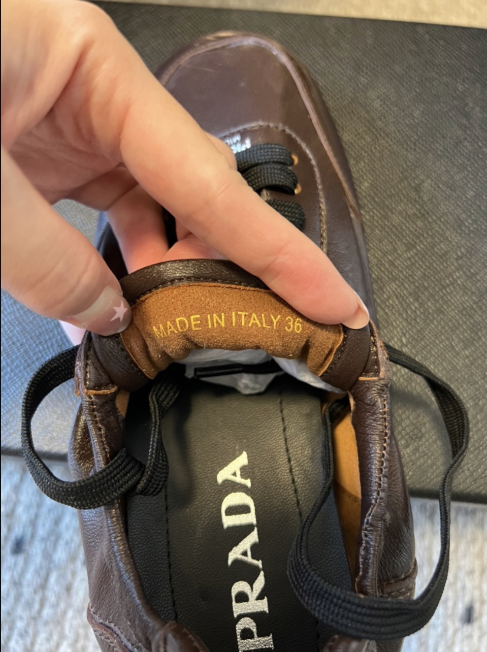 这款鞋子是AAAAA 1:1 质量 (非常棒). 使用了和原版一模一样的材料. 商标部分也保持了和普拉达/Prada一样. 图片拍摄是实物鞋子拍摄, 您所收到的实物保证和我们图片一模一样.