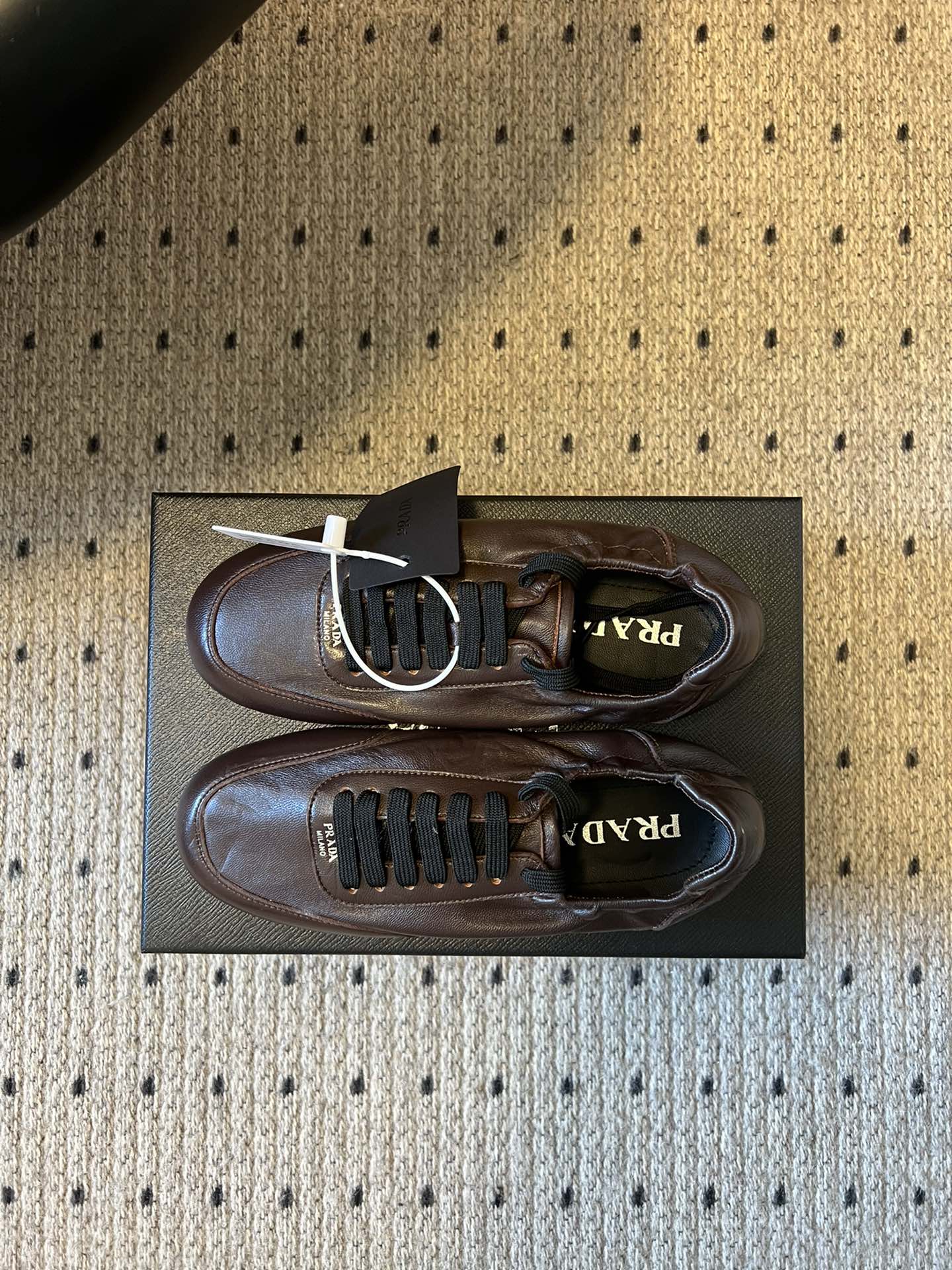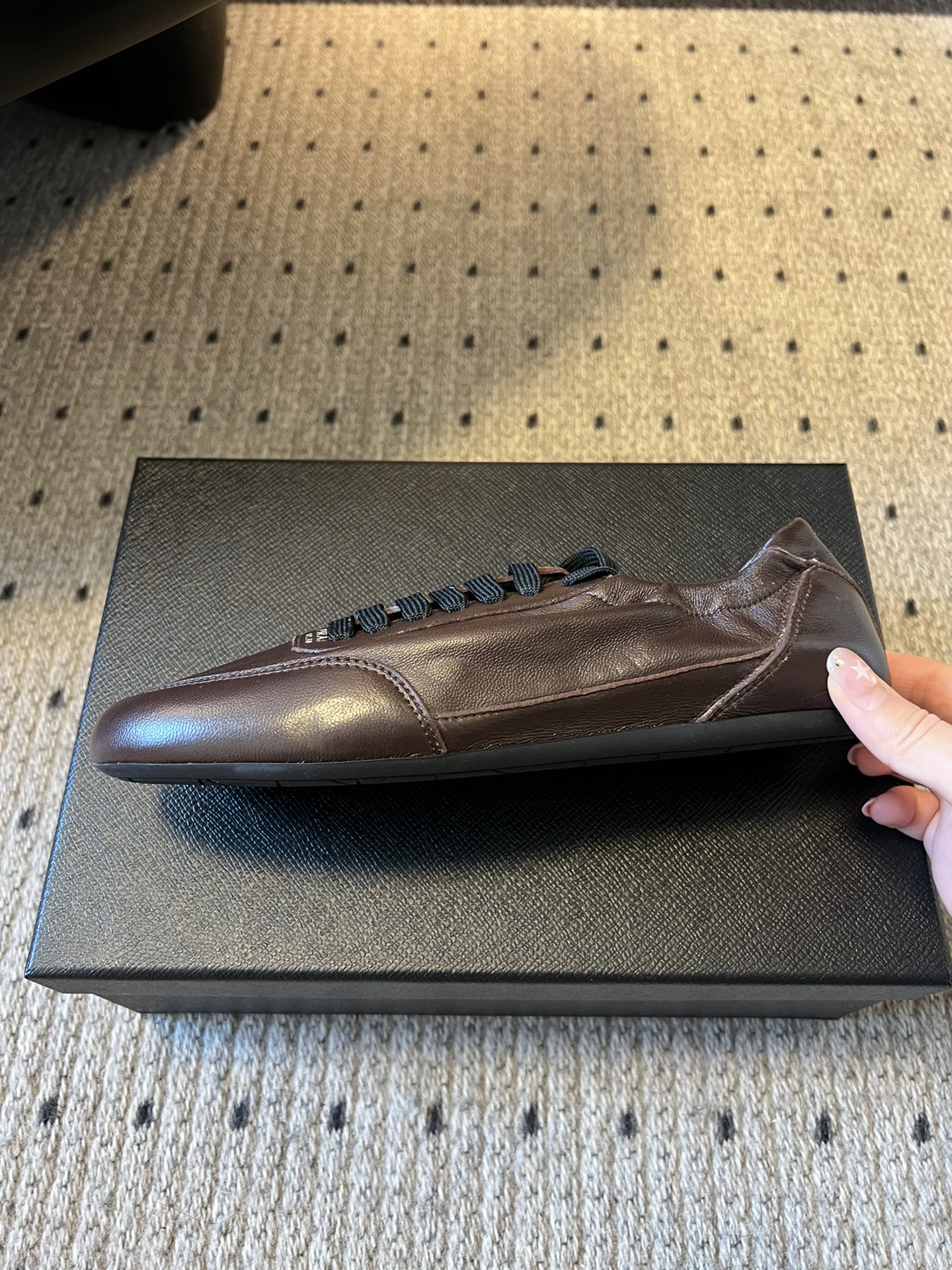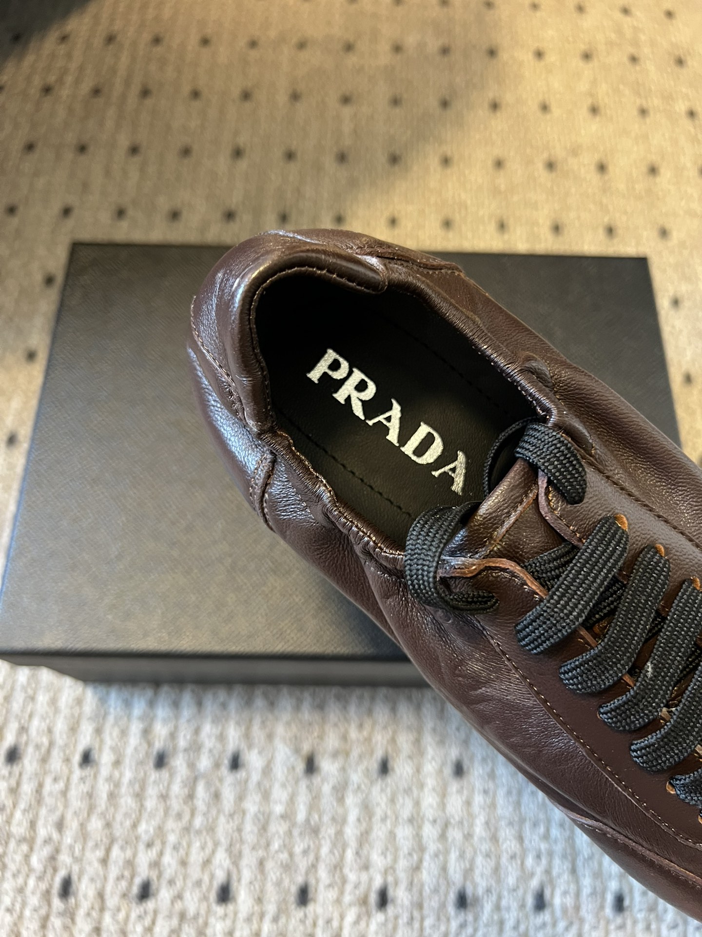 这款鞋子是AAAAA 1:1 质量 (非常棒). 使用了和原版一模一样的材料. 商标部分也保持了和普拉达/Prada一样. 图片拍摄是实物鞋子拍摄, 您所收到的实物保证和我们图片一模一样.