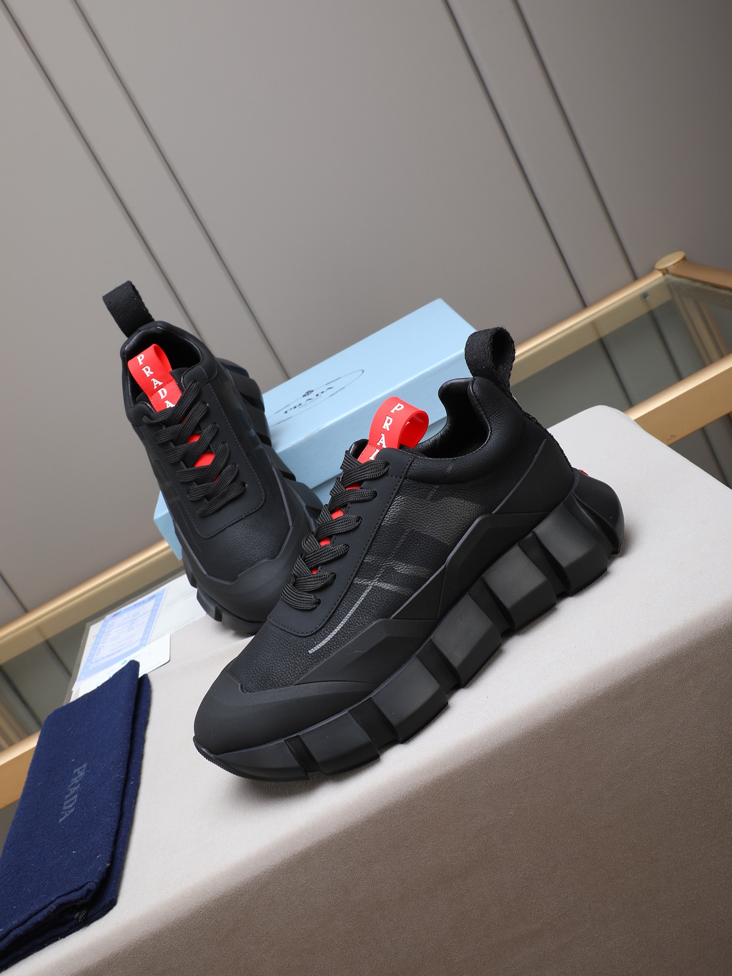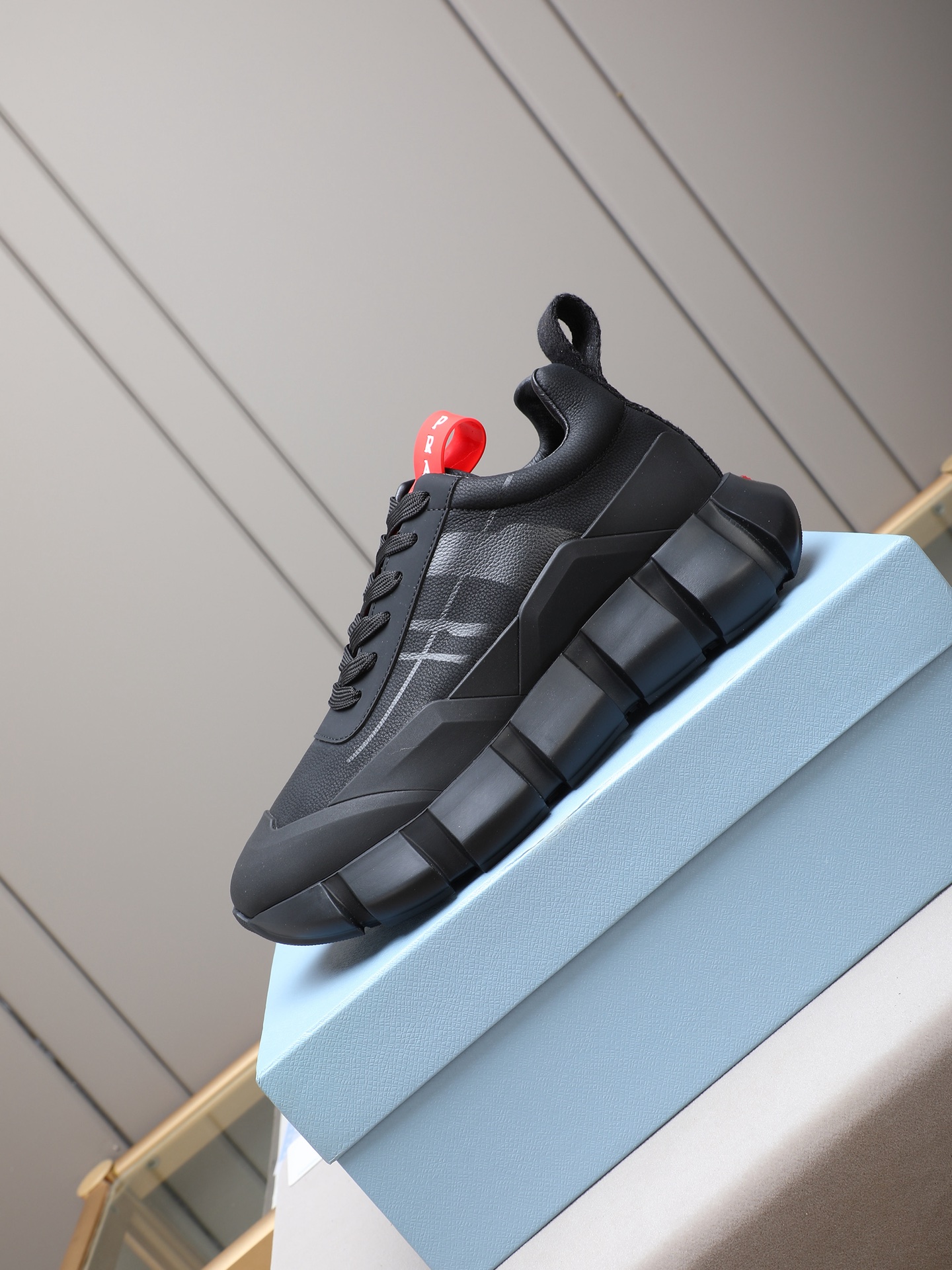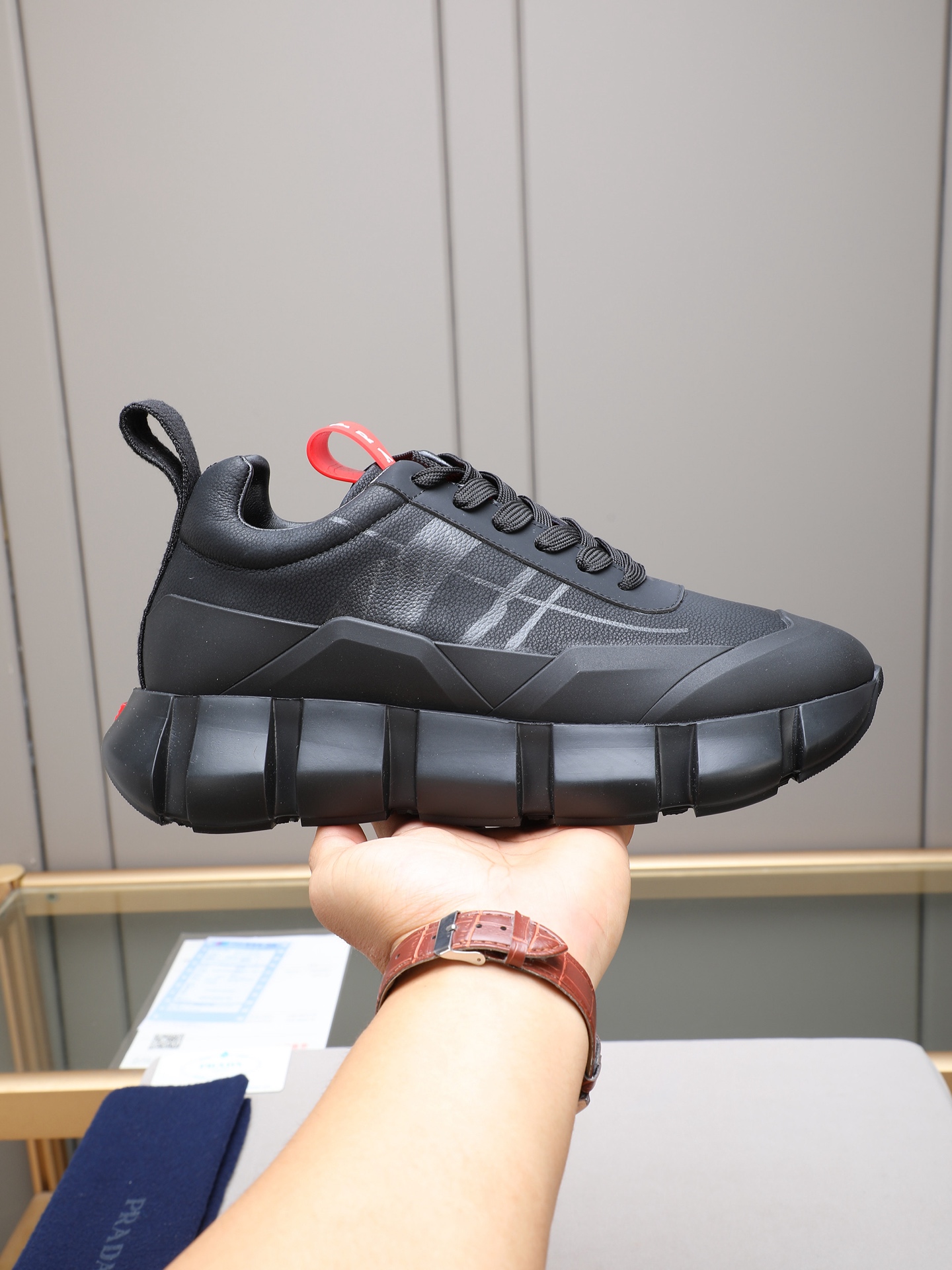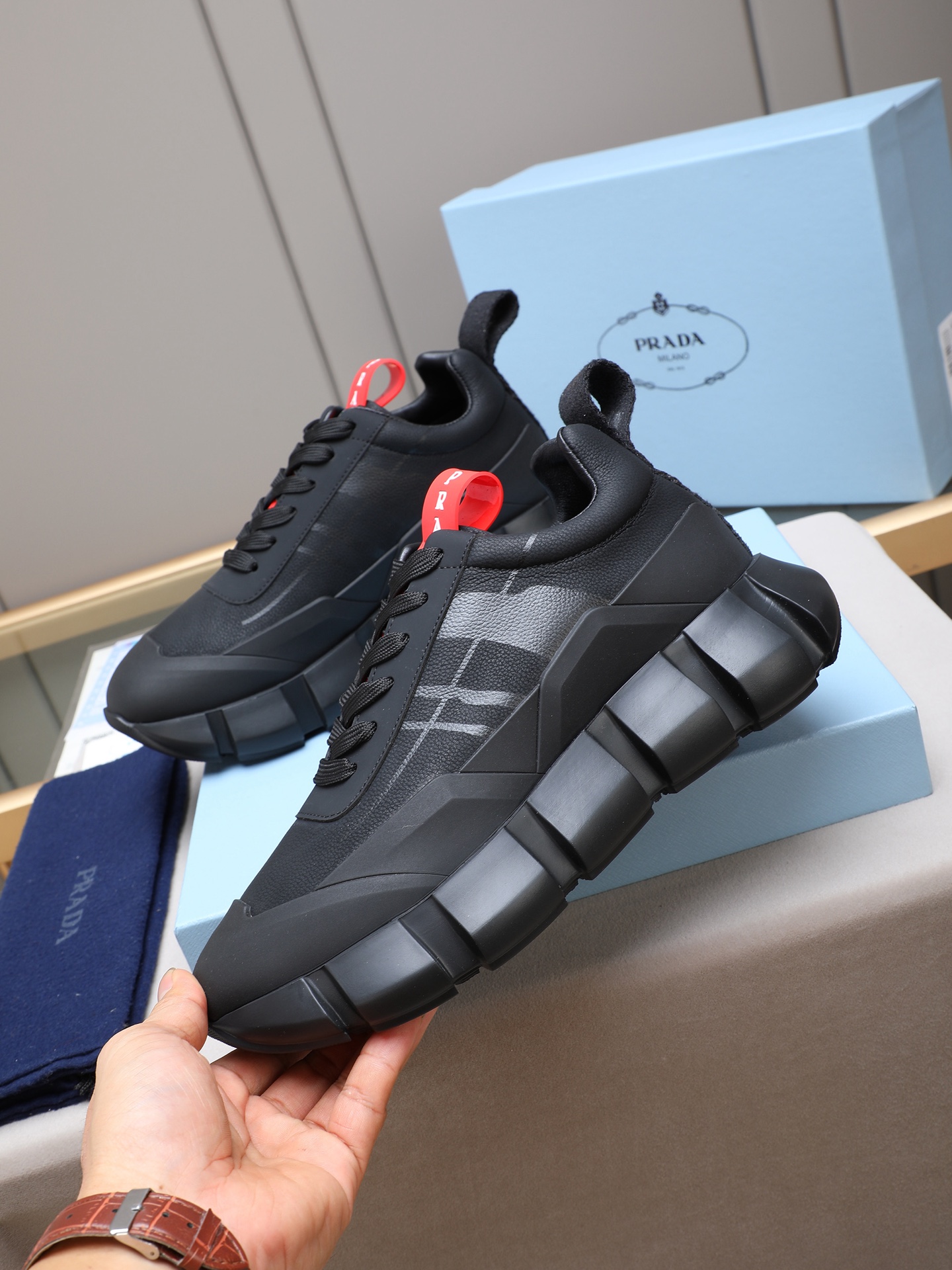 这款鞋子是AAAAA 1:1 质量 (非常棒). 使用了和原版一模一样的材料. 商标部分也保持了和普拉达/Prada一样. 图片拍摄是实物鞋子拍摄, 您所收到的实物保证和我们图片一模一样.