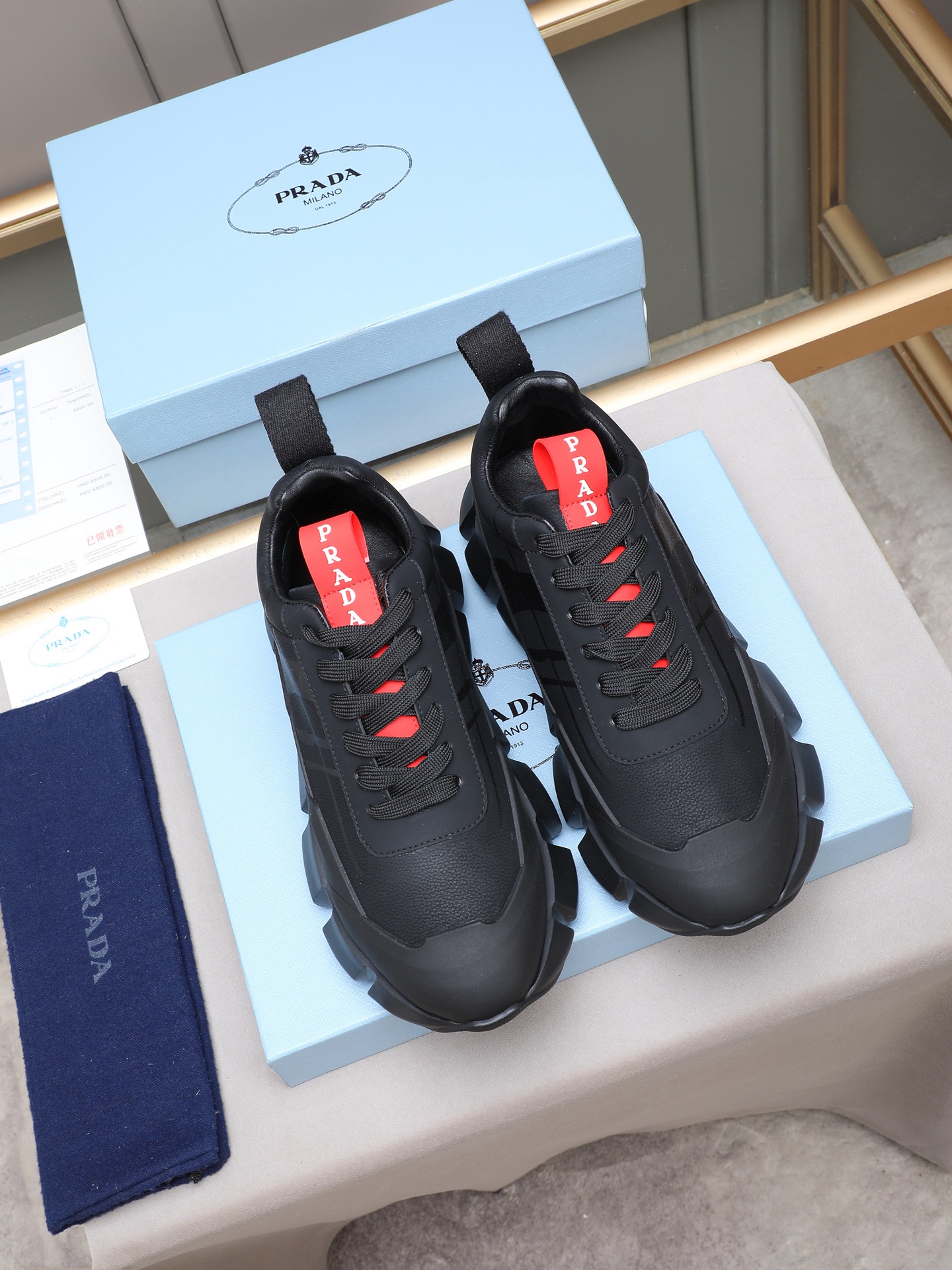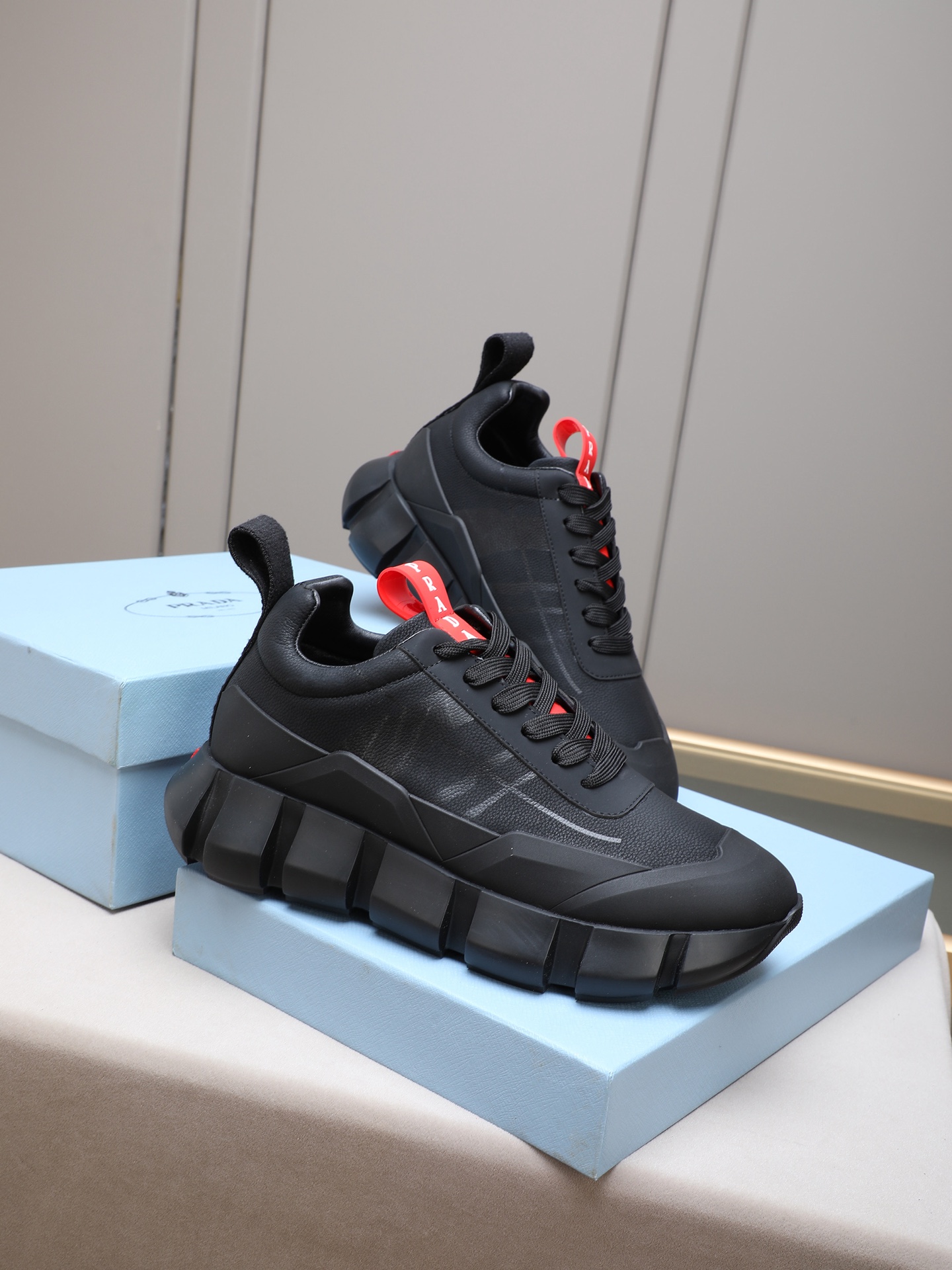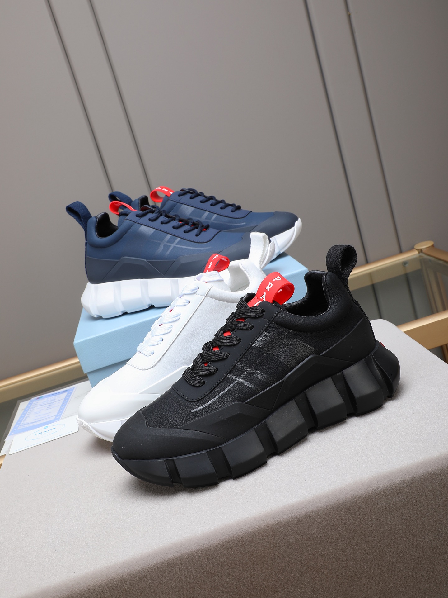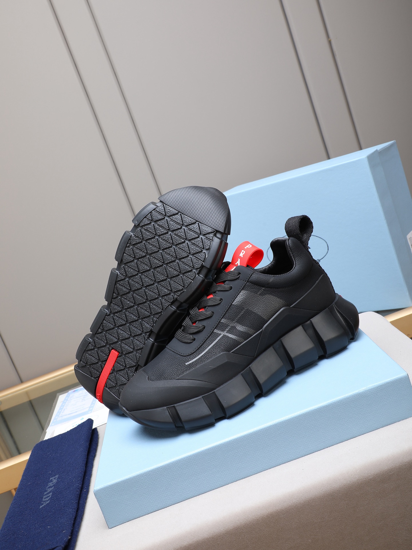 这款鞋子是AAAAA 1:1 质量 (非常棒). 使用了和原版一模一样的材料. 商标部分也保持了和普拉达/Prada一样. 图片拍摄是实物鞋子拍摄, 您所收到的实物保证和我们图片一模一样.