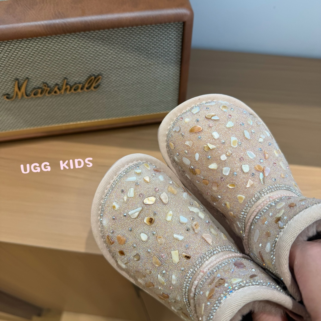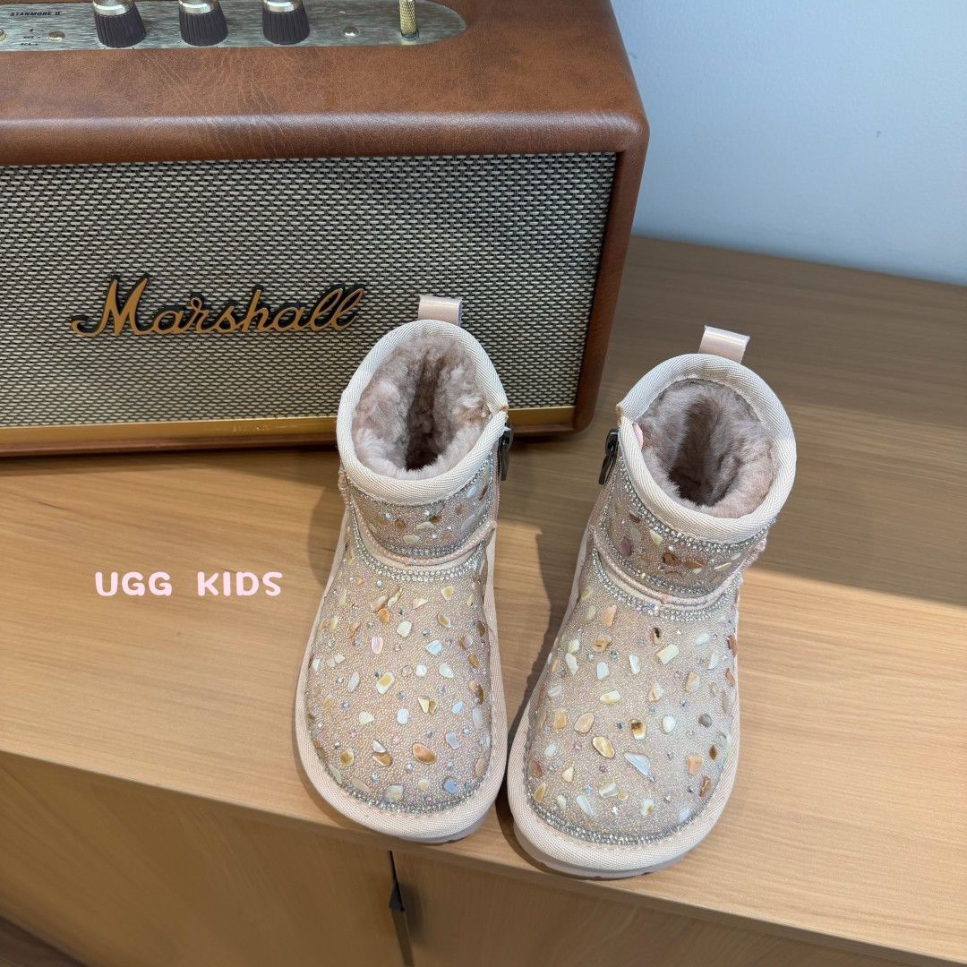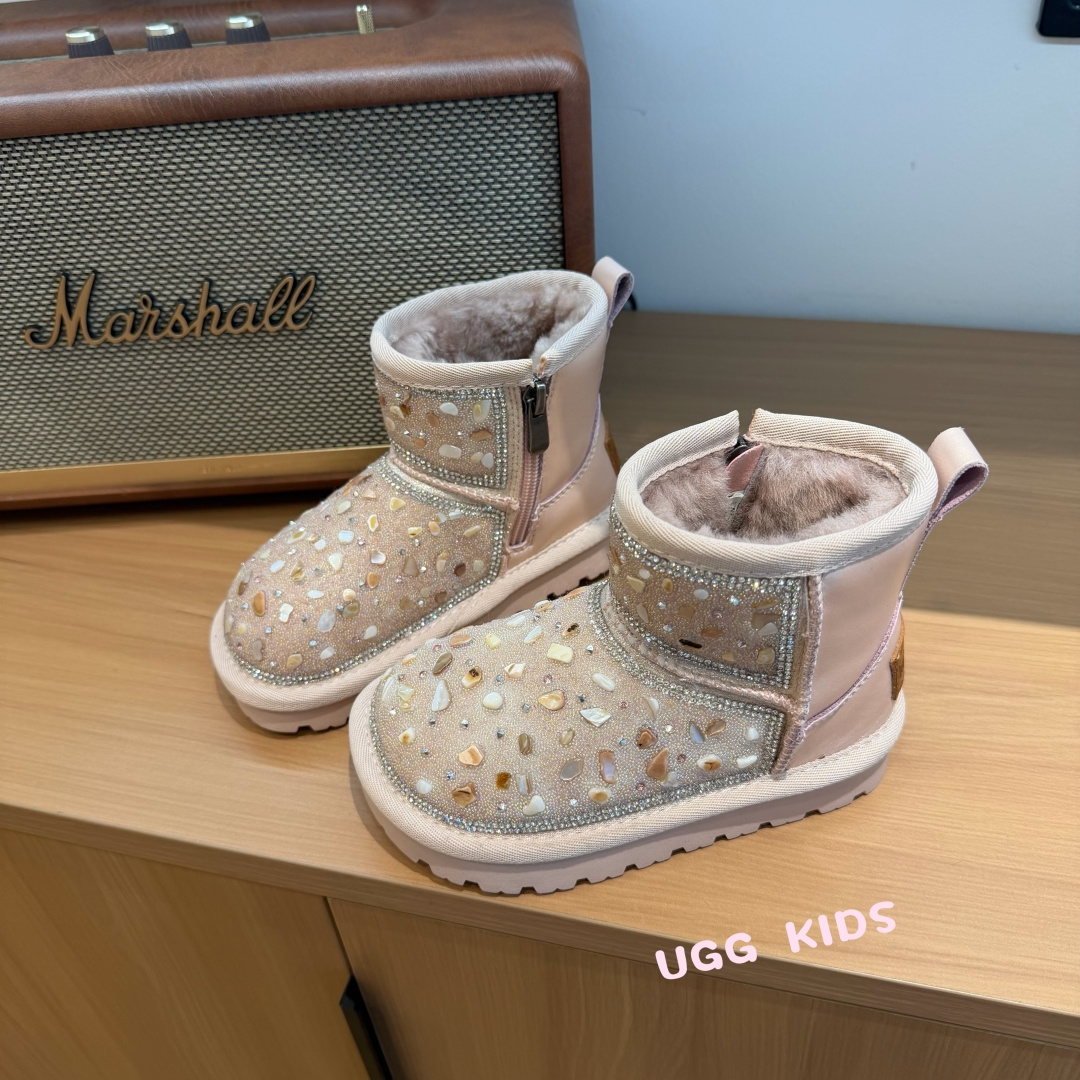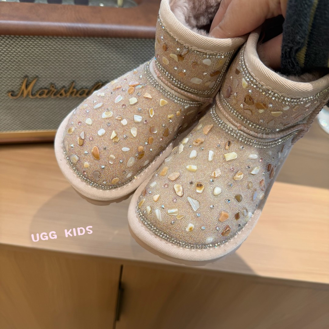 这款兒童鞋是AAAAA 1:1 质量 (非常棒). 使用了和原版一模一样的材料. 商标部分也保持了和UGG雪地靴一样. 图片拍摄是实物兒童鞋拍摄, 您所收到的实物保证和我们图片一模一样.