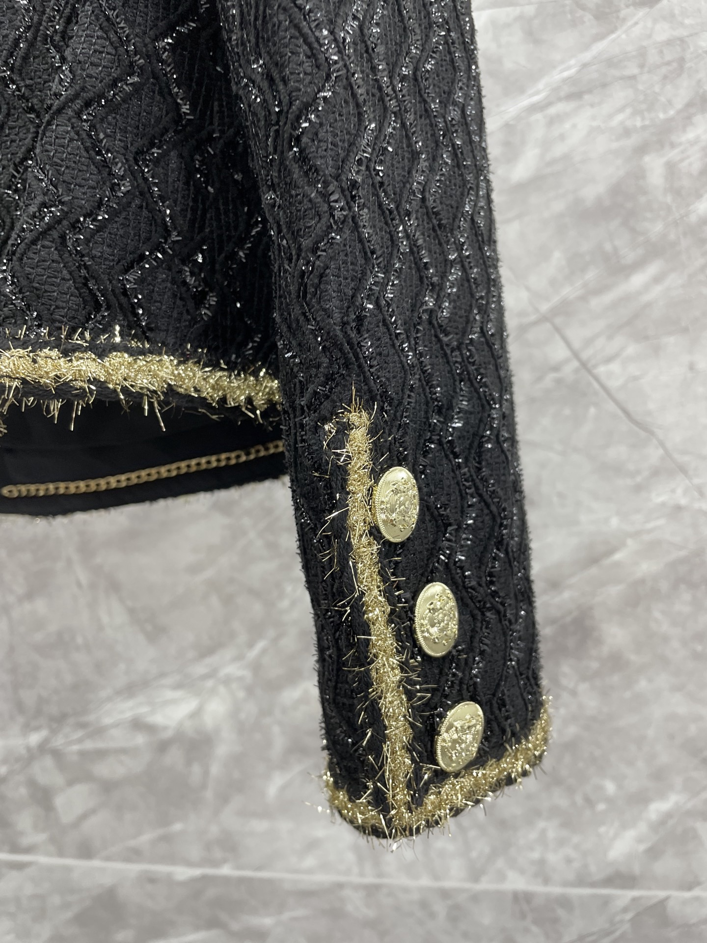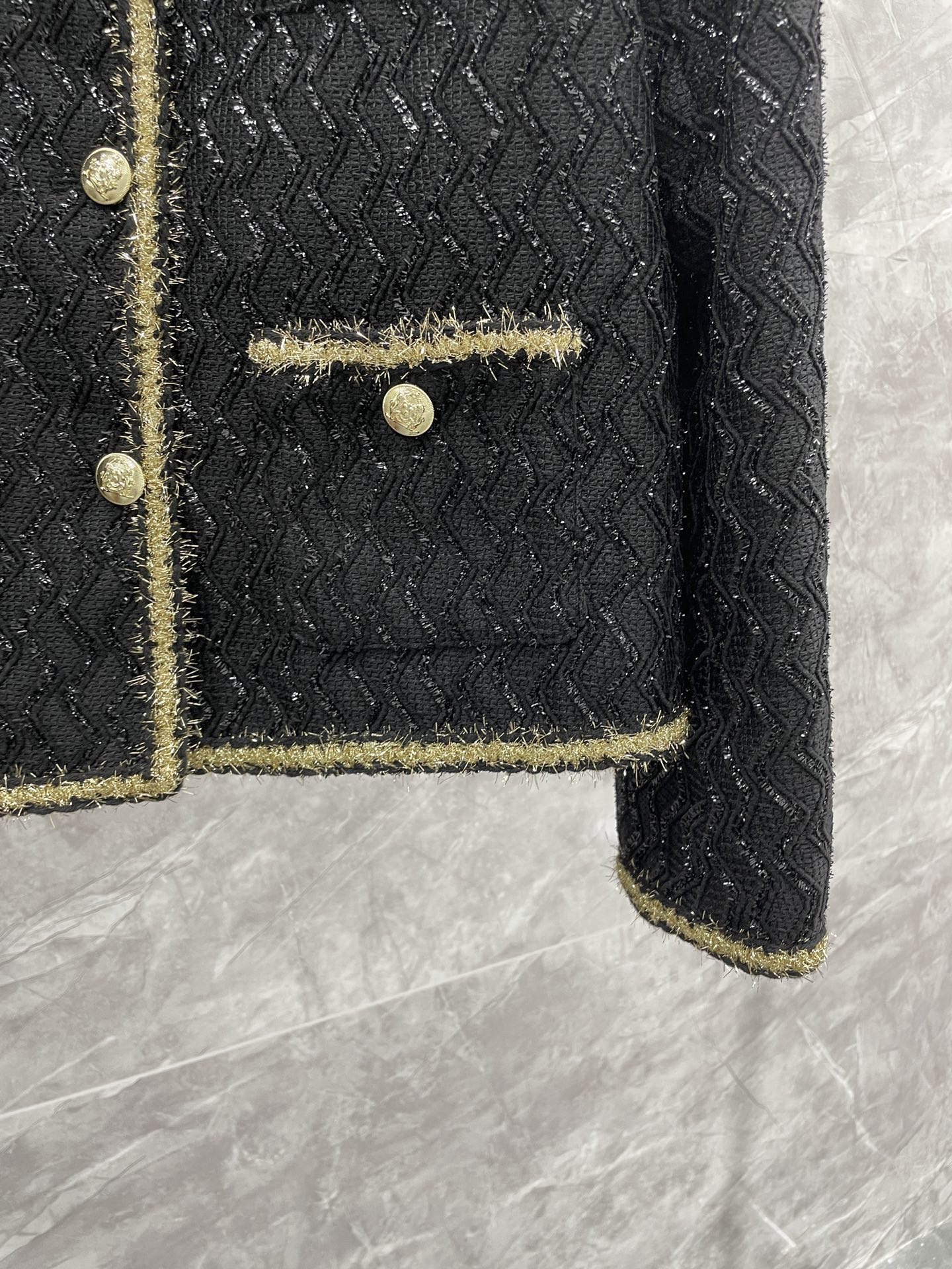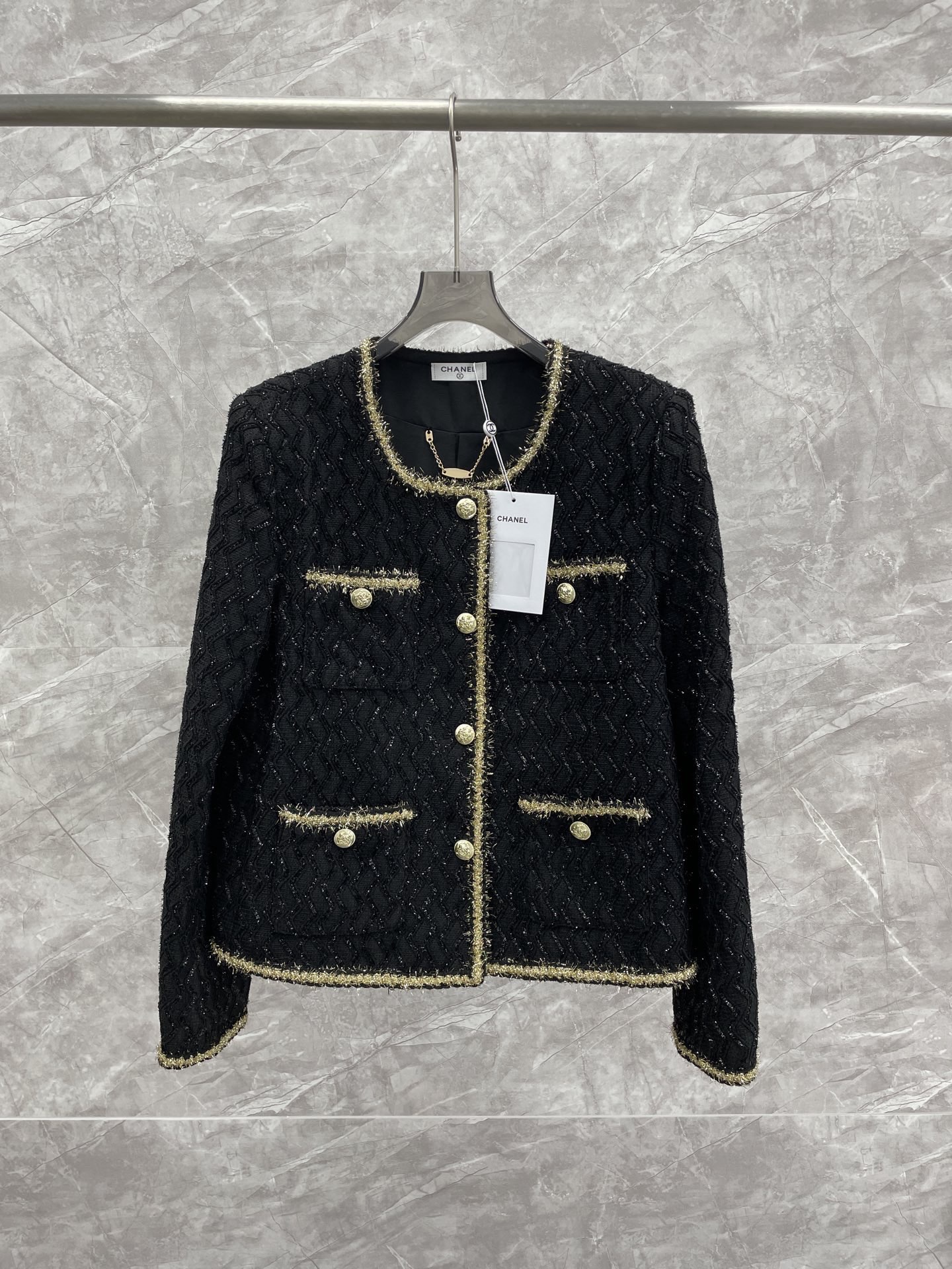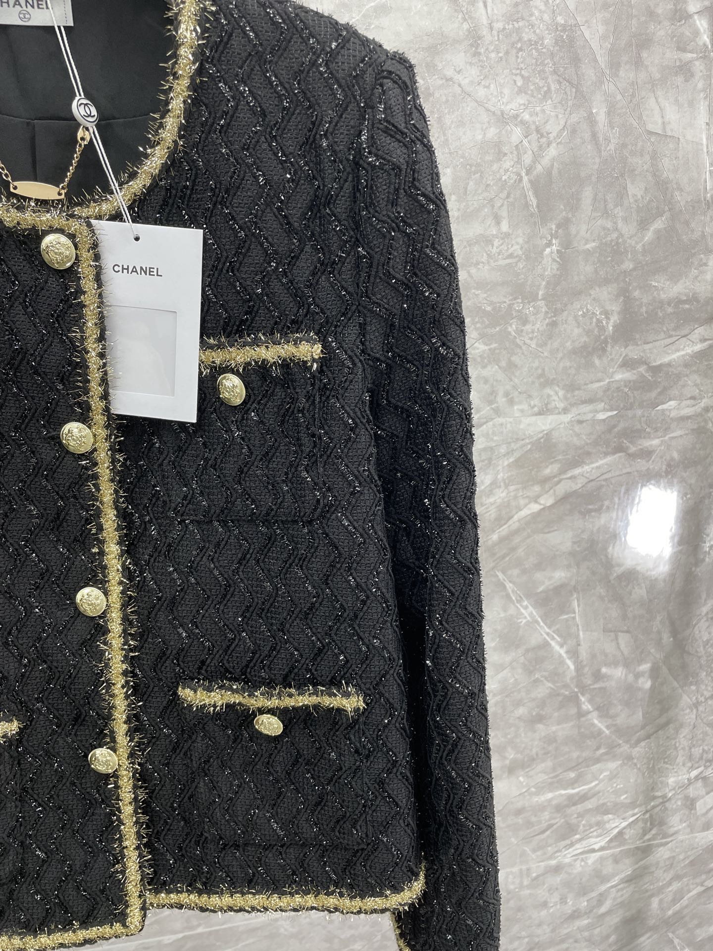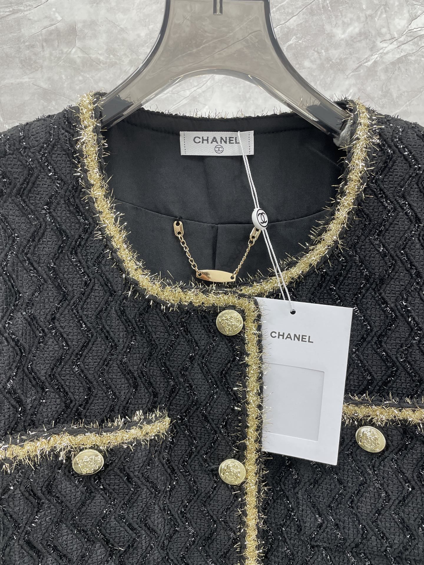 这款衣服是AAAAA 1:1 质量 (非常棒). 使用了和原版一模一样的材料. 商标部分也保持了和香奈儿/Chanel一样. 图片拍摄是实物衣服拍摄, 您所收到的实物保证和我们图片一模一样.