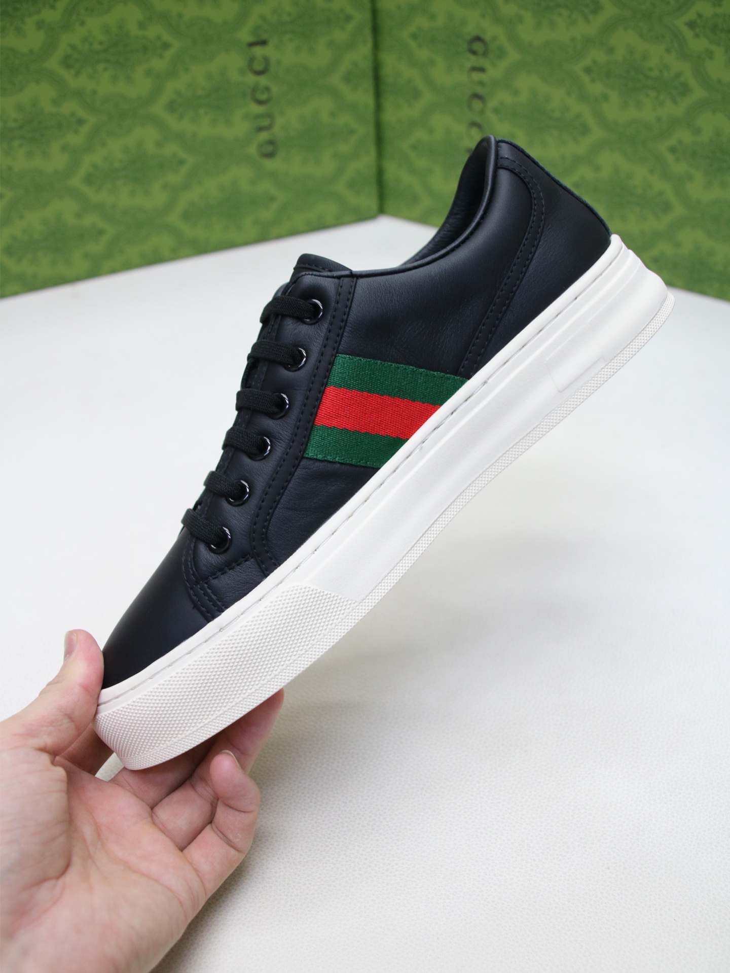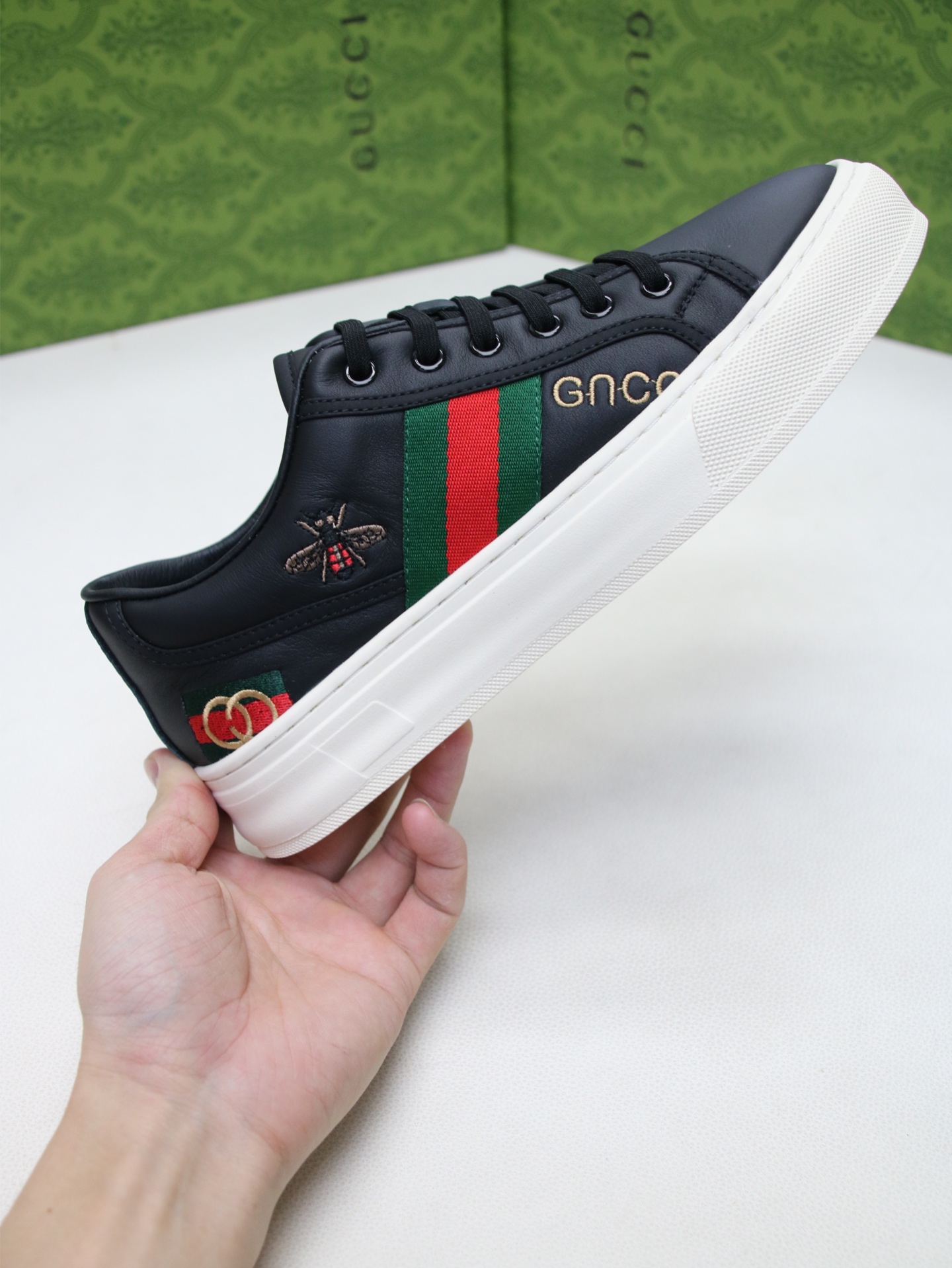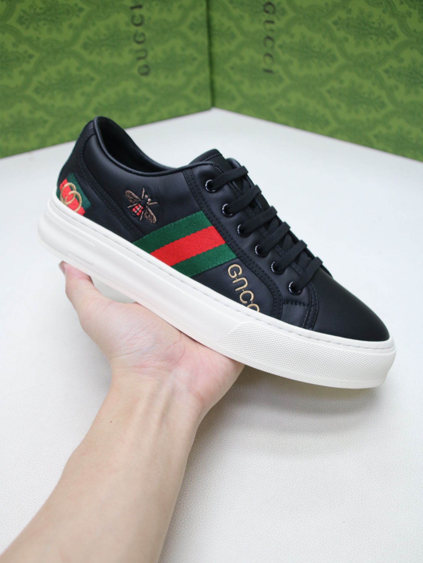 这款鞋子是AAAAA 1:1 质量 (非常棒). 使用了和原版一模一样的材料. 商标部分也保持了和古奇/Gucci一样. 图片拍摄是实物鞋子拍摄, 您所收到的实物保证和我们图片一模一样.