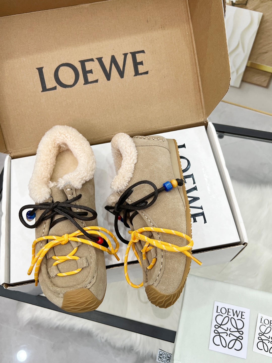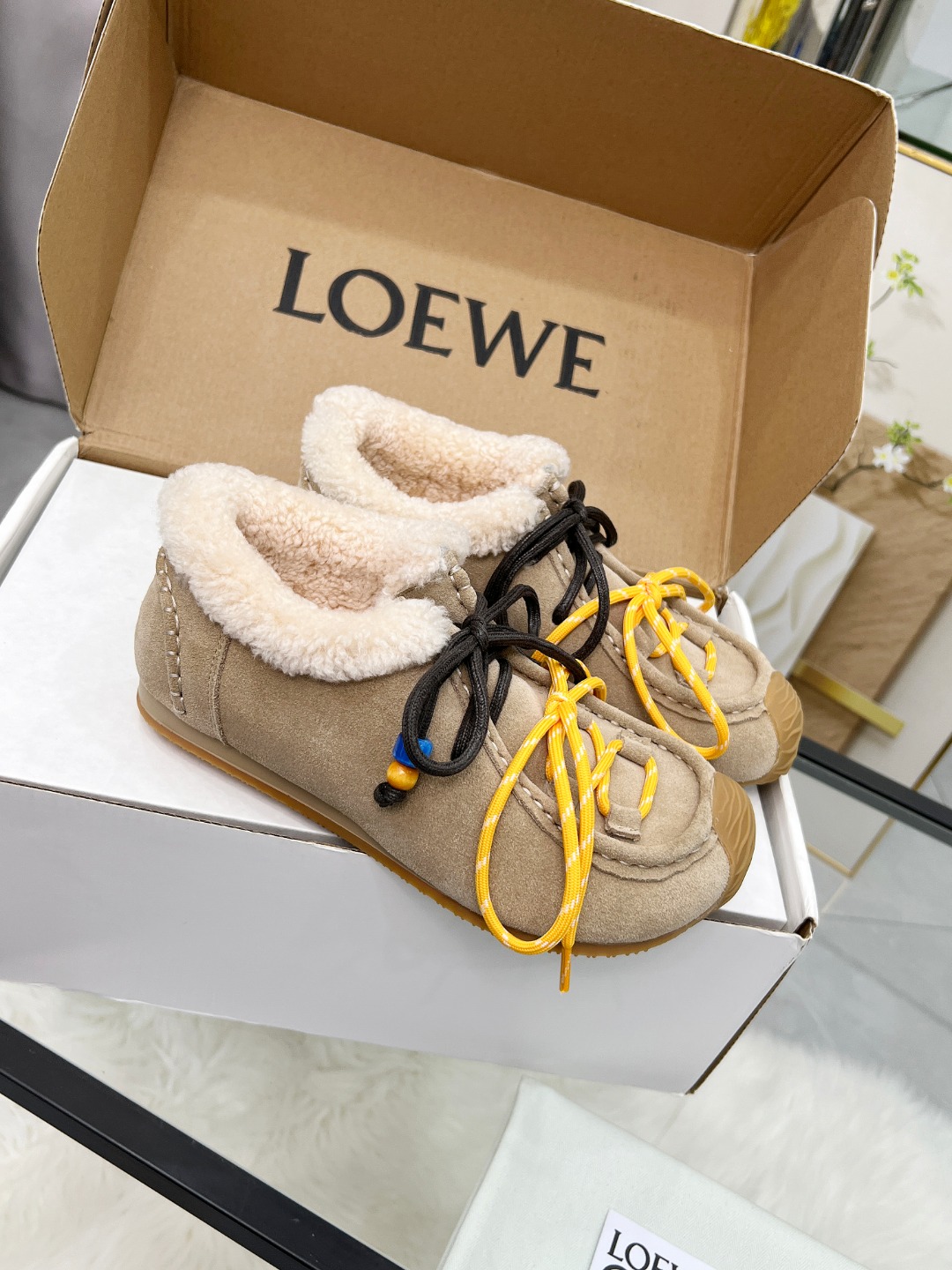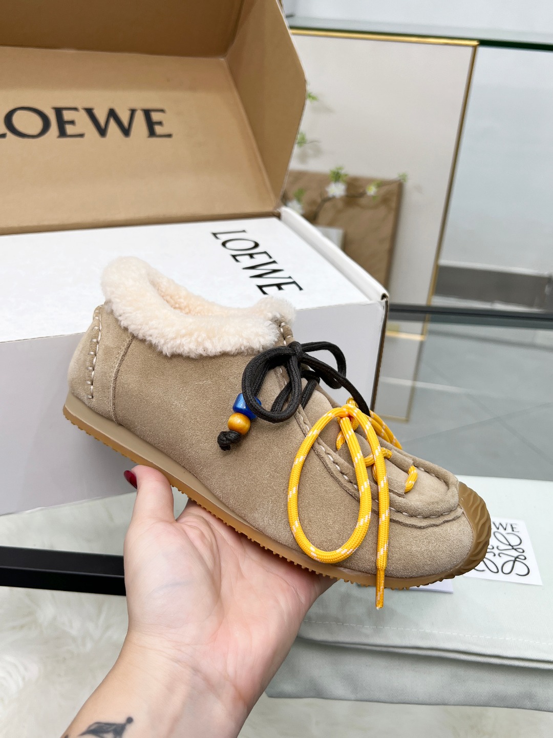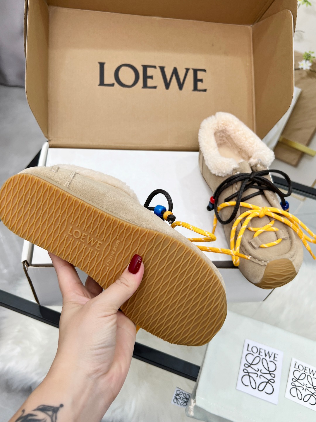 这款鞋子是AAAAA 1:1 质量 (非常棒). 使用了和原版一模一样的材料. 商标部分也保持了和罗意威/Loewe一样. 图片拍摄是实物鞋子拍摄, 您所收到的实物保证和我们图片一模一样.