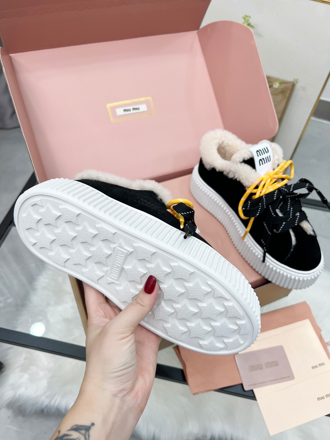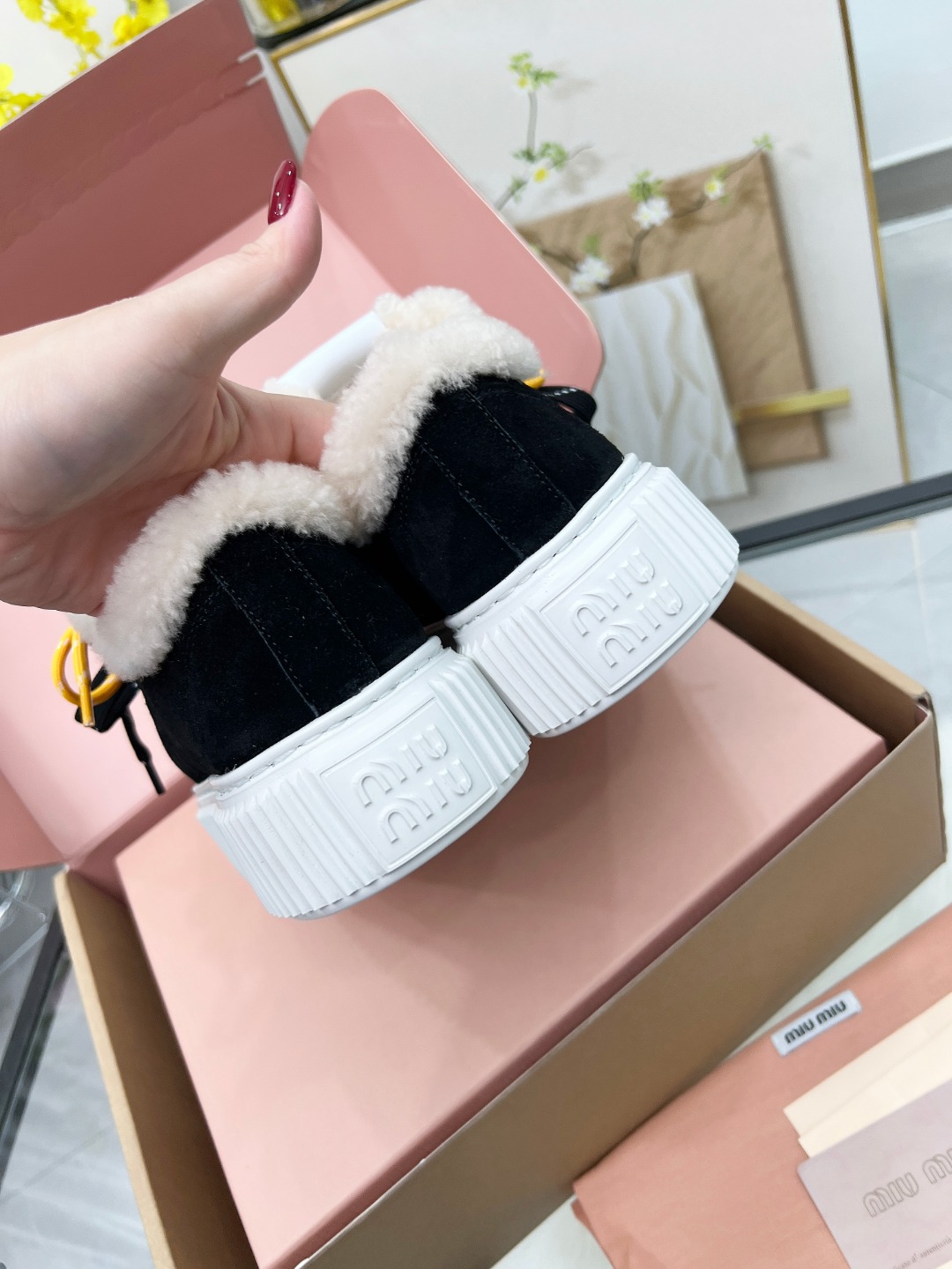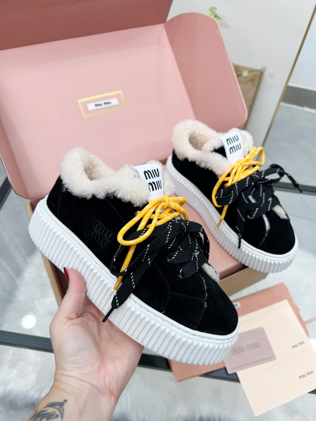 这款鞋子是AAAAA 1:1 质量 (非常棒). 使用了和原版一模一样的材料. 商标部分也保持了和缪缪/Miu Miu一样. 图片拍摄是实物鞋子拍摄, 您所收到的实物保证和我们图片一模一样.