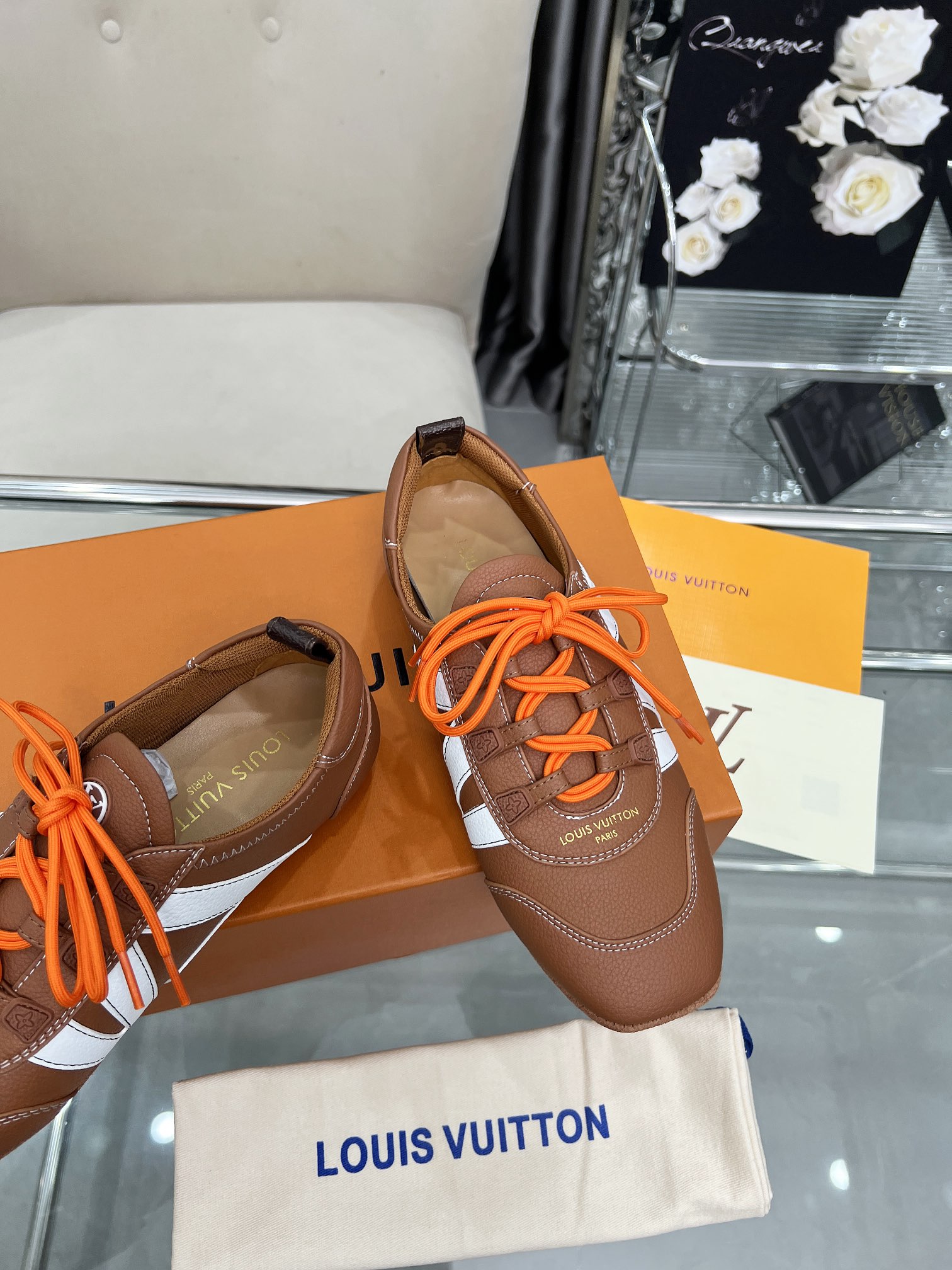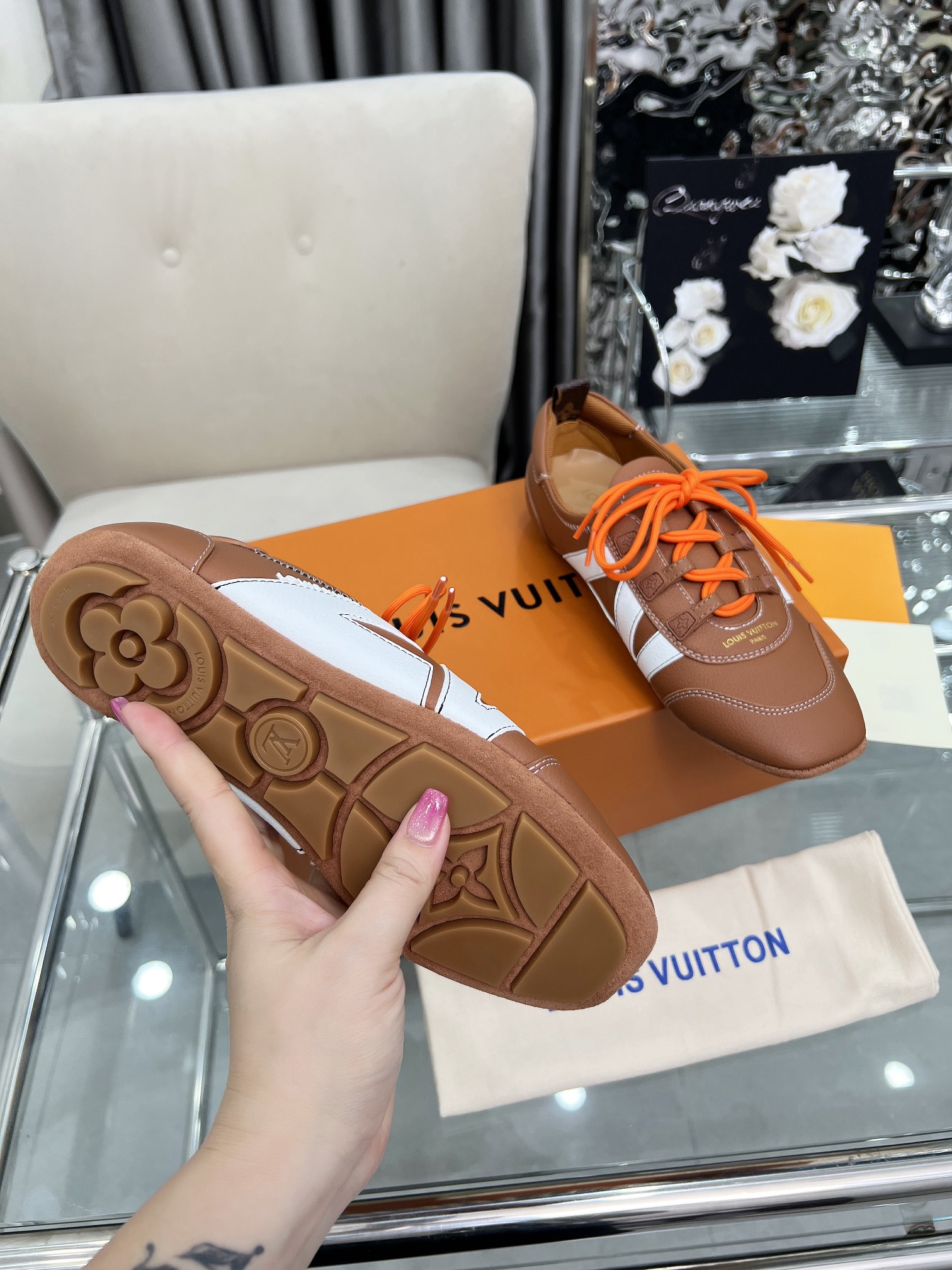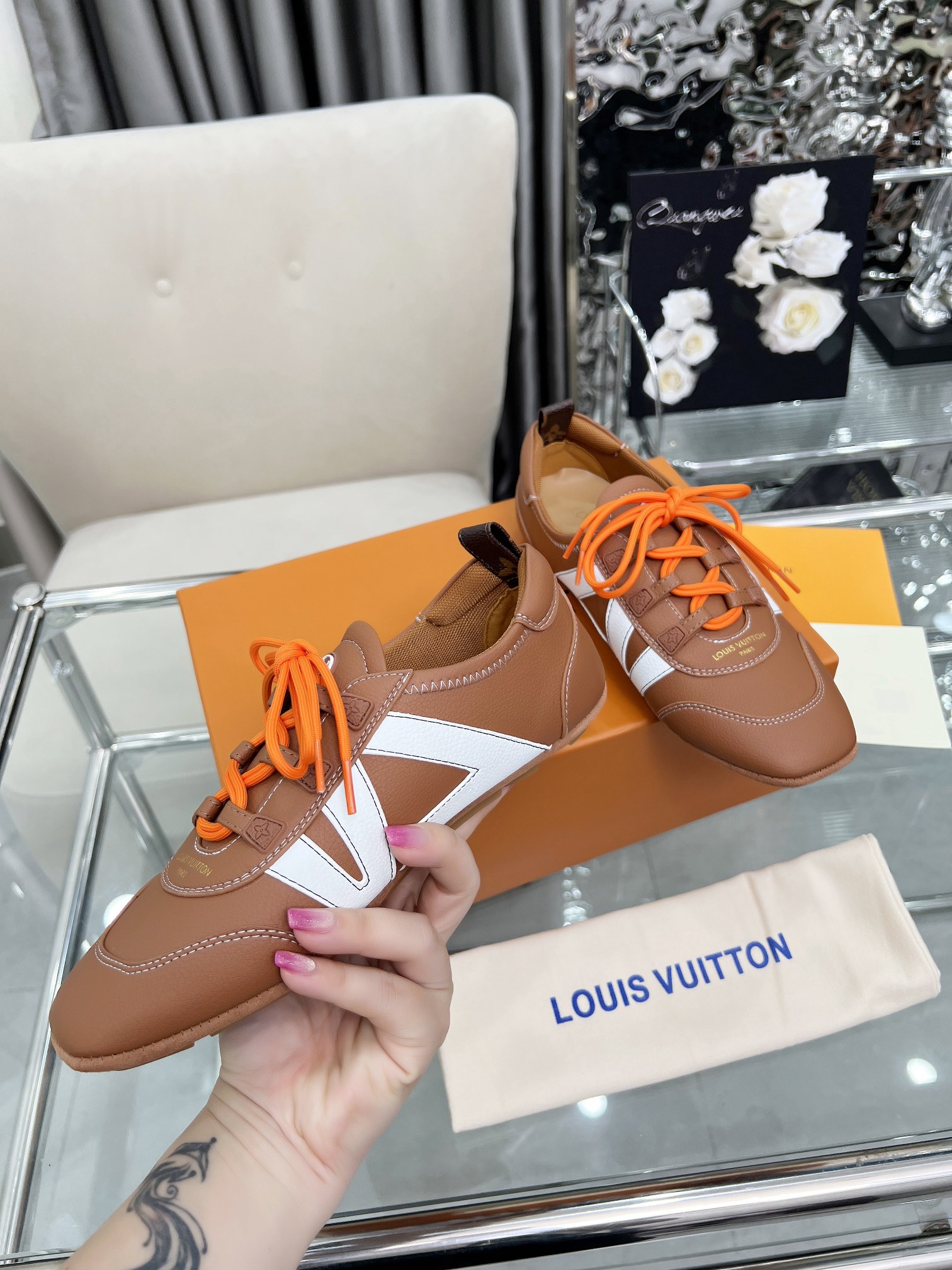 这款鞋子是AAAAA 1:1 质量 (非常棒). 使用了和原版一模一样的材料. 商标部分也保持了和路易威登/Louis Vuitton一样. 图片拍摄是实物鞋子拍摄, 您所收到的实物保证和我们图片一模一样.
