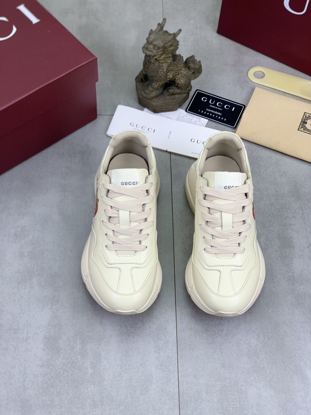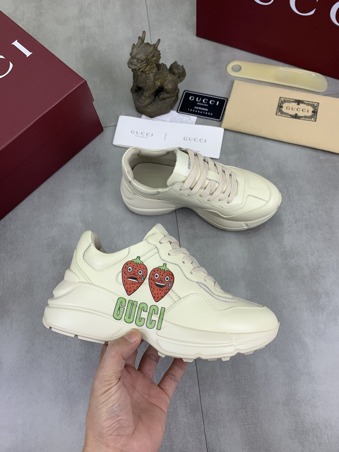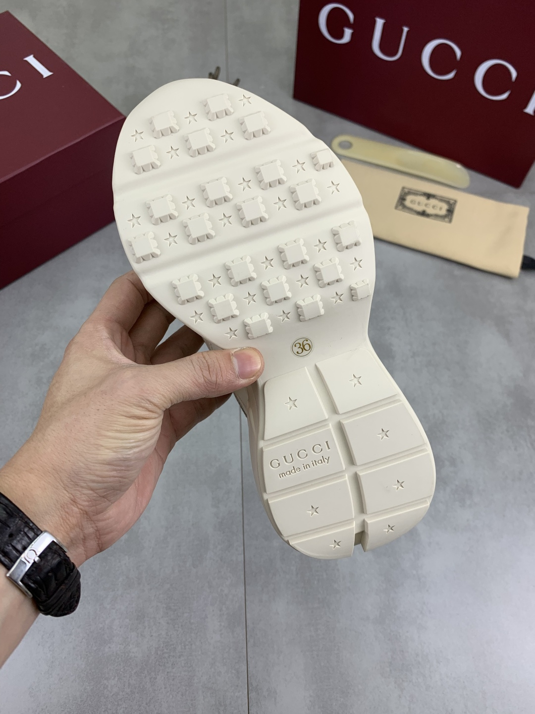这款鞋子是AAAAA 1:1 质量 (非常棒). 使用了和原版一模一样的材料. 商标部分也保持了和古奇/Gucci一样. 图片拍摄是实物鞋子拍摄, 您所收到的实物保证和我们图片一模一样.