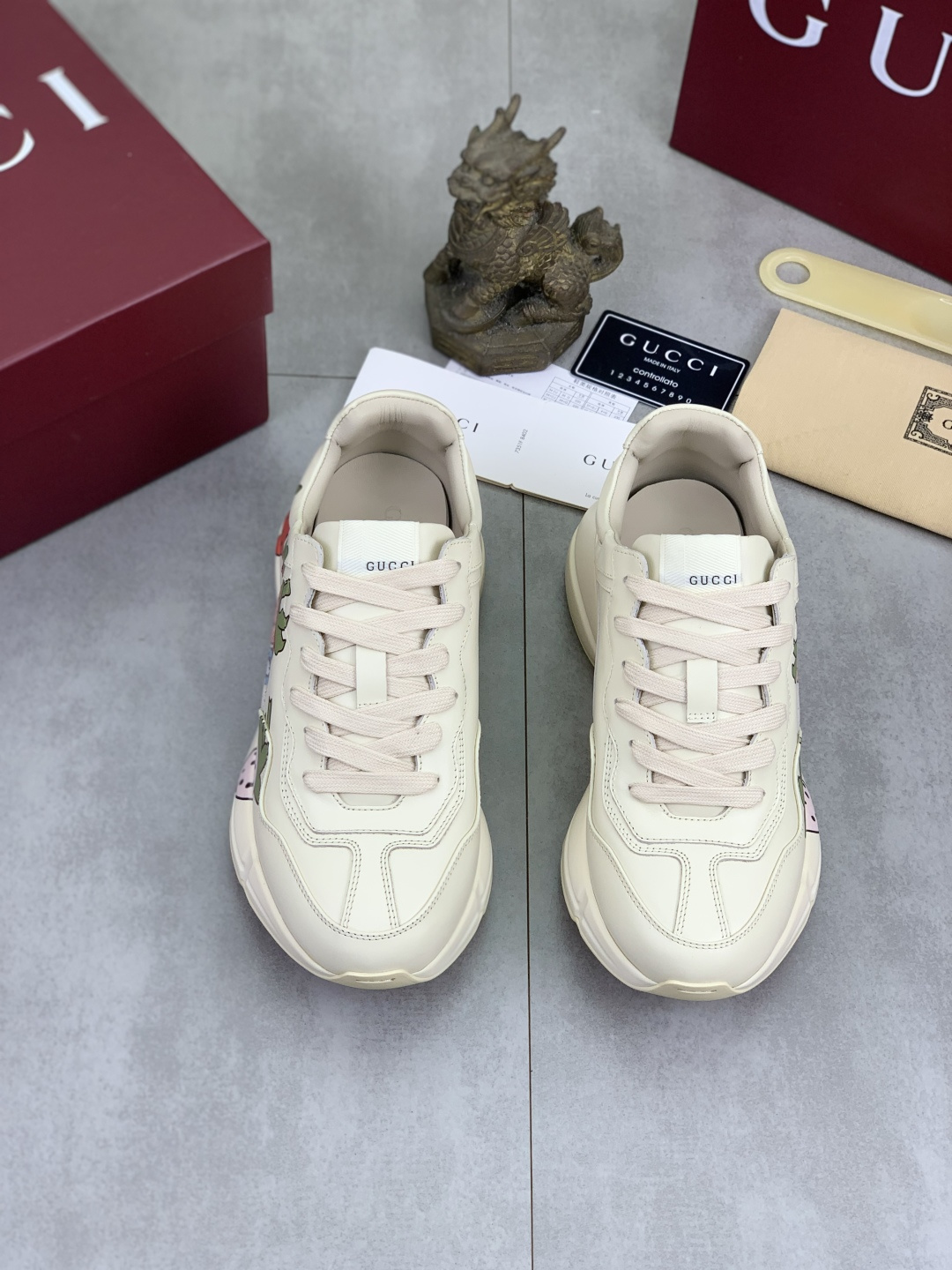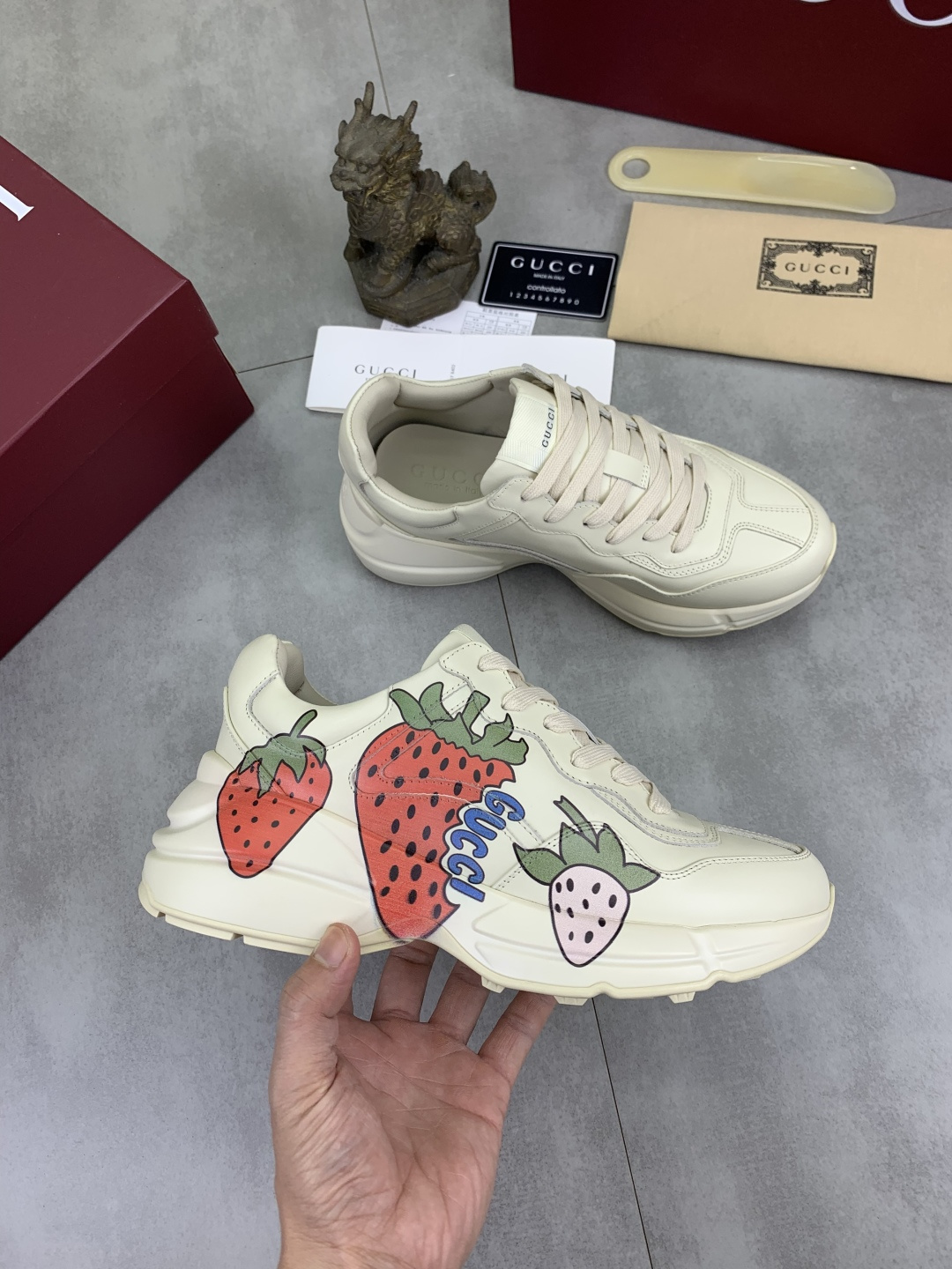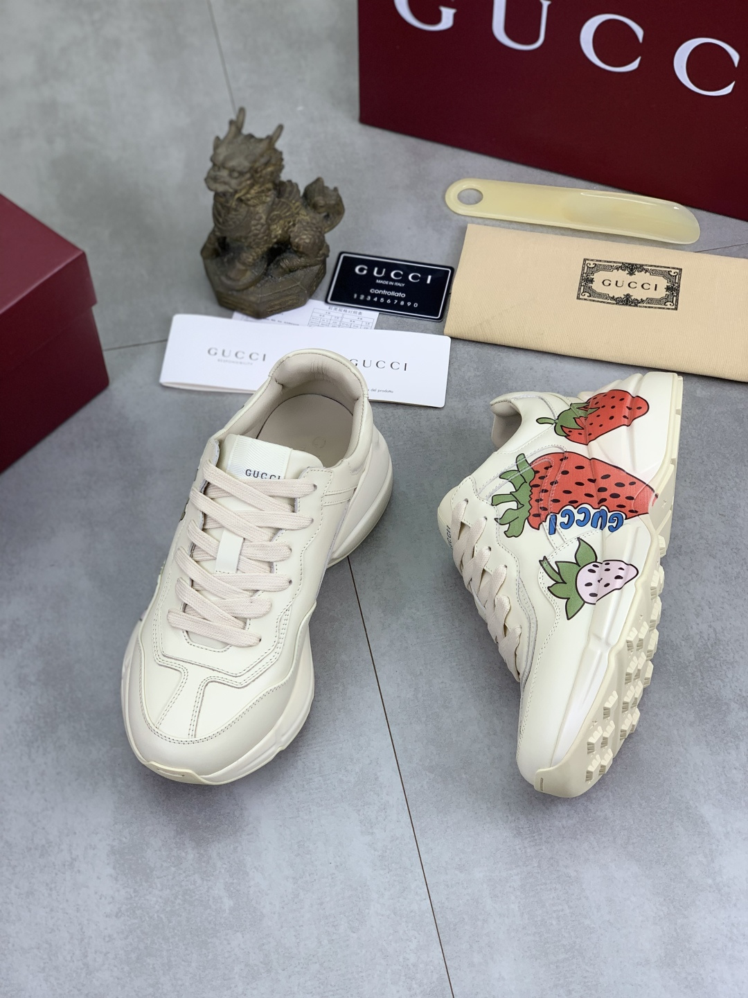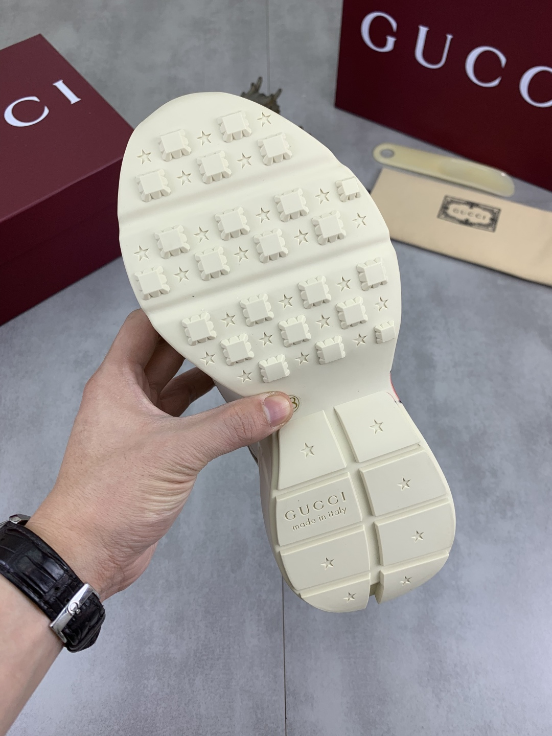 这款鞋子是AAAAA 1:1 质量 (非常棒). 使用了和原版一模一样的材料. 商标部分也保持了和古奇/Gucci一样. 图片拍摄是实物鞋子拍摄, 您所收到的实物保证和我们图片一模一样.