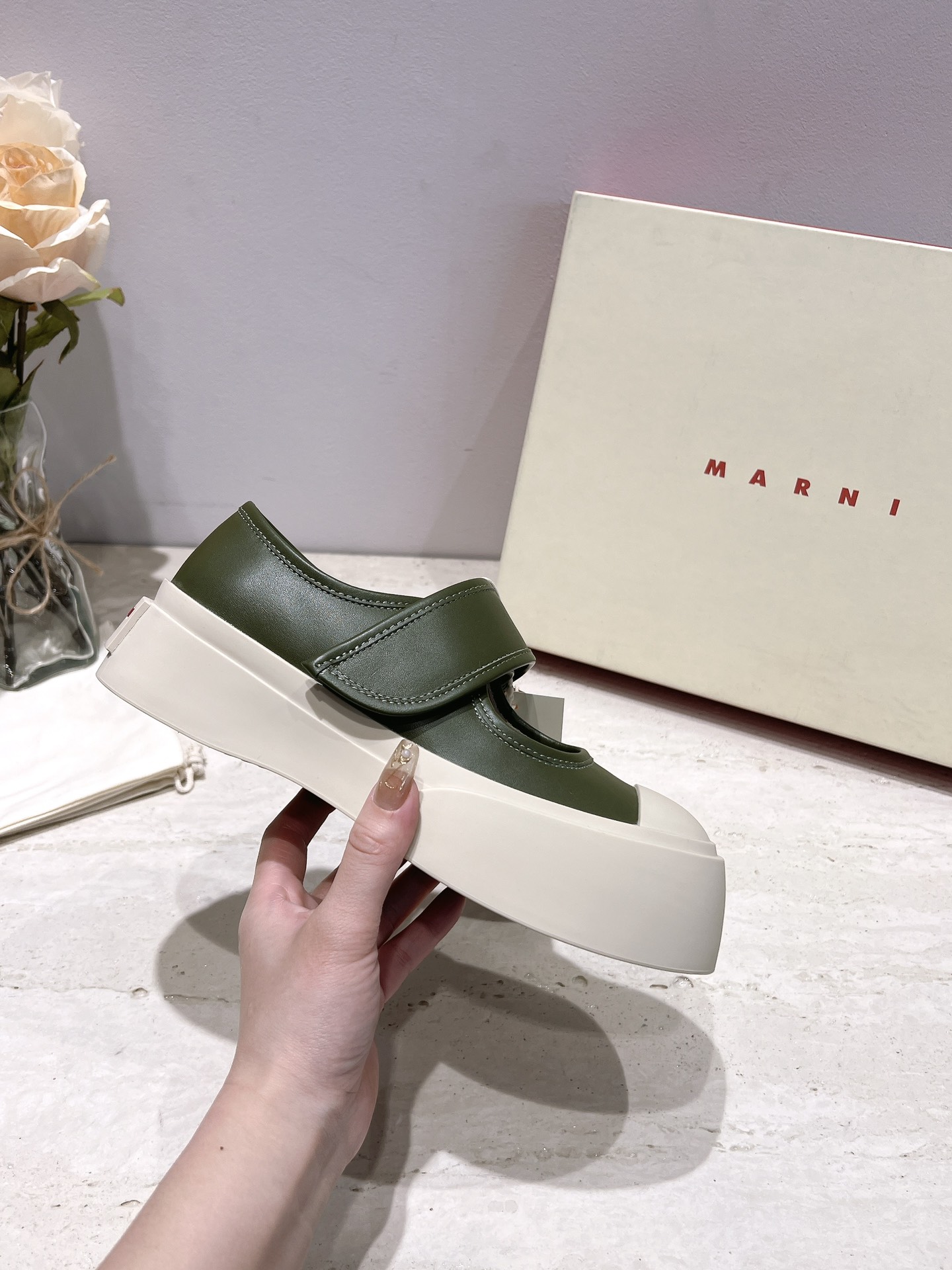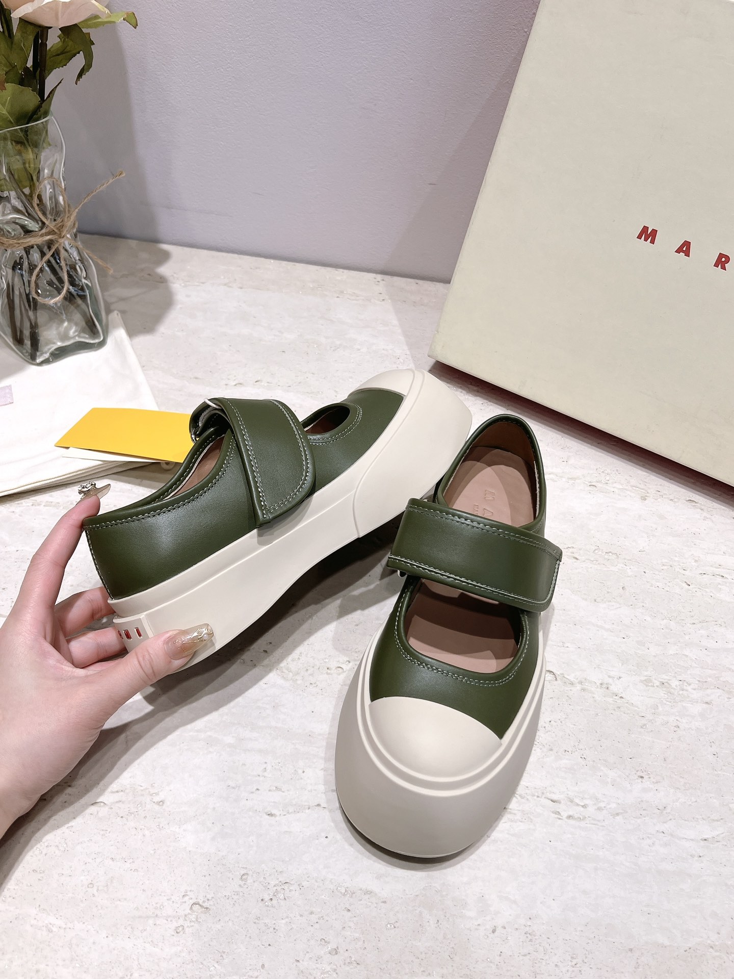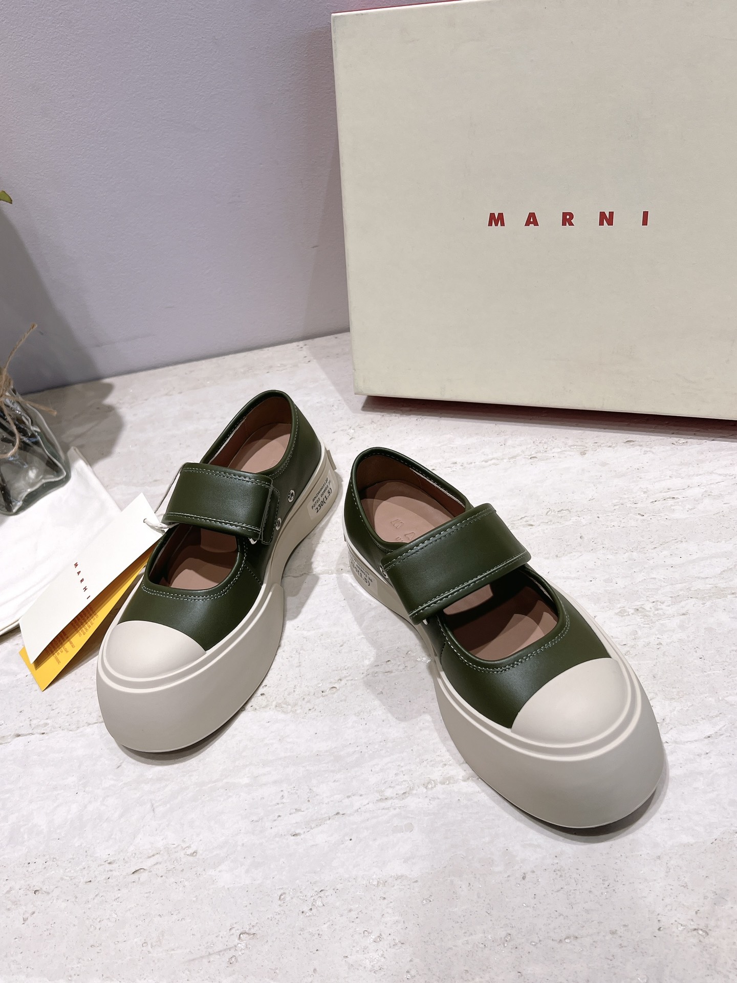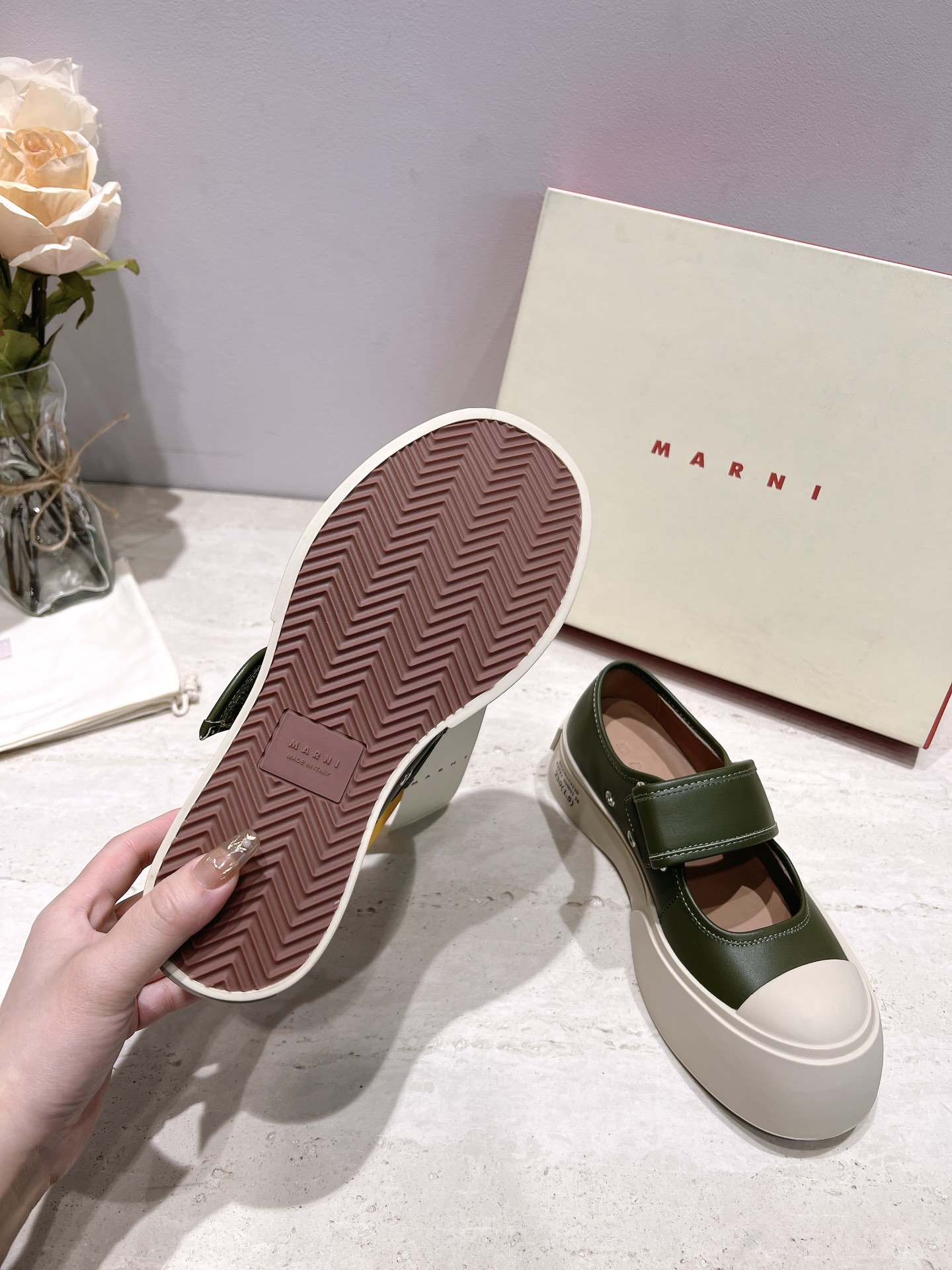 这款鞋子是AAAAA 1:1 质量 (非常棒). 使用了和原版一模一样的材料. 商标部分也保持了和马尔尼/Marni一样. 图片拍摄是实物鞋子拍摄, 您所收到的实物保证和我们图片一模一样.