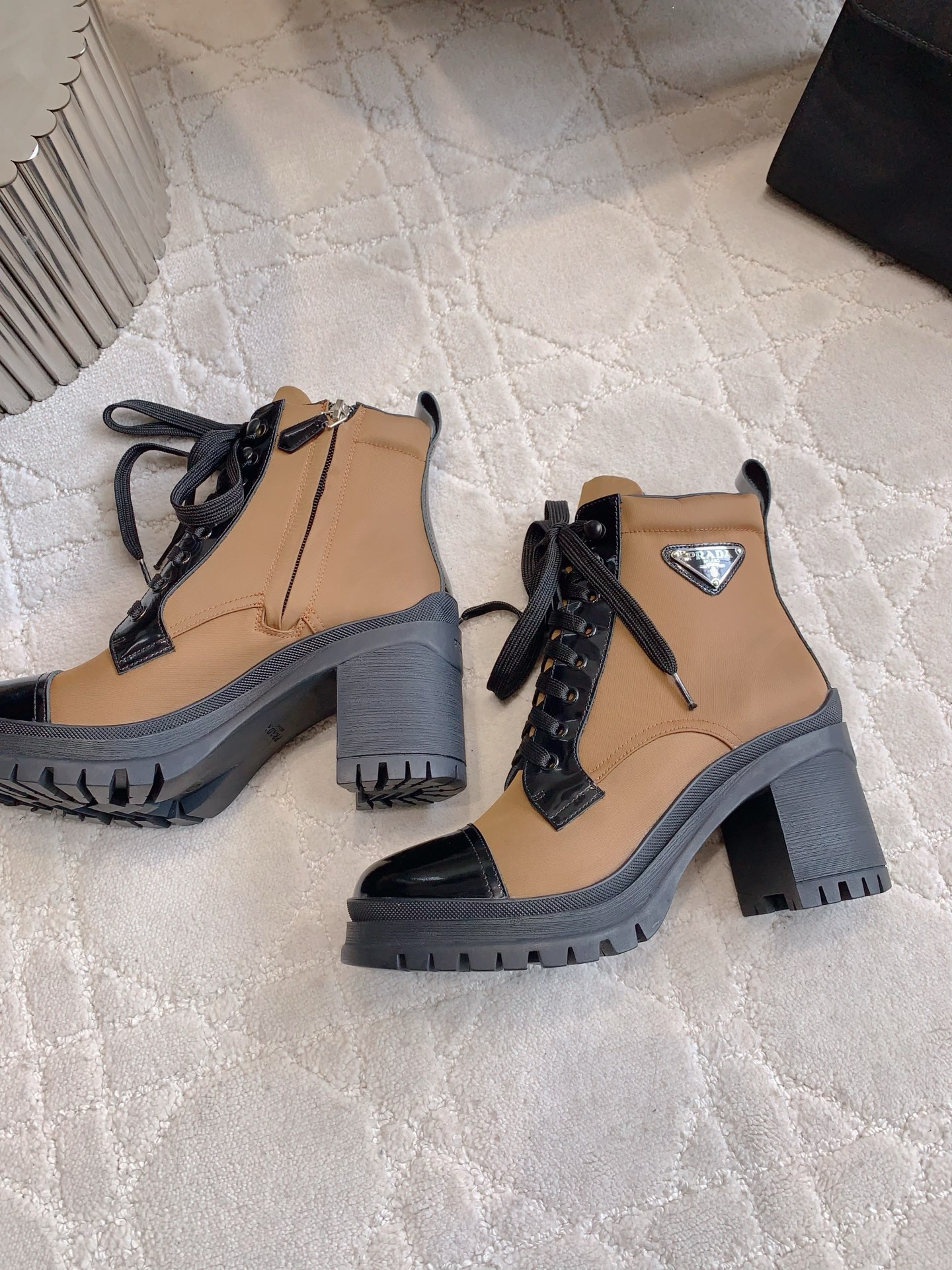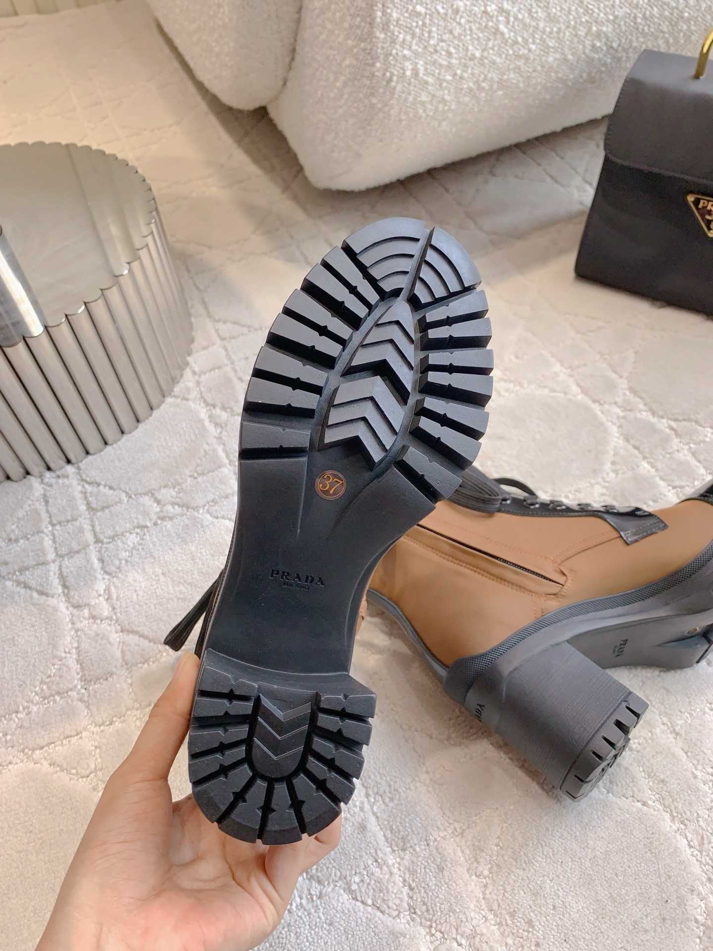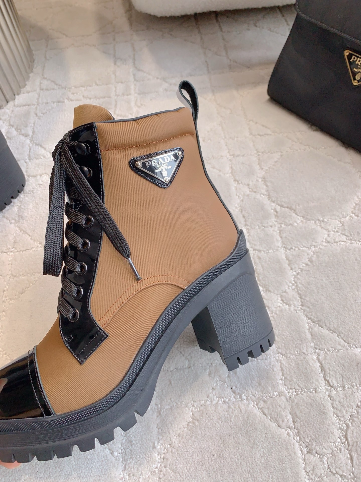 这款鞋子是AAAAA 1:1 质量 (非常棒). 使用了和原版一模一样的材料. 商标部分也保持了和普拉达/Prada一样. 图片拍摄是实物鞋子拍摄, 您所收到的实物保证和我们图片一模一样.