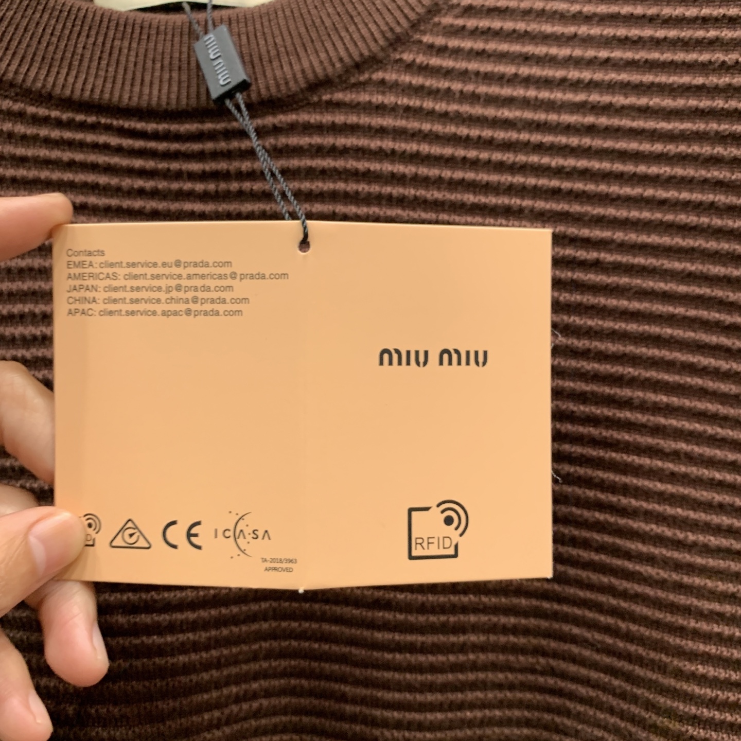 这款衣服是AAAAA 1:1 质量 (非常棒). 使用了和原版一模一样的材料. 商标部分也保持了和缪缪/Miu Miu一样. 图片拍摄是实物衣服拍摄, 您所收到的实物保证和我们图片一模一样.