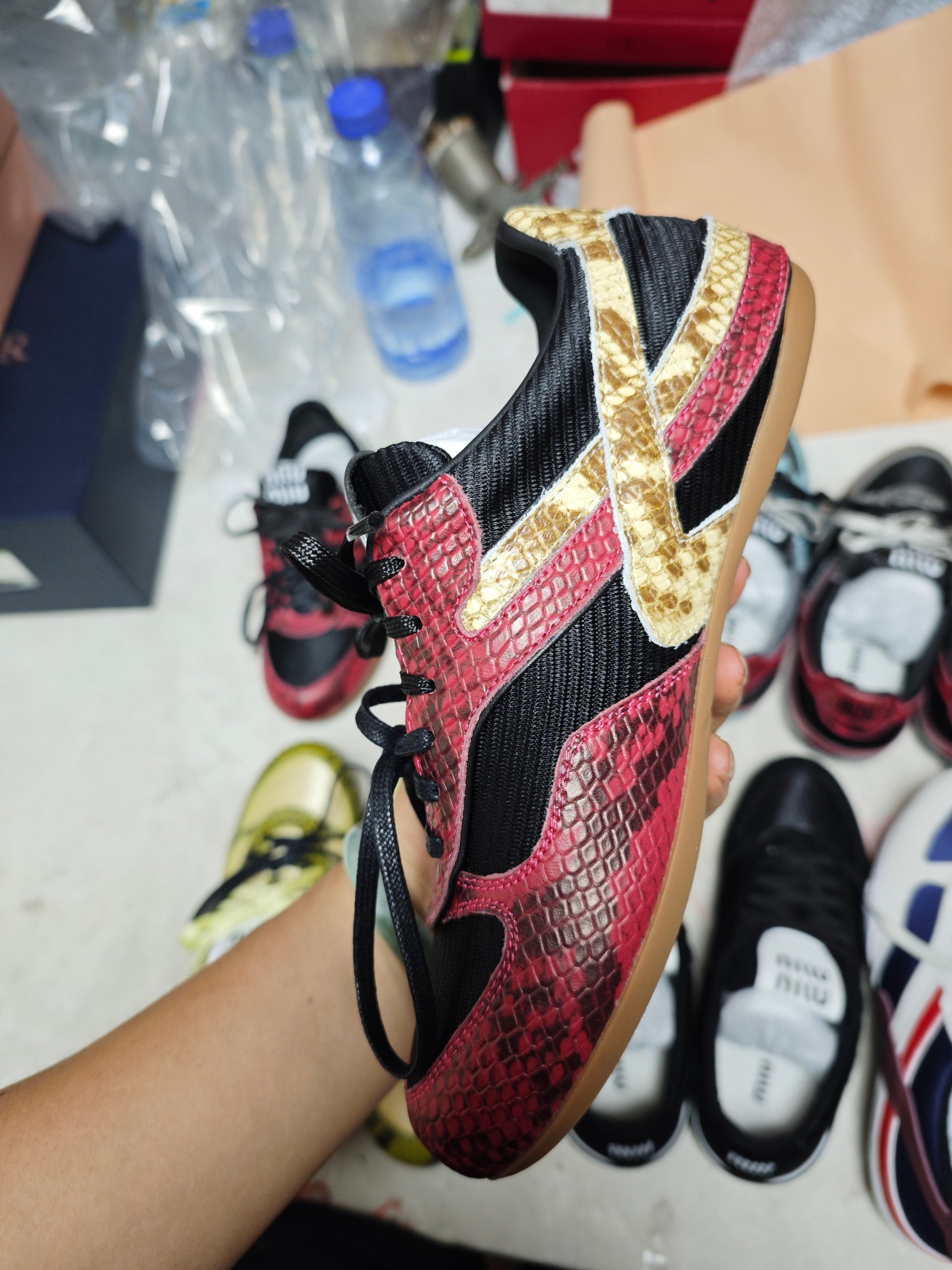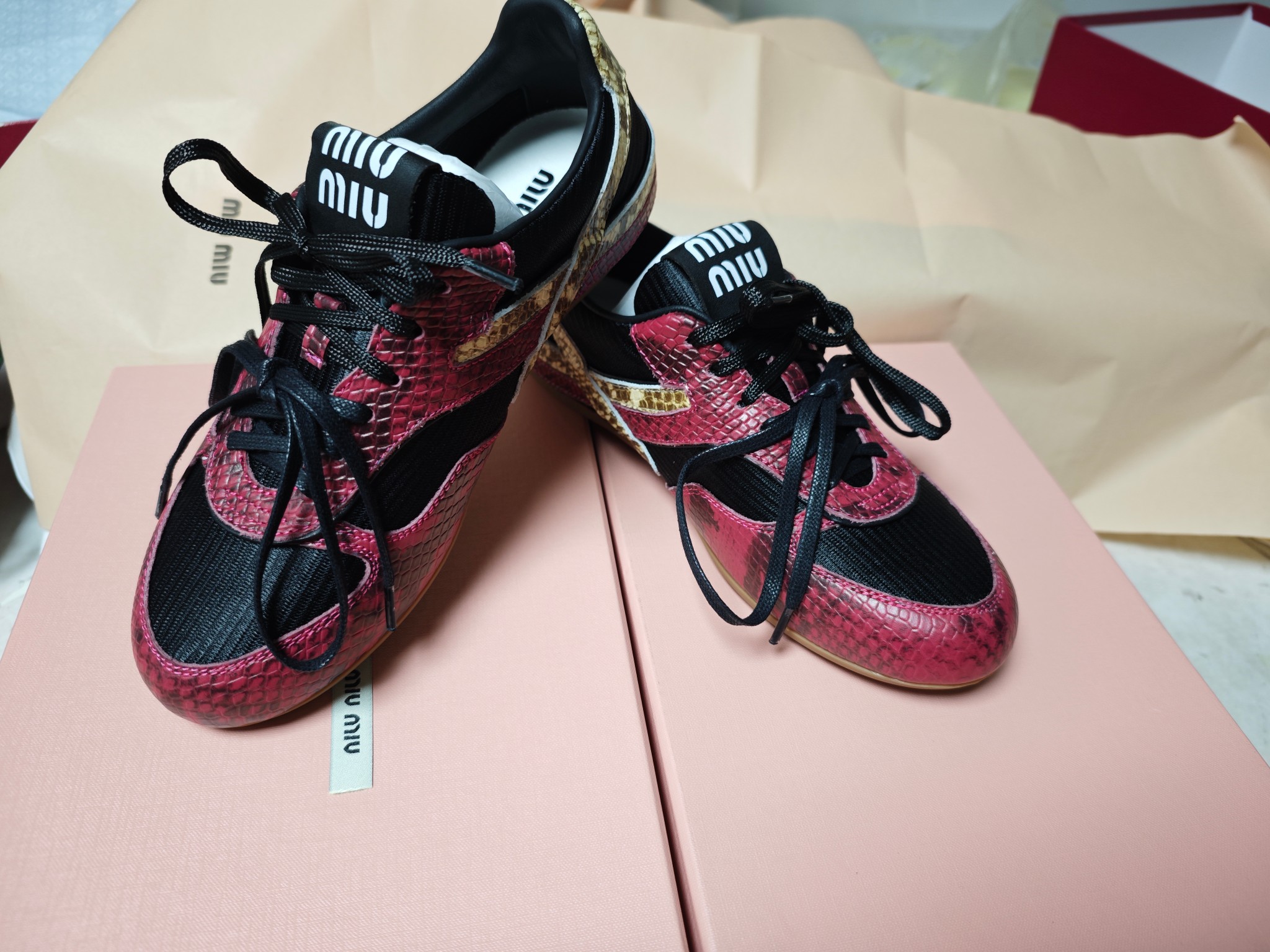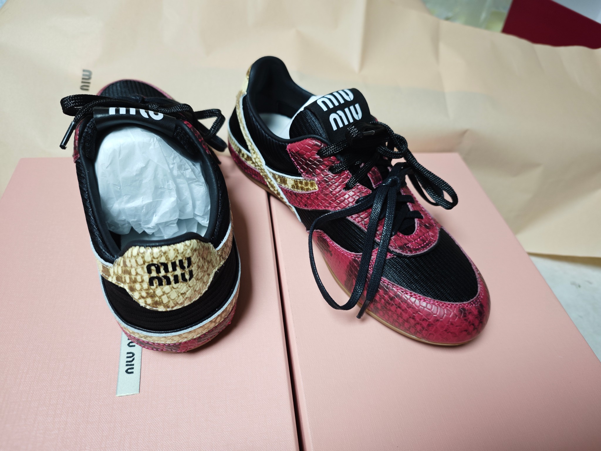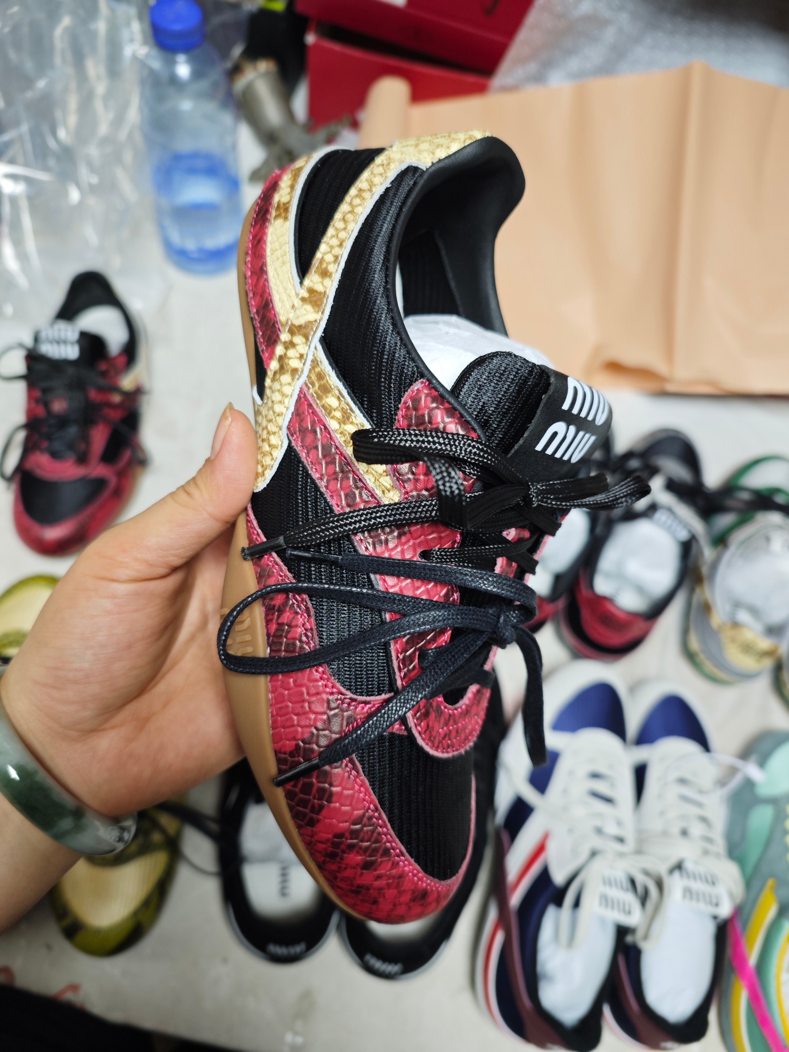 这款鞋子是AAAAA 1:1 质量 (非常棒). 使用了和原版一模一样的材料. 商标部分也保持了和缪缪/Miu Miu一样. 图片拍摄是实物鞋子拍摄, 您所收到的实物保证和我们图片一模一样.