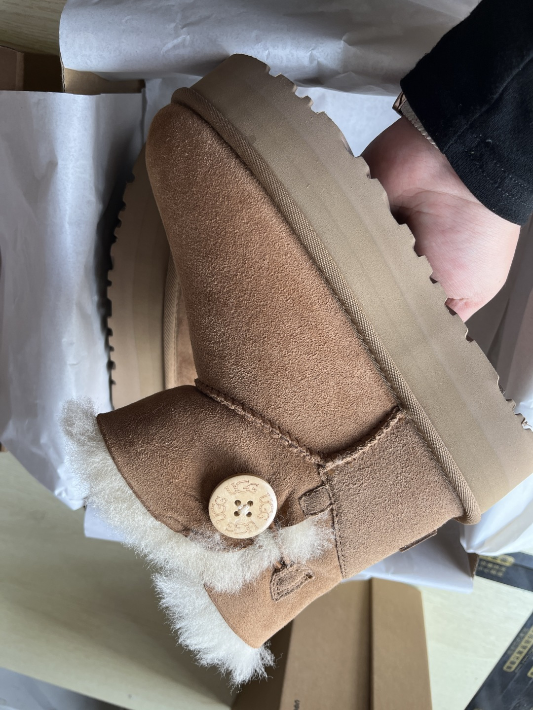 这款兒童鞋是AAAAA 1:1 质量 (非常棒). 使用了和原版一模一样的材料. 商标部分也保持了和UGG雪地靴一样. 图片拍摄是实物兒童鞋拍摄, 您所收到的实物保证和我们图片一模一样.