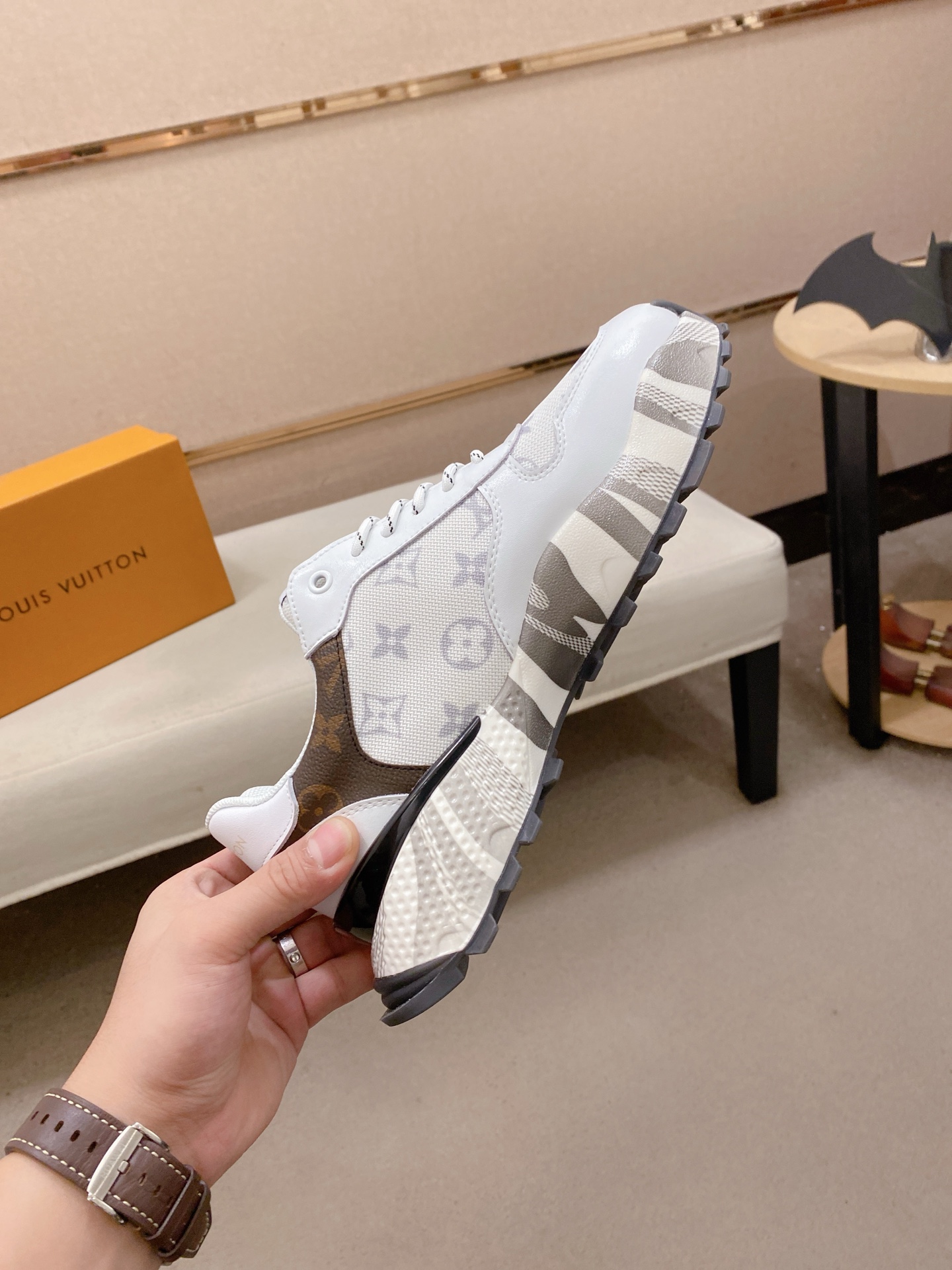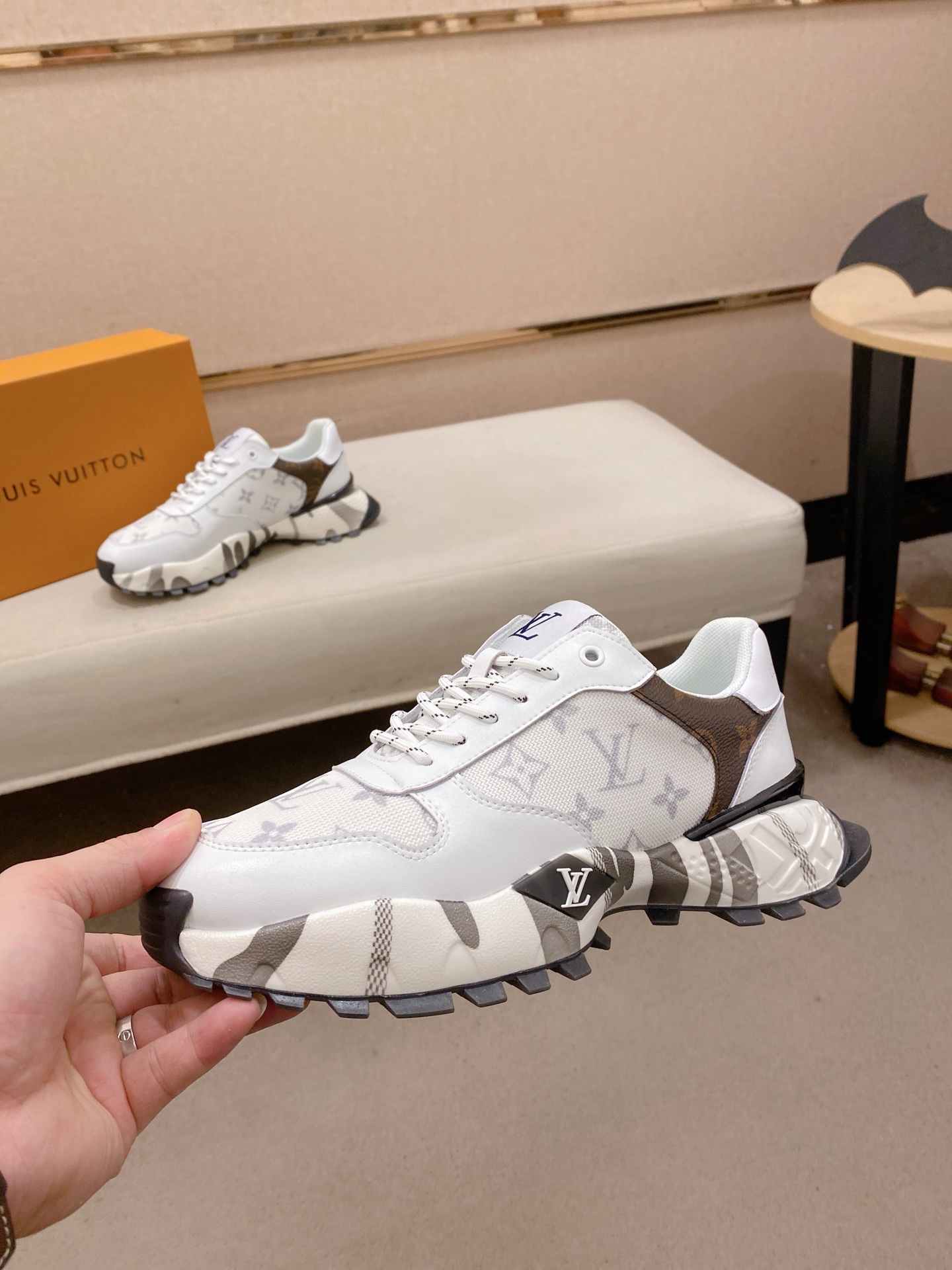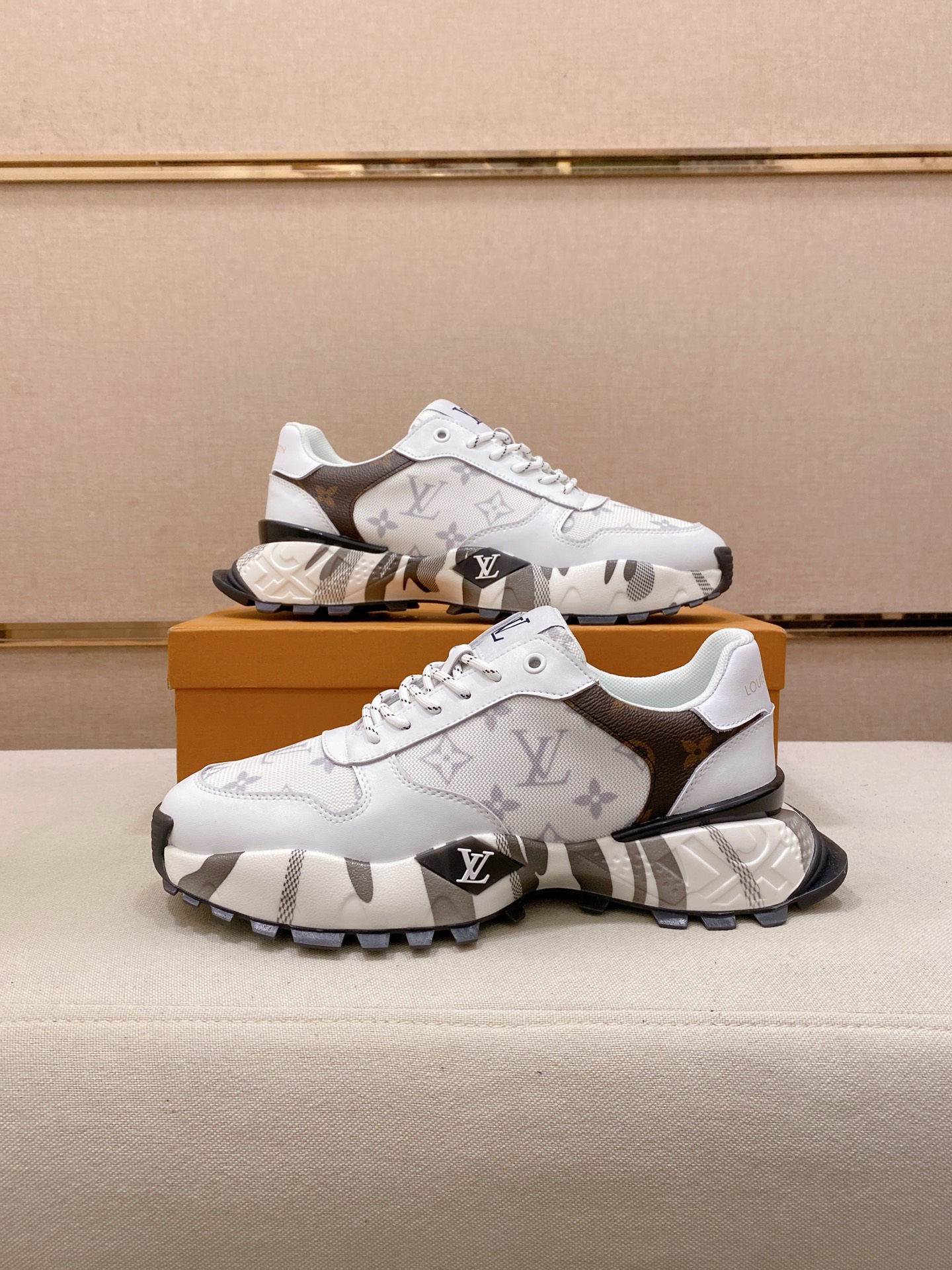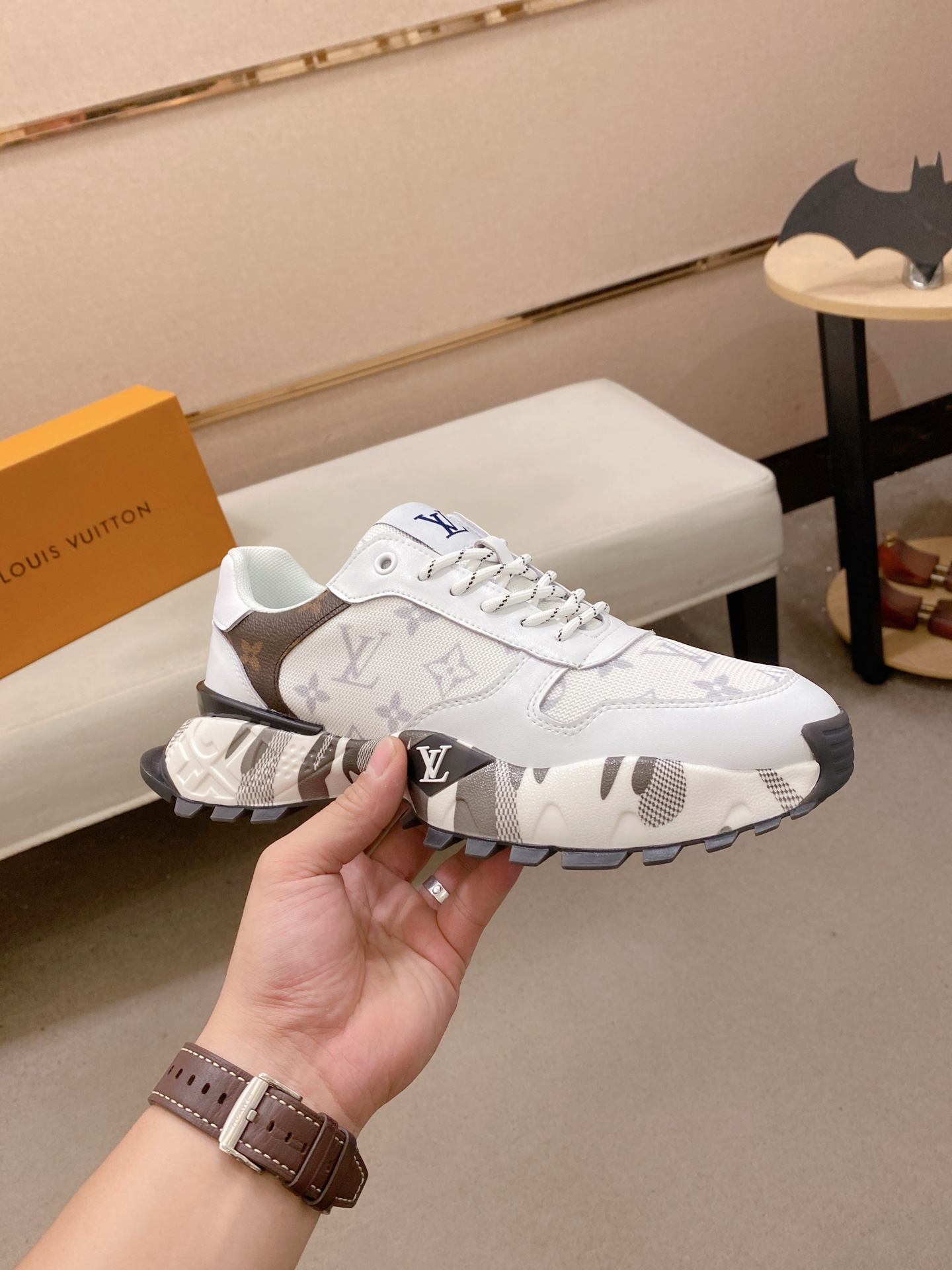 这款鞋子是AAAAA 1:1 质量 (非常棒). 使用了和原版一模一样的材料. 商标部分也保持了和路易威登/Louis Vuitton一样. 图片拍摄是实物鞋子拍摄, 您所收到的实物保证和我们图片一模一样.