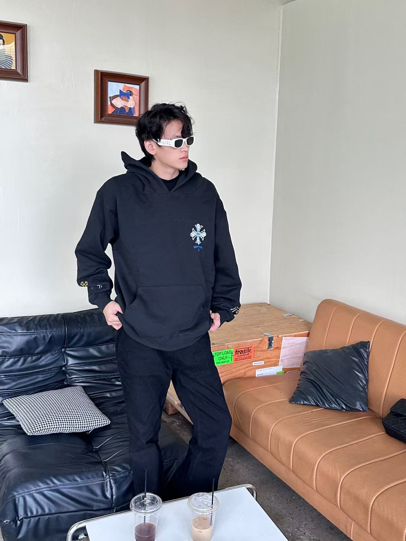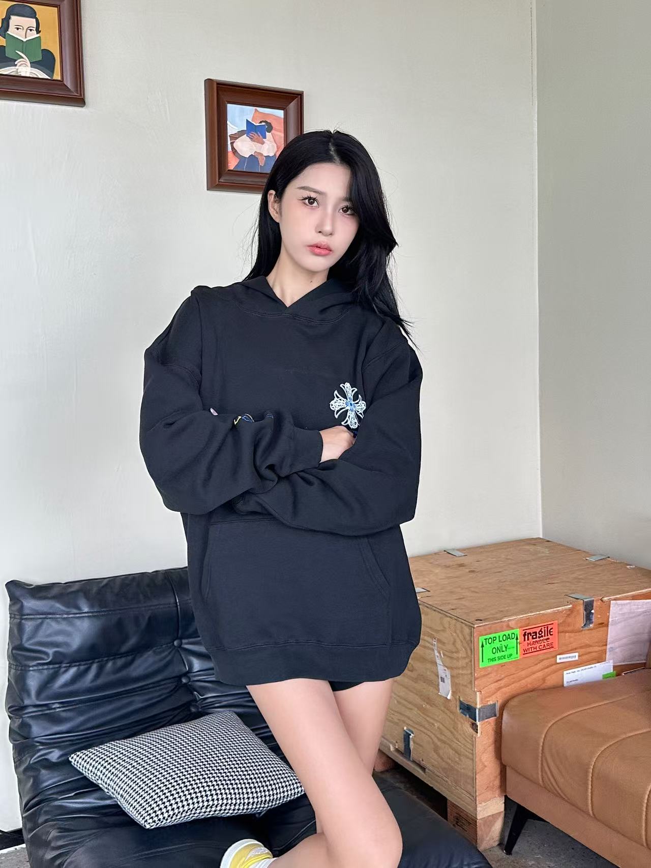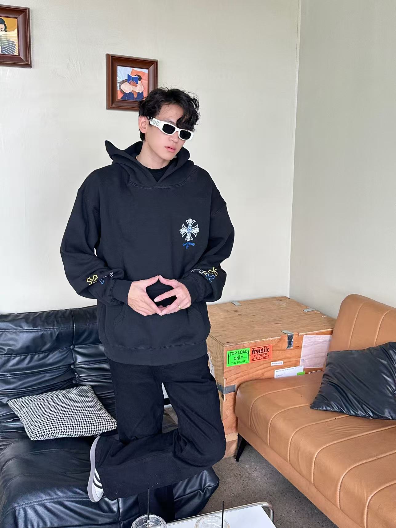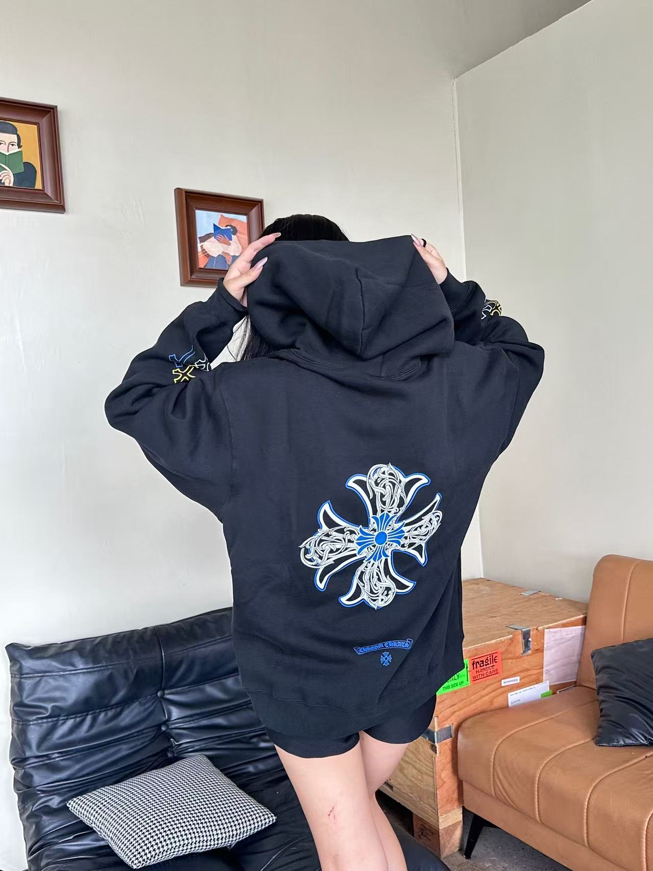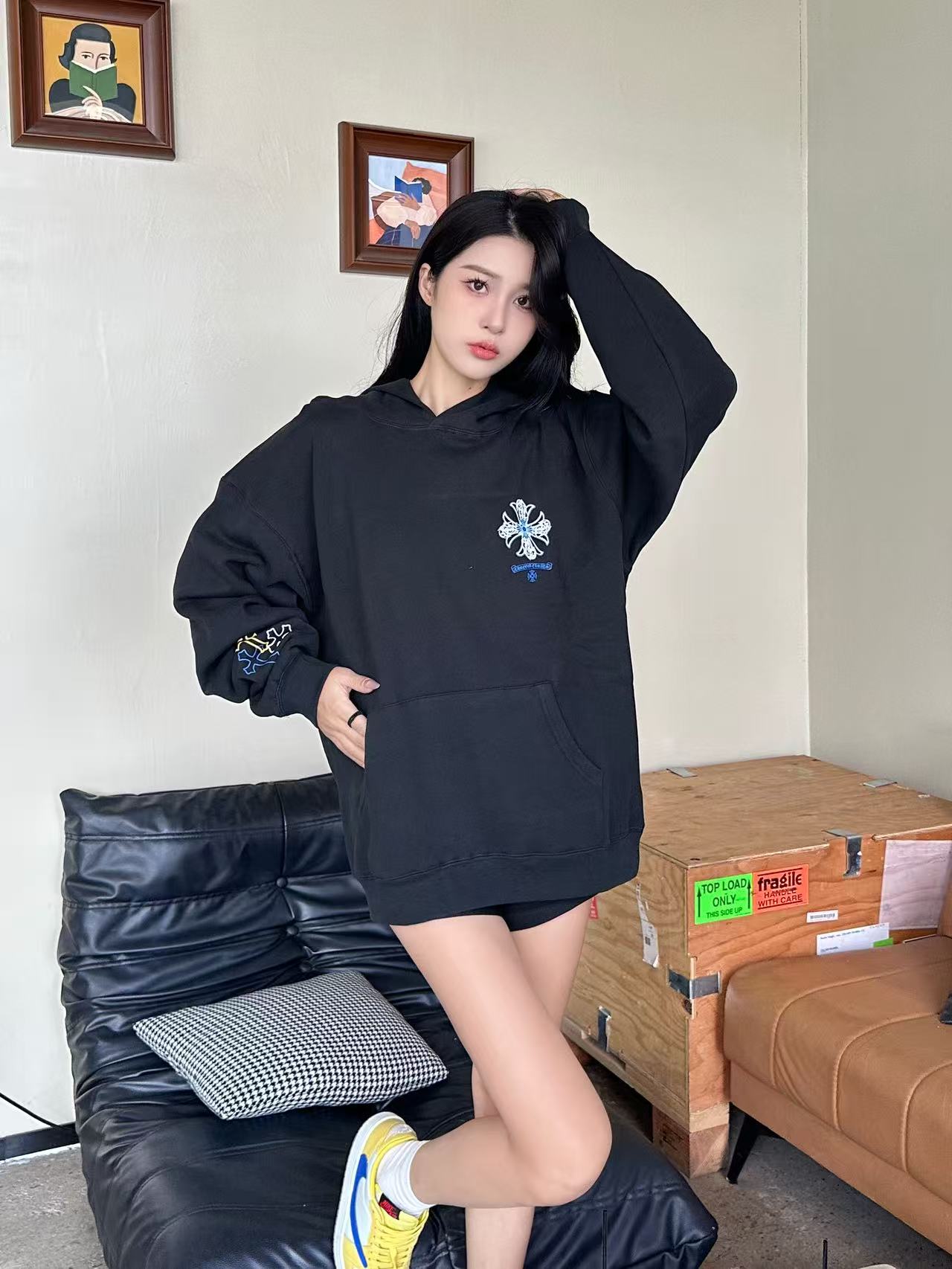 这款衣服是AAAAA 1:1 质量 (非常棒). 使用了和原版一模一样的材料. 商标部分也保持了和克罗心/Chrome Hearts一样. 图片拍摄是实物衣服拍摄, 您所收到的实物保证和我们图片一模一样.