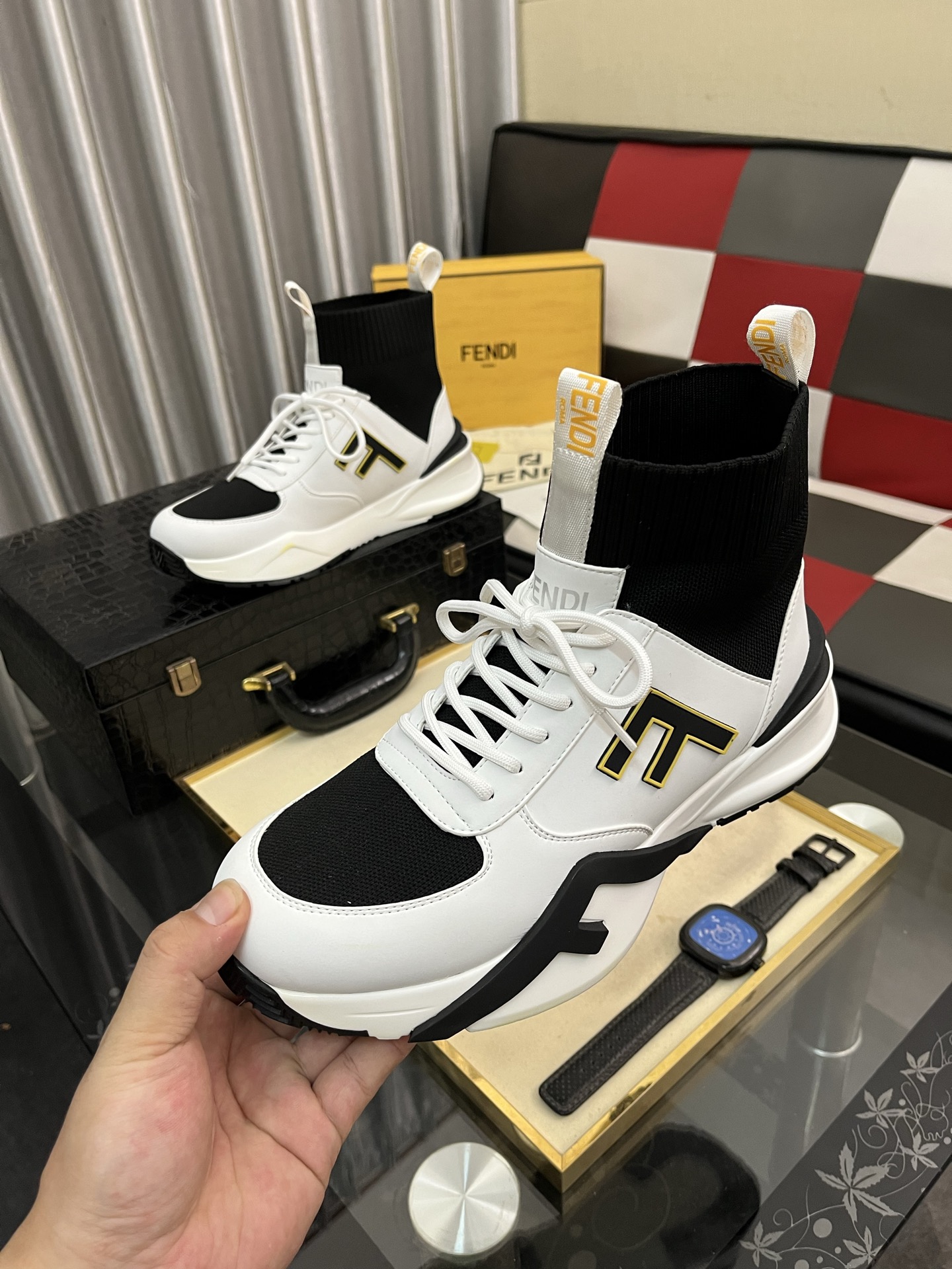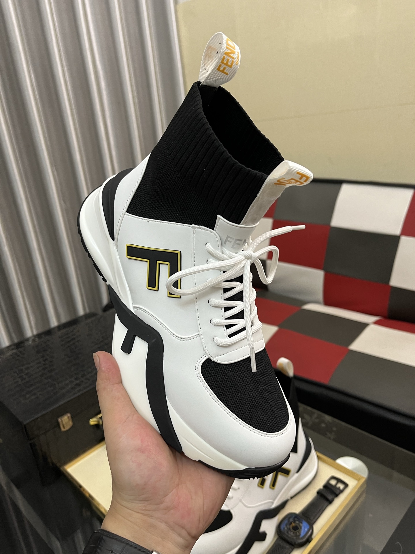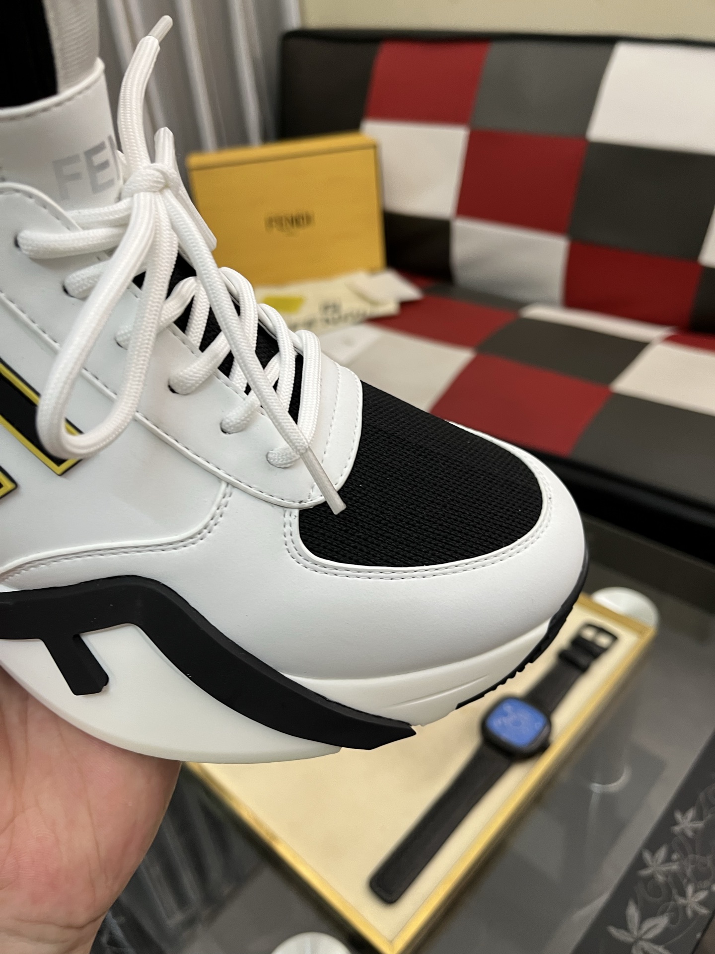 这款鞋子是AAAAA 1:1 质量 (非常棒). 使用了和原版一模一样的材料. 商标部分也保持了和芬迪/Fendi一样. 图片拍摄是实物鞋子拍摄, 您所收到的实物保证和我们图片一模一样.