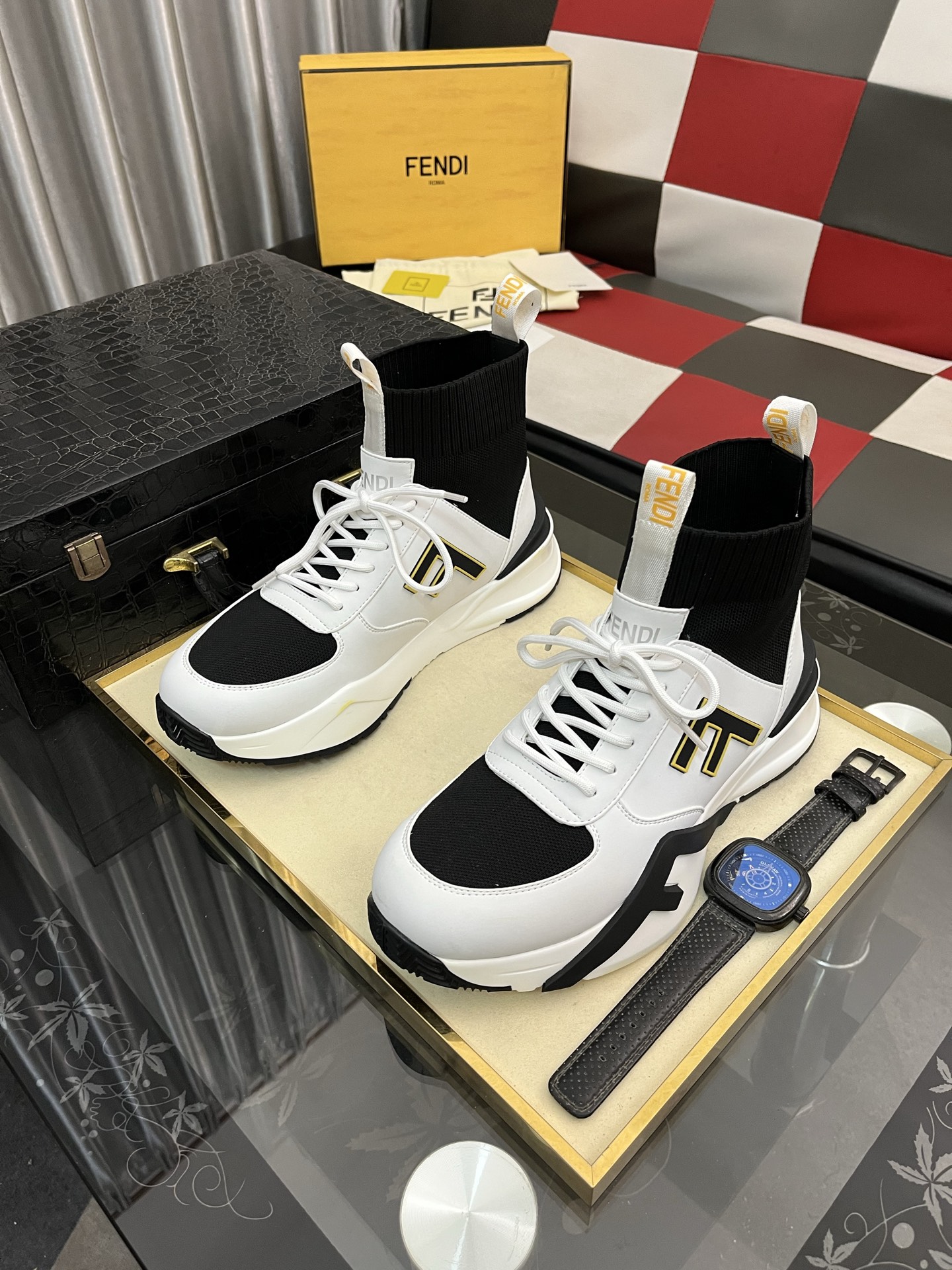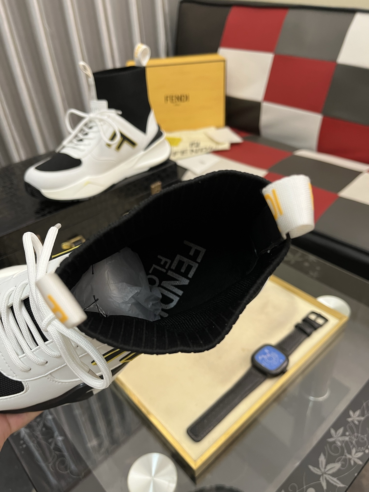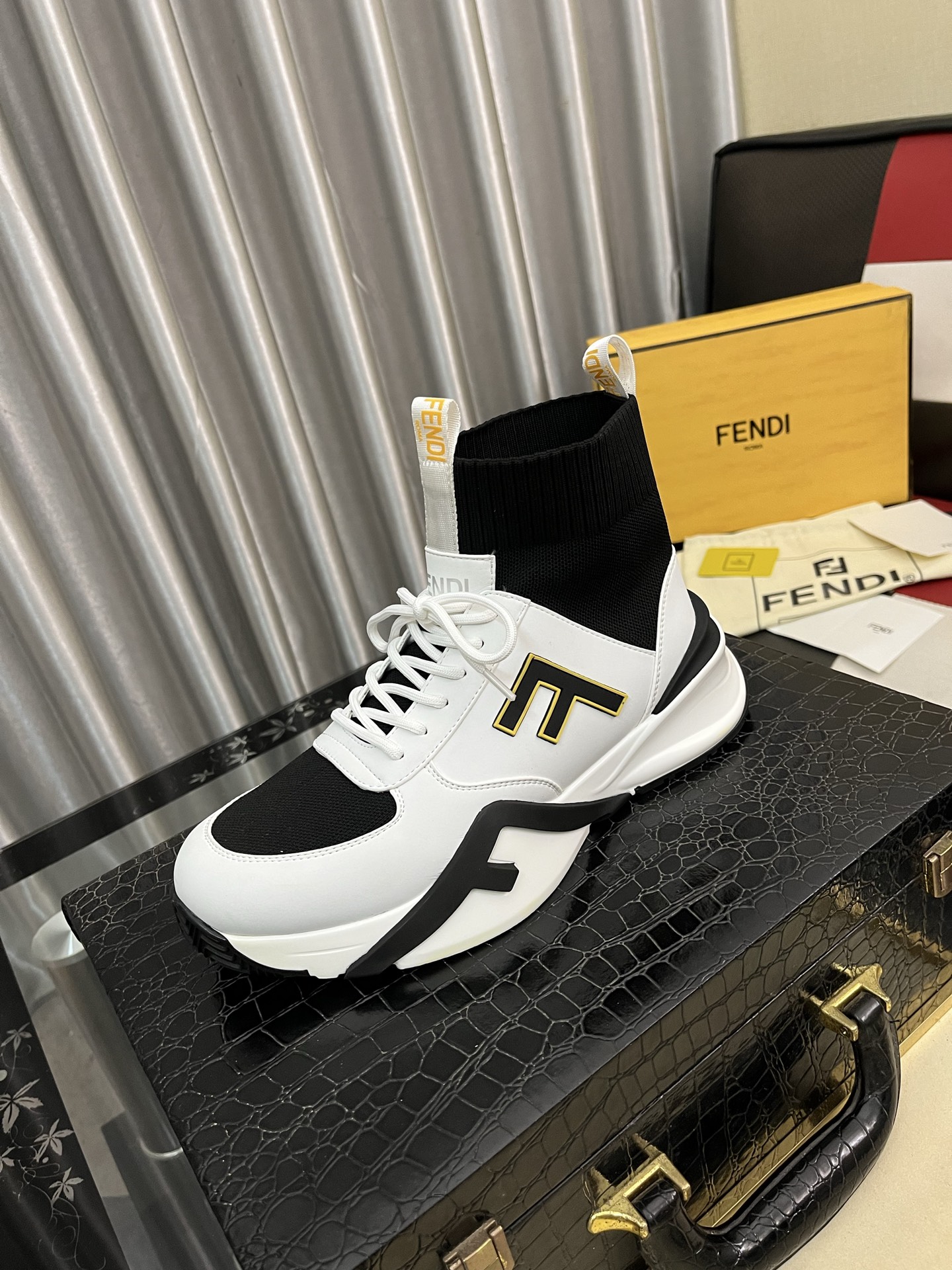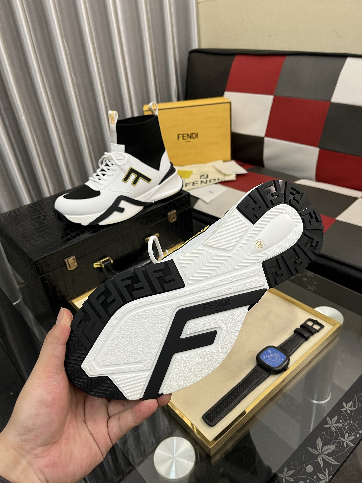 这款鞋子是AAAAA 1:1 质量 (非常棒). 使用了和原版一模一样的材料. 商标部分也保持了和芬迪/Fendi一样. 图片拍摄是实物鞋子拍摄, 您所收到的实物保证和我们图片一模一样.