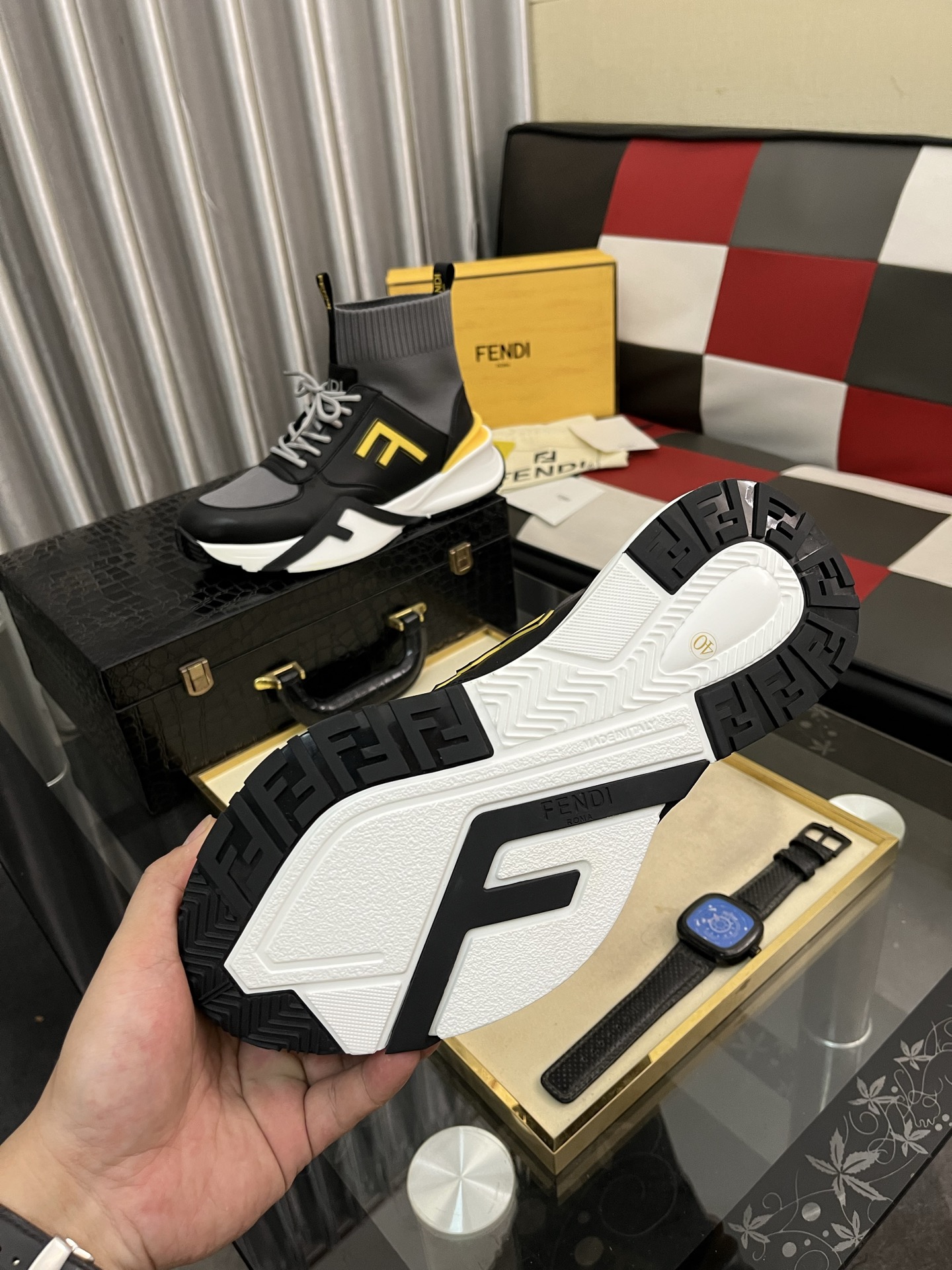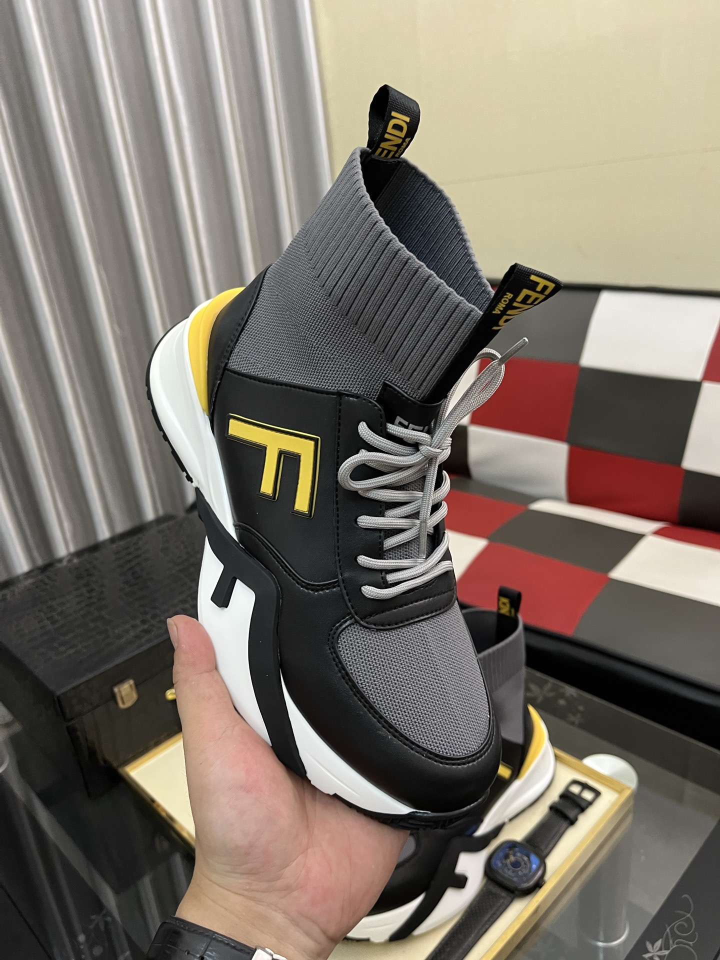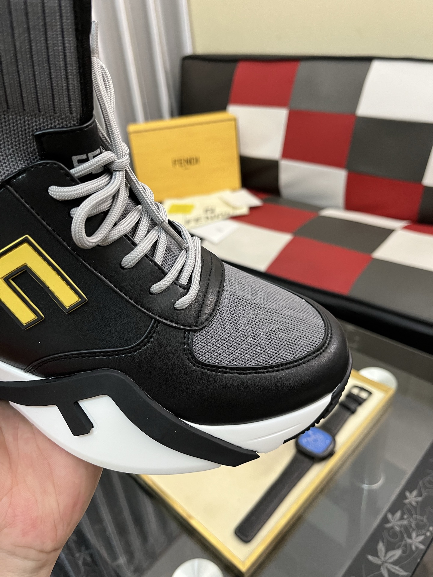 这款鞋子是AAAAA 1:1 质量 (非常棒). 使用了和原版一模一样的材料. 商标部分也保持了和芬迪/Fendi一样. 图片拍摄是实物鞋子拍摄, 您所收到的实物保证和我们图片一模一样.