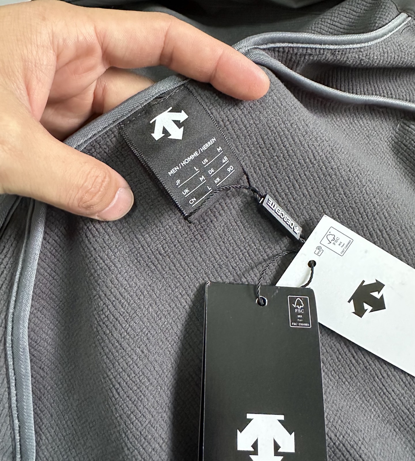 这款衣服是AAAAA 1:1 质量 (非常棒). 使用了和原版一模一样的材料. 商标部分也保持了和Descente一样. 图片拍摄是实物衣服拍摄, 您所收到的实物保证和我们图片一模一样.