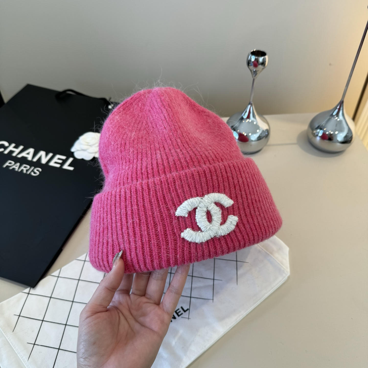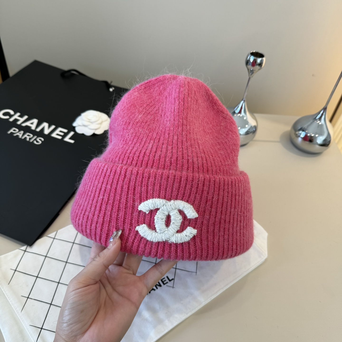 这款帽子是AAAAA 1:1 质量 (非常棒). 使用了和原版一模一样的材料. 商标部分也保持了和香奈儿/Chanel一样. 图片拍摄是实物帽子拍摄, 您所收到的实物保证和我们图片一模一样.