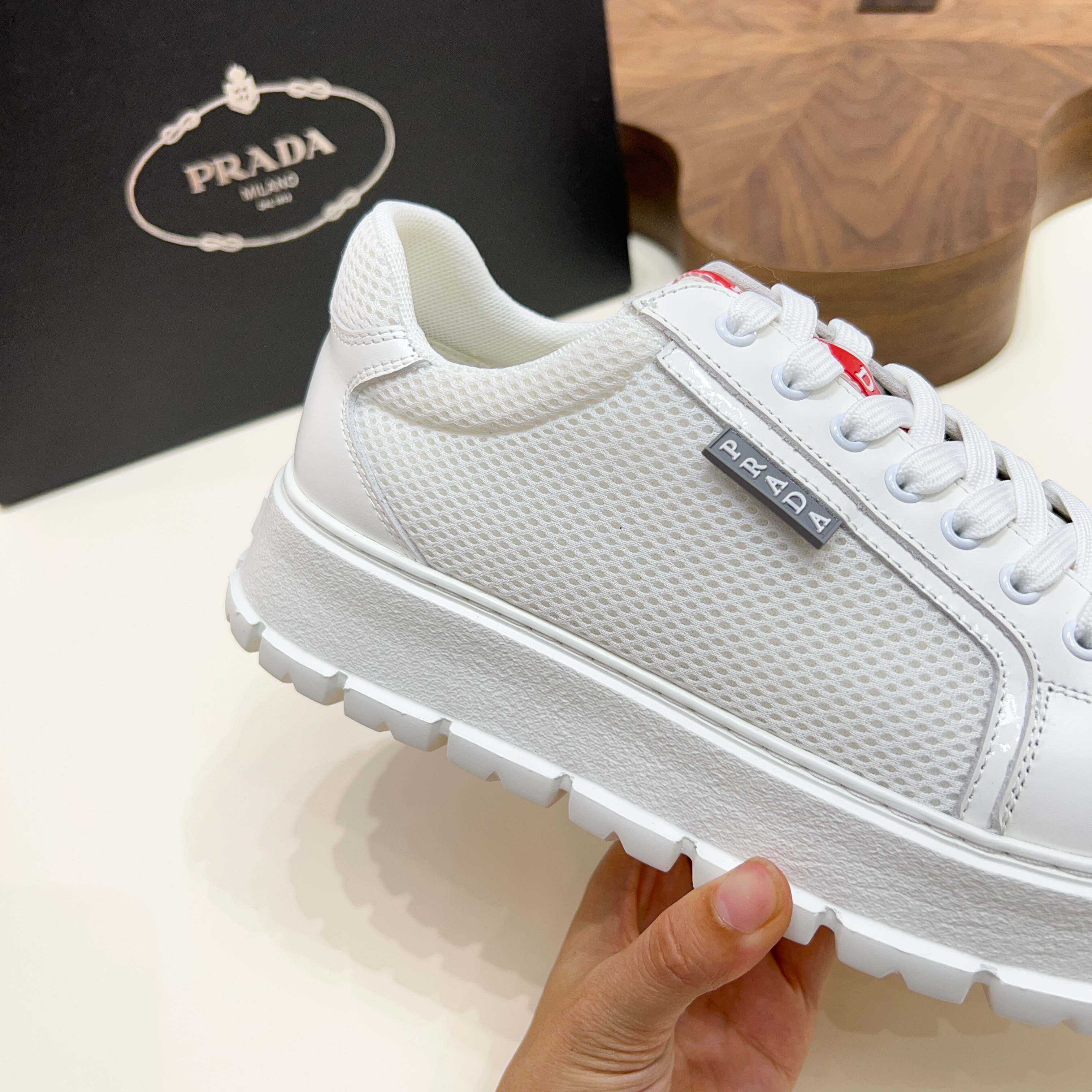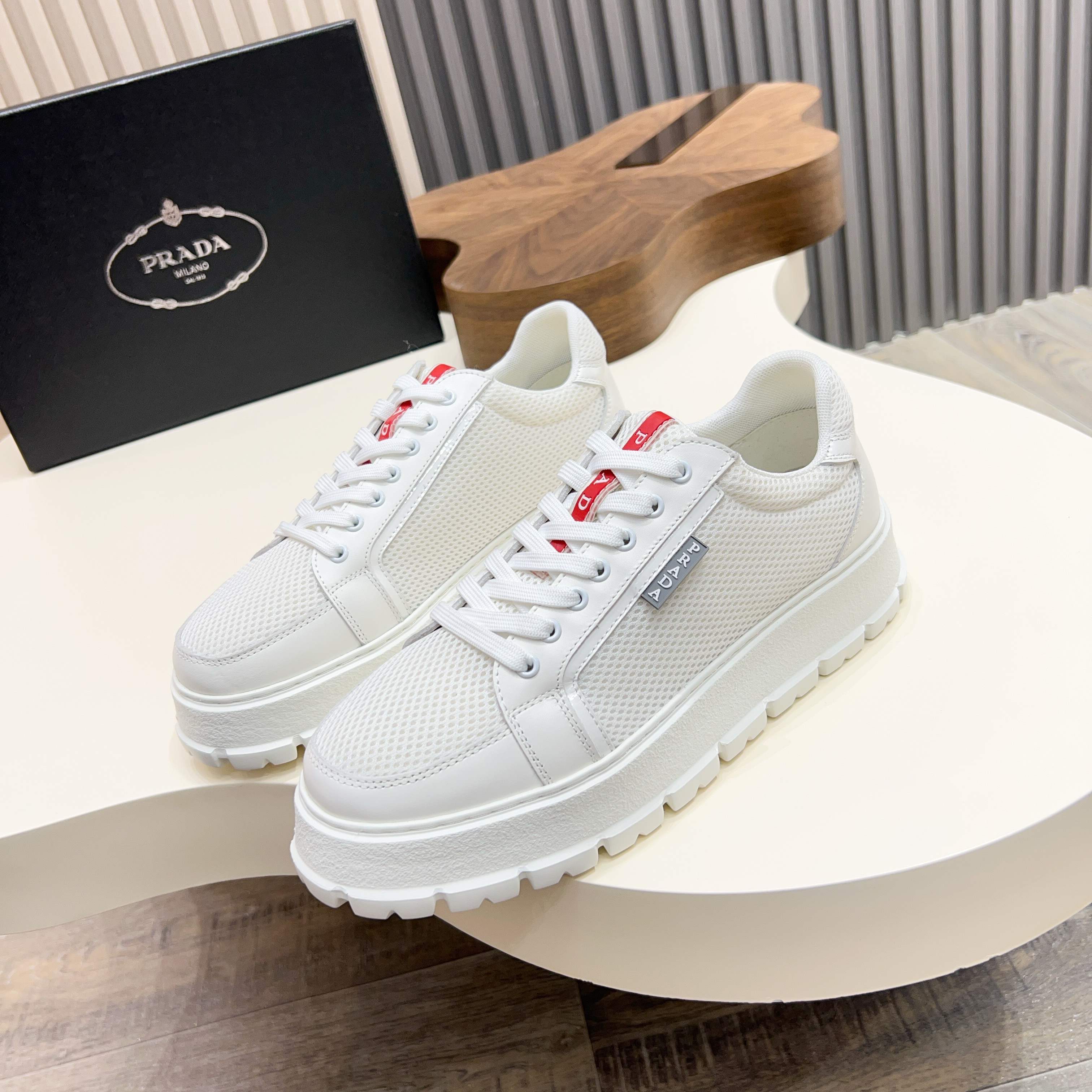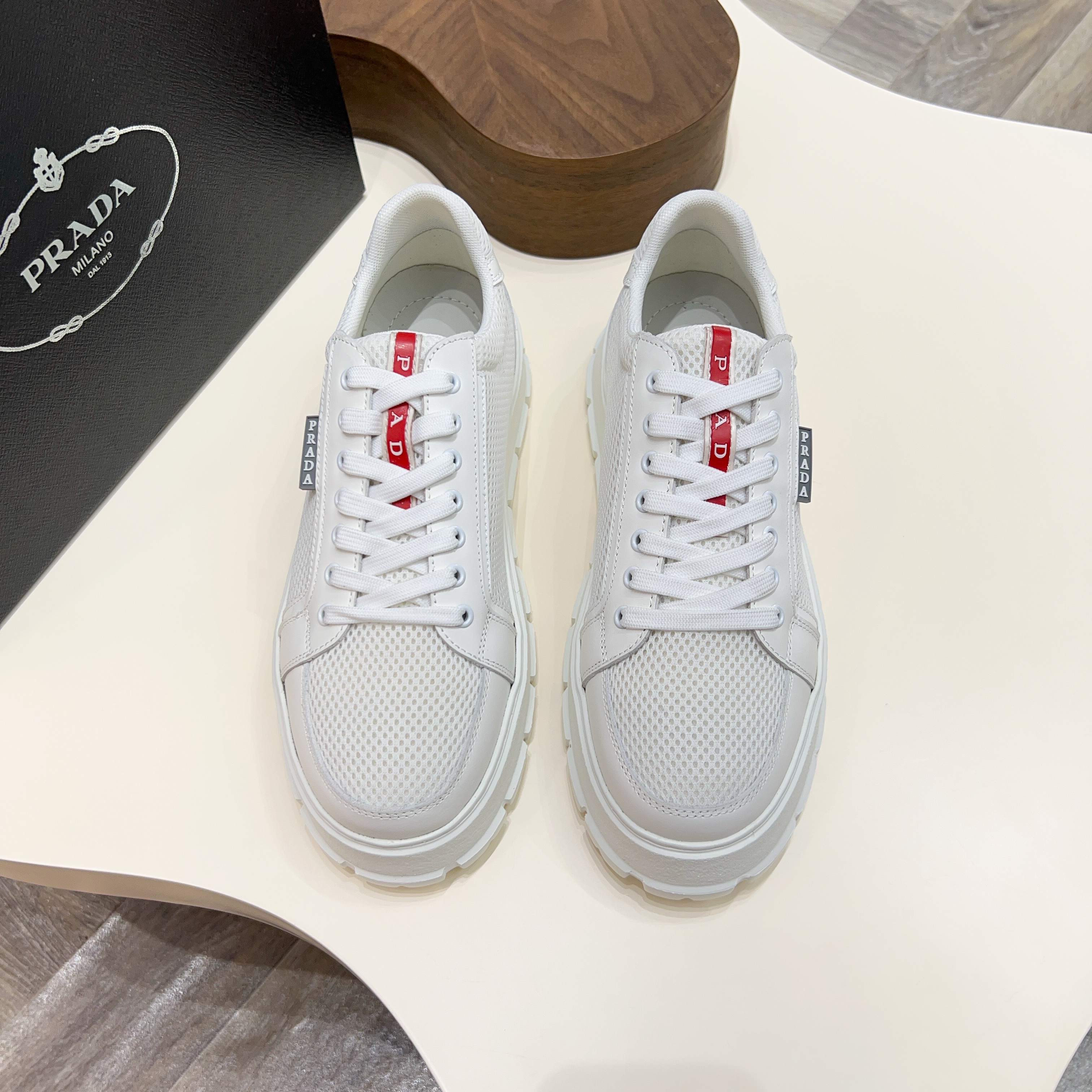 这款鞋子是AAAAA 1:1 质量 (非常棒). 使用了和原版一模一样的材料. 商标部分也保持了和普拉达/Prada一样. 图片拍摄是实物鞋子拍摄, 您所收到的实物保证和我们图片一模一样.