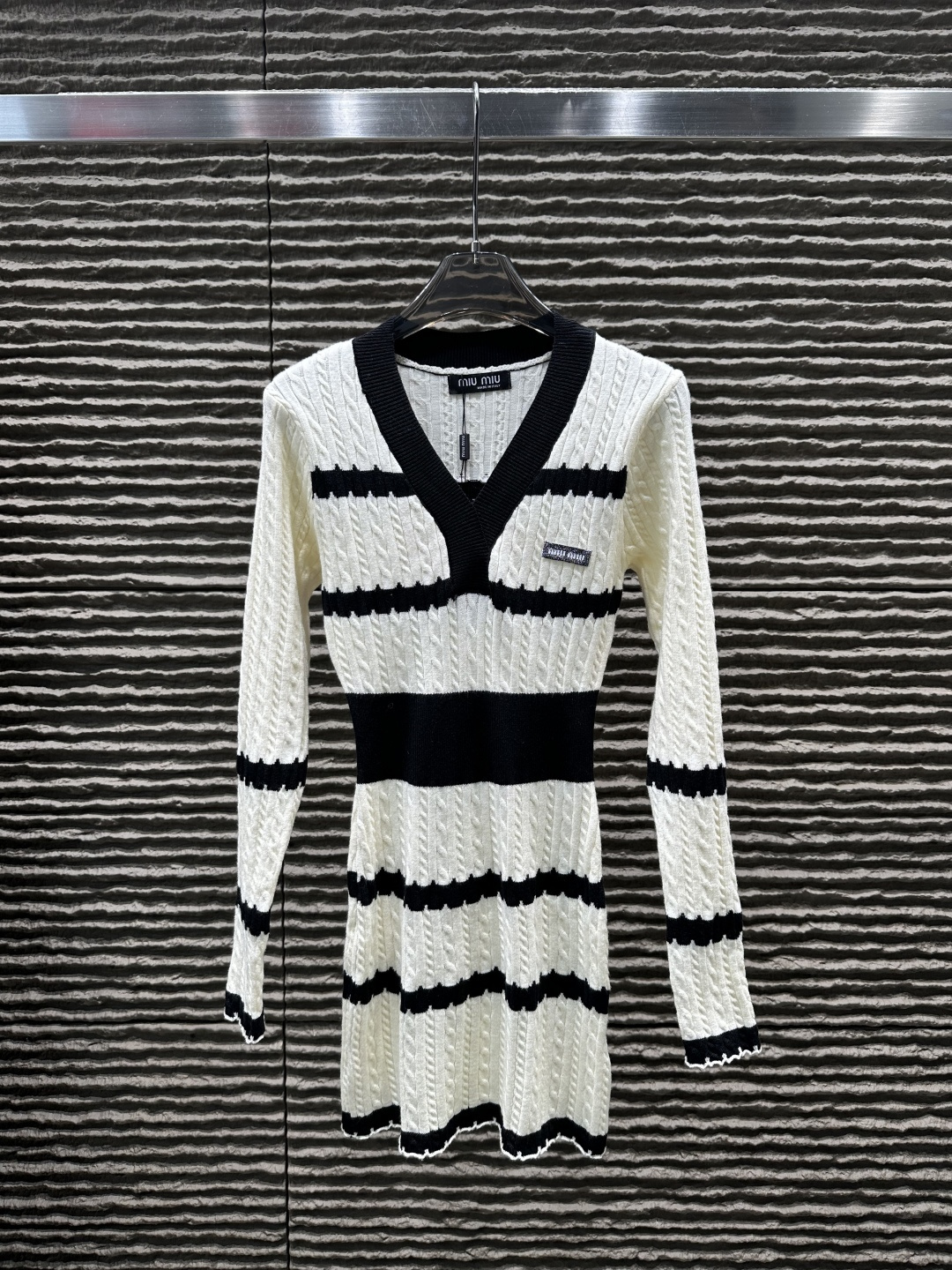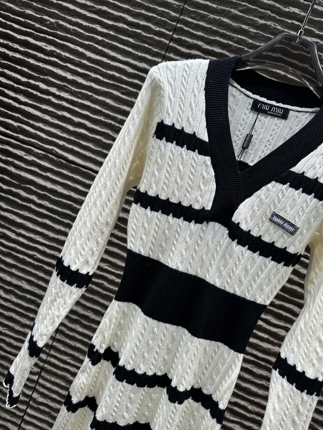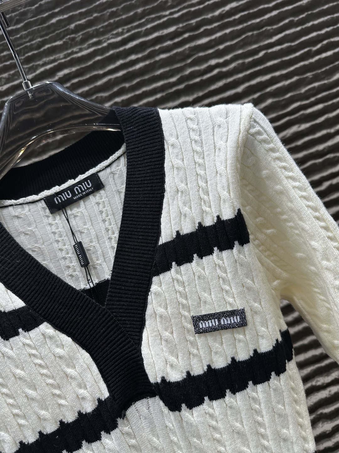 这款衣服是AAAAA 1:1 质量 (非常棒). 使用了和原版一模一样的材料. 商标部分也保持了和缪缪/Miu Miu一样. 图片拍摄是实物衣服拍摄, 您所收到的实物保证和我们图片一模一样.