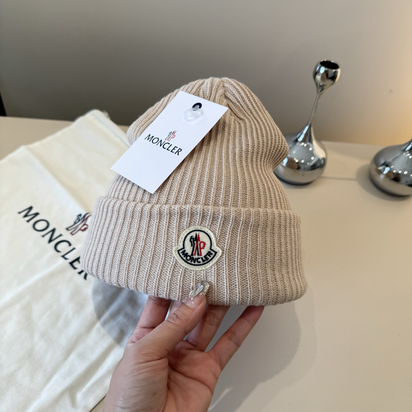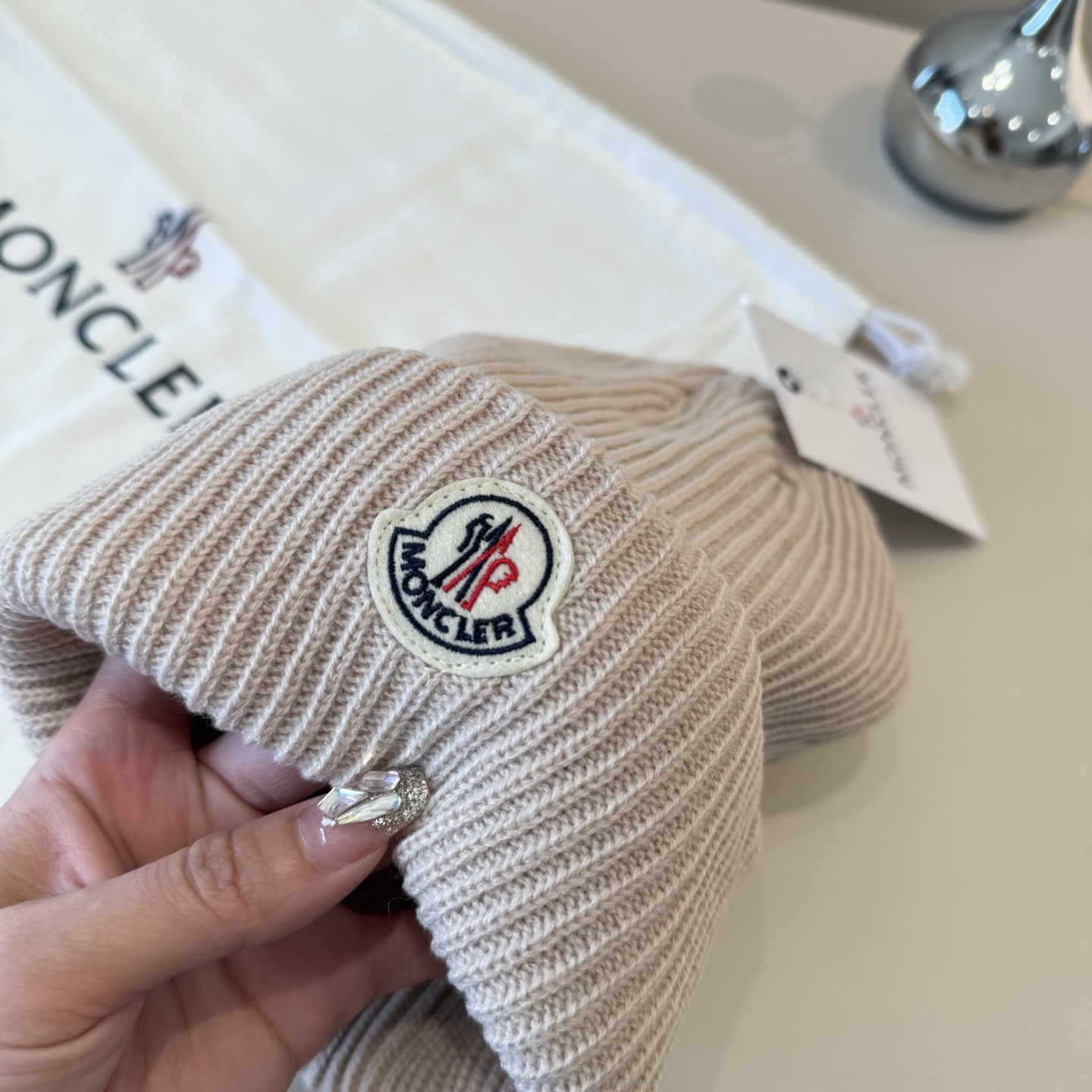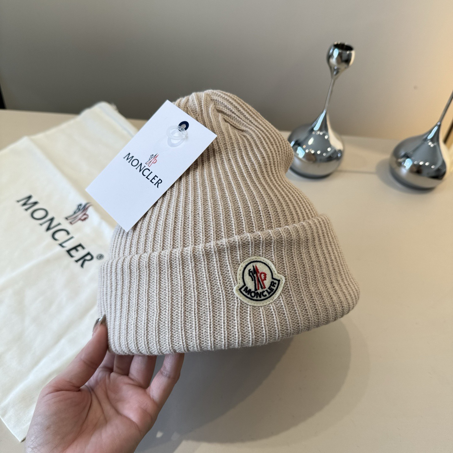 这款帽子是AAAAA 1:1 质量 (非常棒). 使用了和原版一模一样的材料. 商标部分也保持了和盟可睐/moncler一样. 图片拍摄是实物帽子拍摄, 您所收到的实物保证和我们图片一模一样.