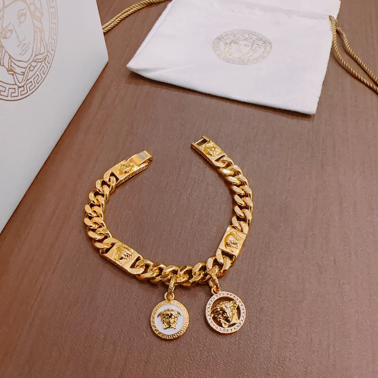 这款首饰是AAAAA 1:1 质量 (非常棒). 使用了和原版一模一样的材料. 商标部分也保持了和范思哲/Versace一样. 图片拍摄是实物首饰拍摄, 您所收到的实物保证和我们图片一模一样.