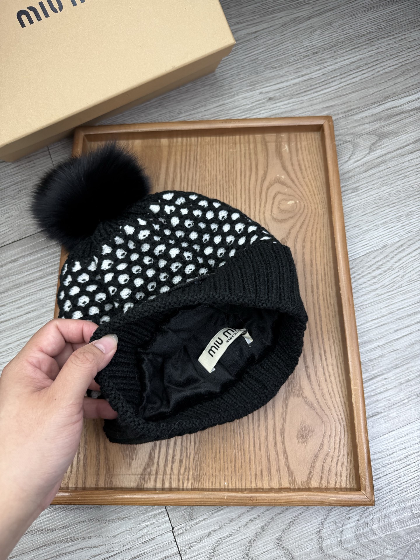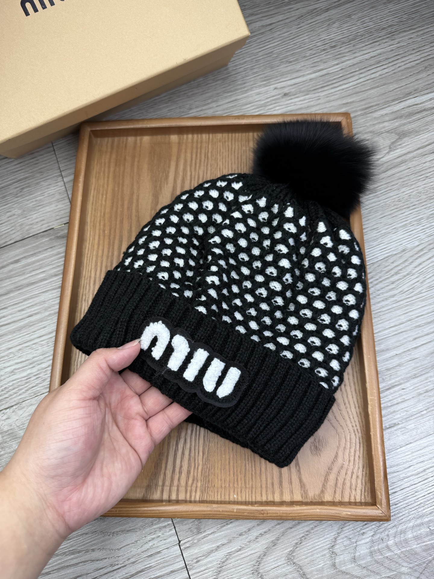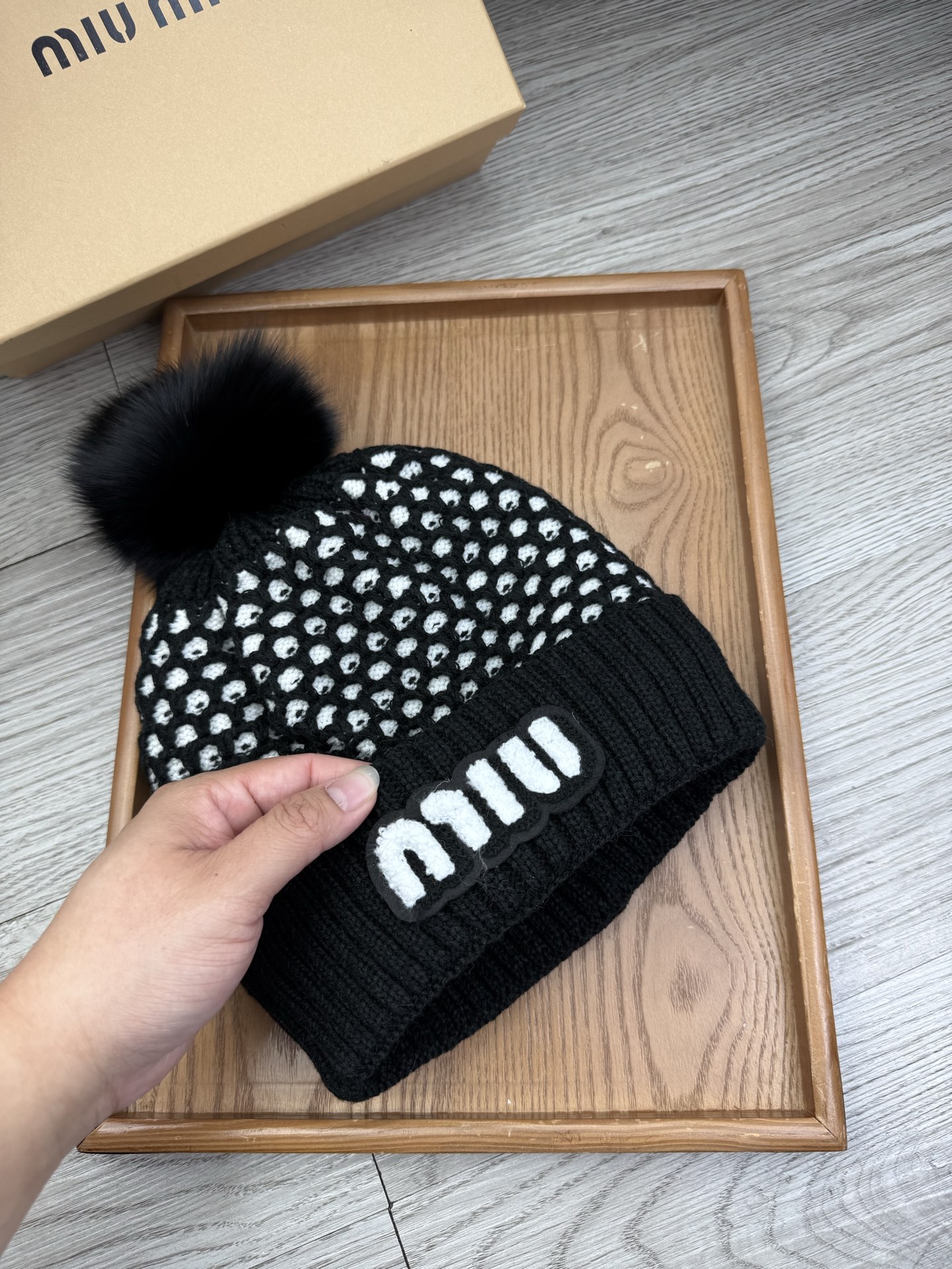 这款帽子是AAAAA 1:1 质量 (非常棒). 使用了和原版一模一样的材料. 商标部分也保持了和缪缪/Miu Miu一样. 图片拍摄是实物帽子拍摄, 您所收到的实物保证和我们图片一模一样.