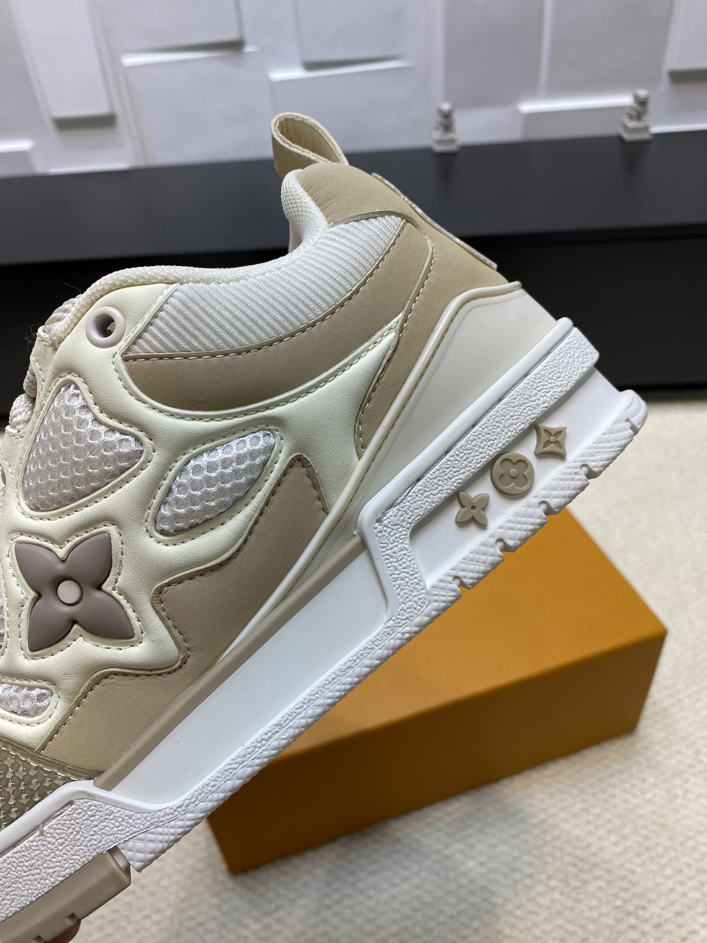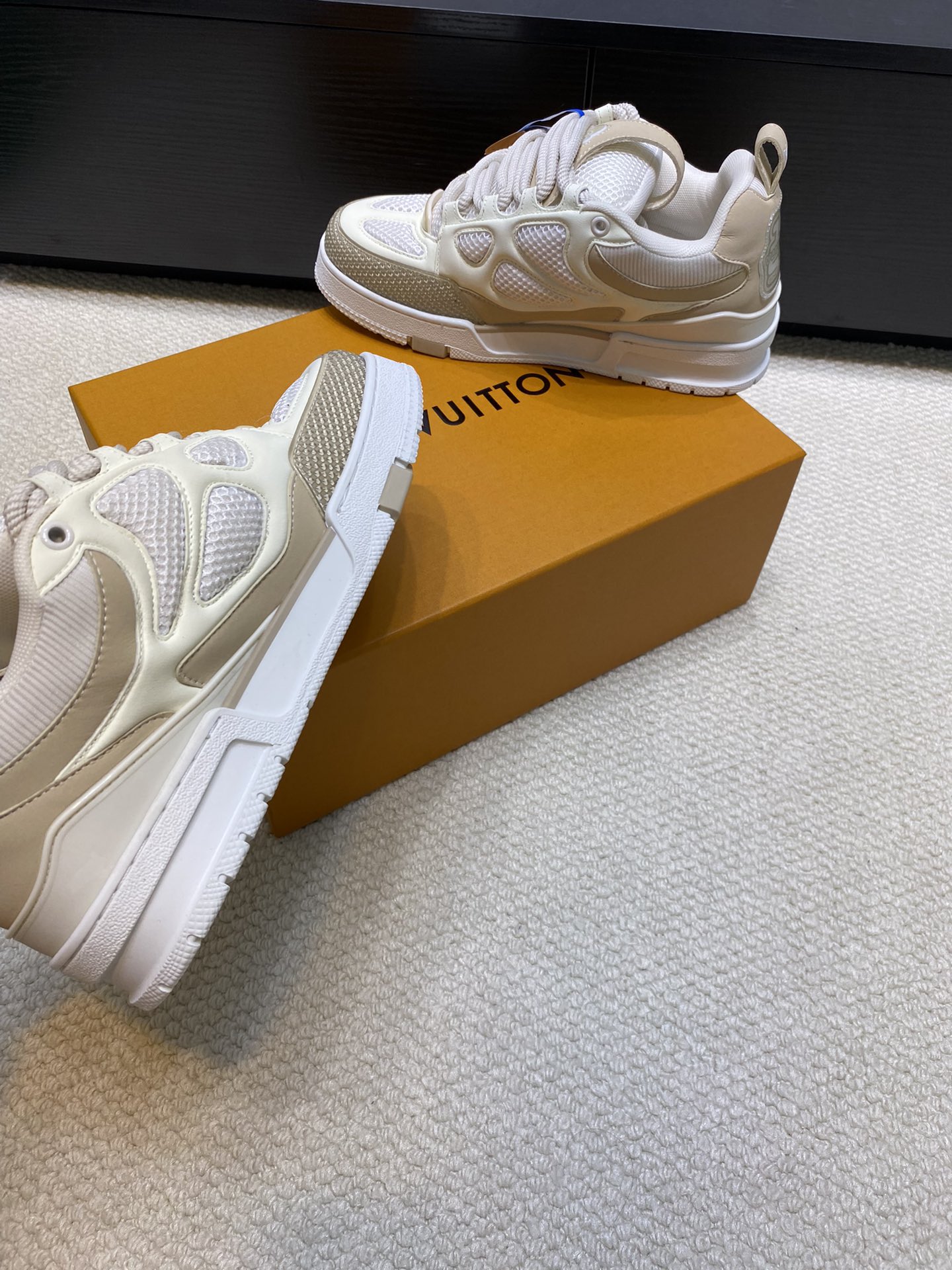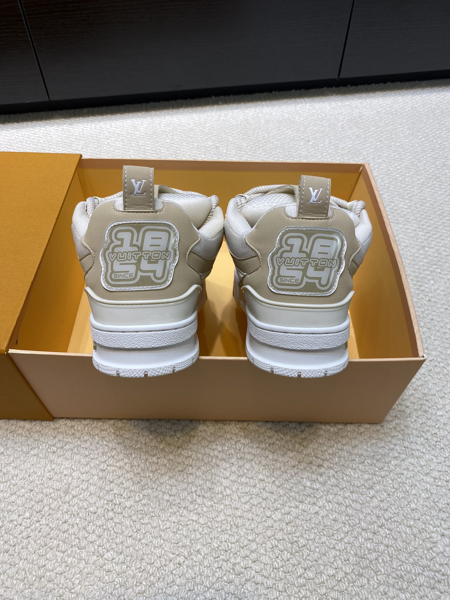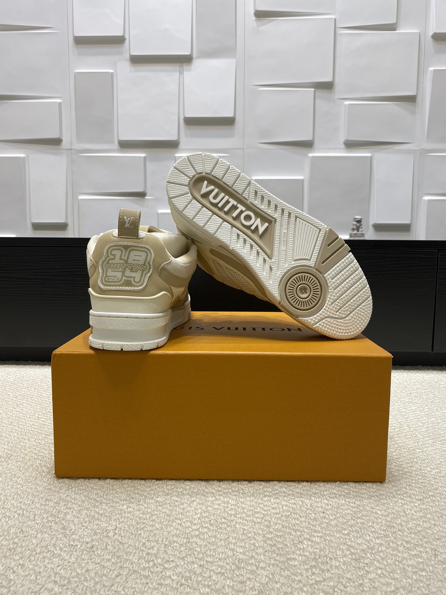 这款鞋子是AAAAA 1:1 质量 (非常棒). 使用了和原版一模一样的材料. 商标部分也保持了和路易威登/Louis Vuitton一样. 图片拍摄是实物鞋子拍摄, 您所收到的实物保证和我们图片一模一样.