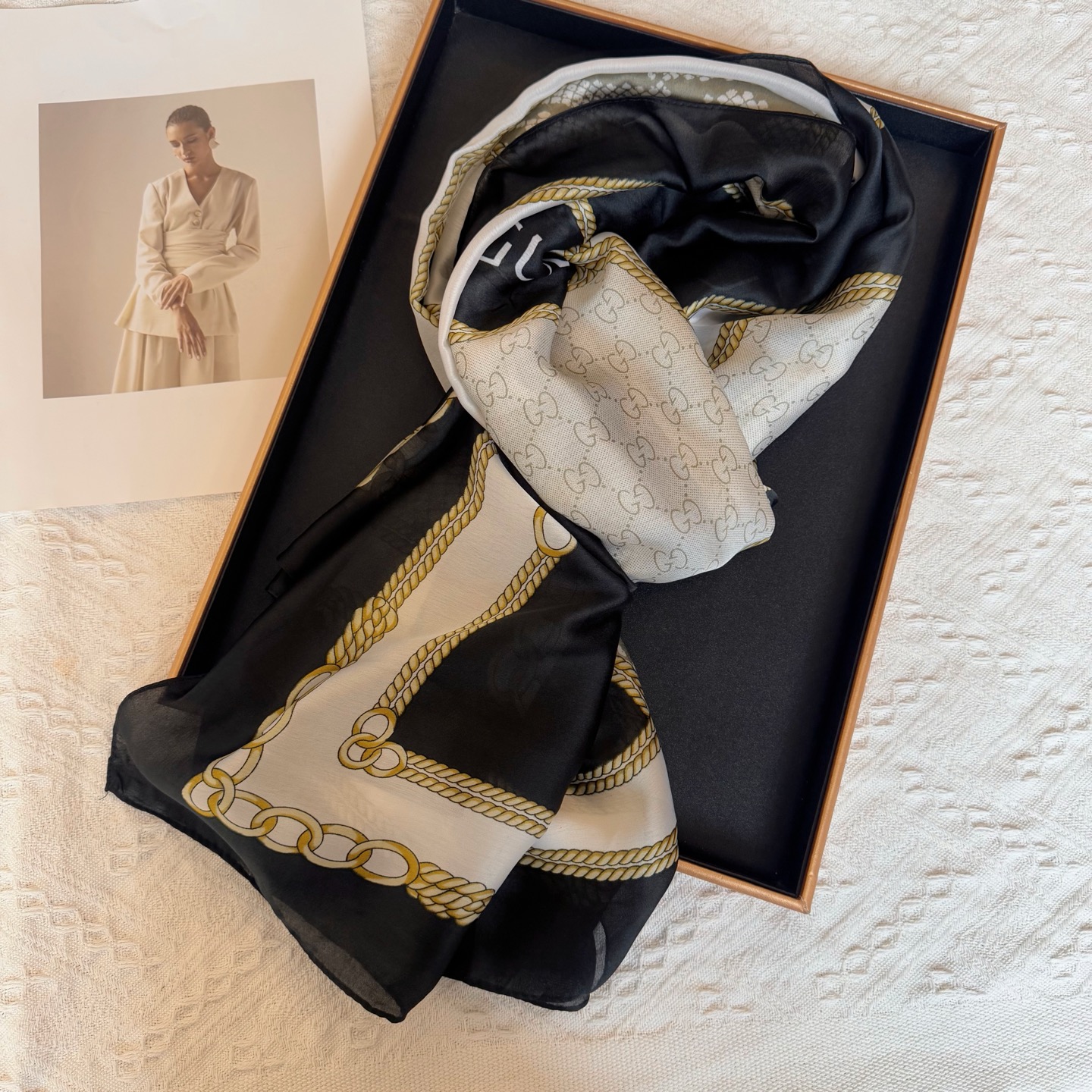 这款围巾是AAAAA 1:1 质量 (非常棒). 使用了和原版一模一样的材料. 商标部分也保持了和一样. 图片拍摄是实物围巾拍摄, 您所收到的实物保证和我们图片一模一样.