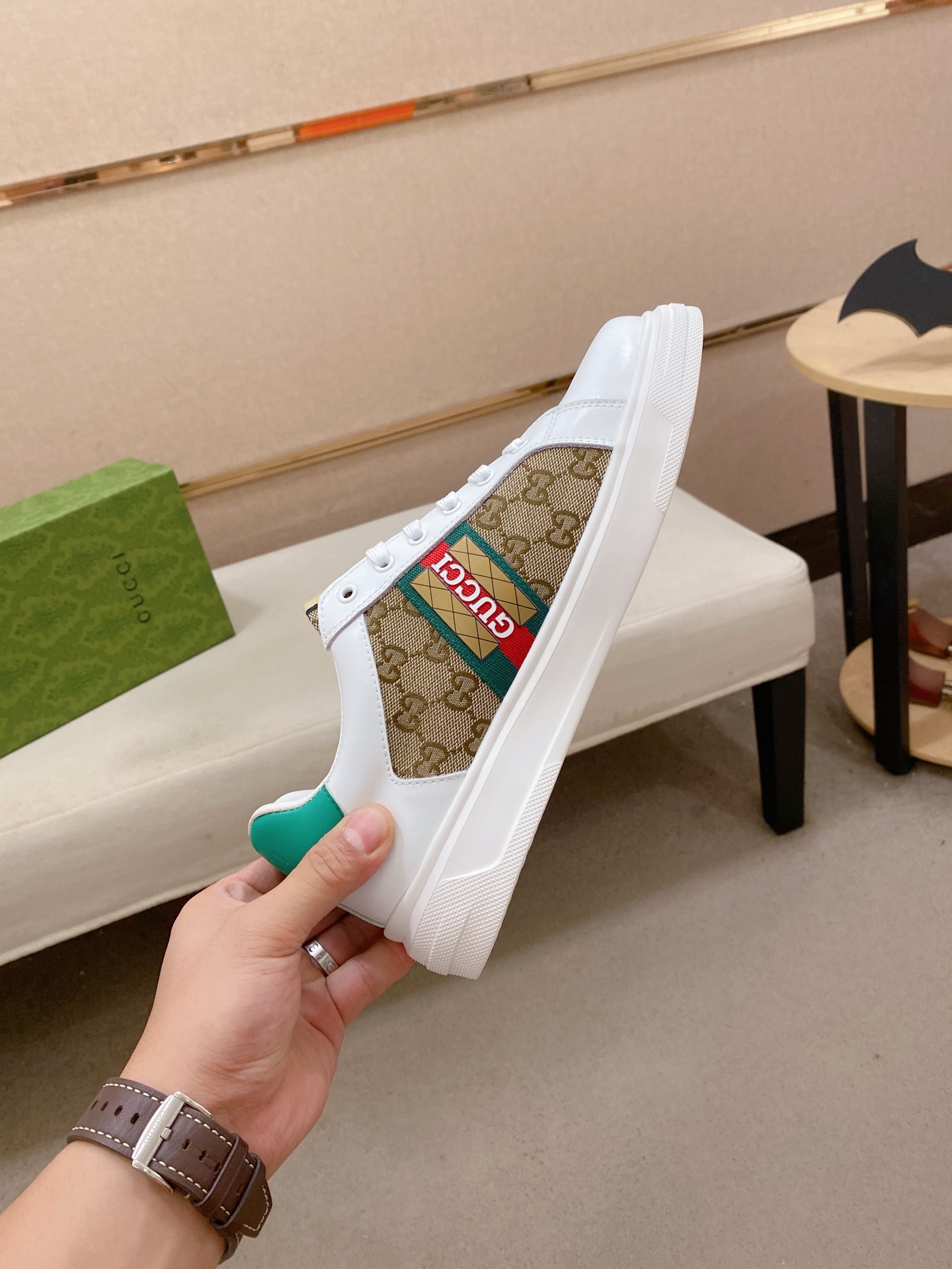 这款鞋子是AAAAA 1:1 质量 (非常棒). 使用了和原版一模一样的材料. 商标部分也保持了和古奇/Gucci一样. 图片拍摄是实物鞋子拍摄, 您所收到的实物保证和我们图片一模一样.