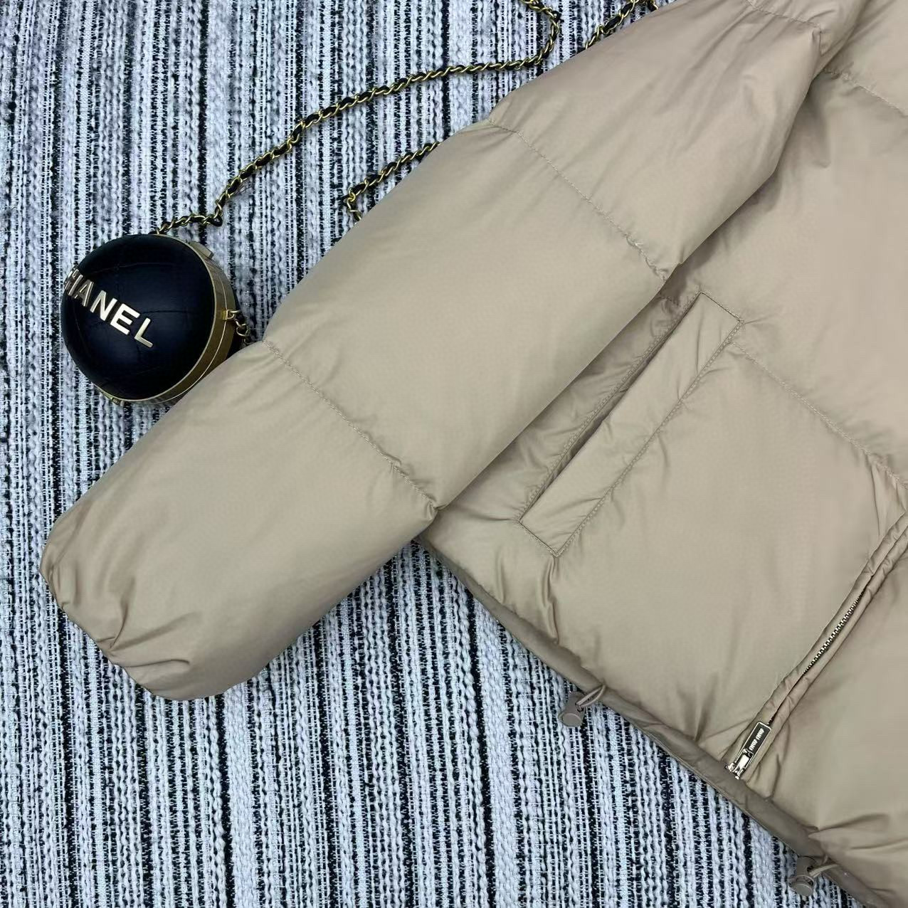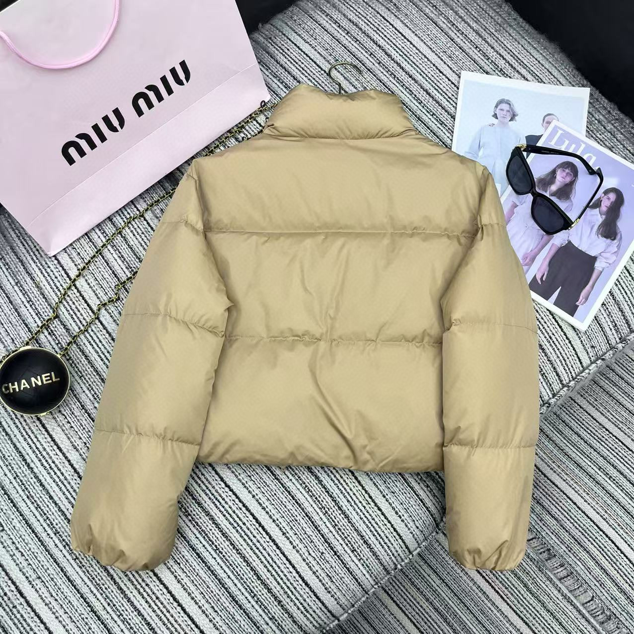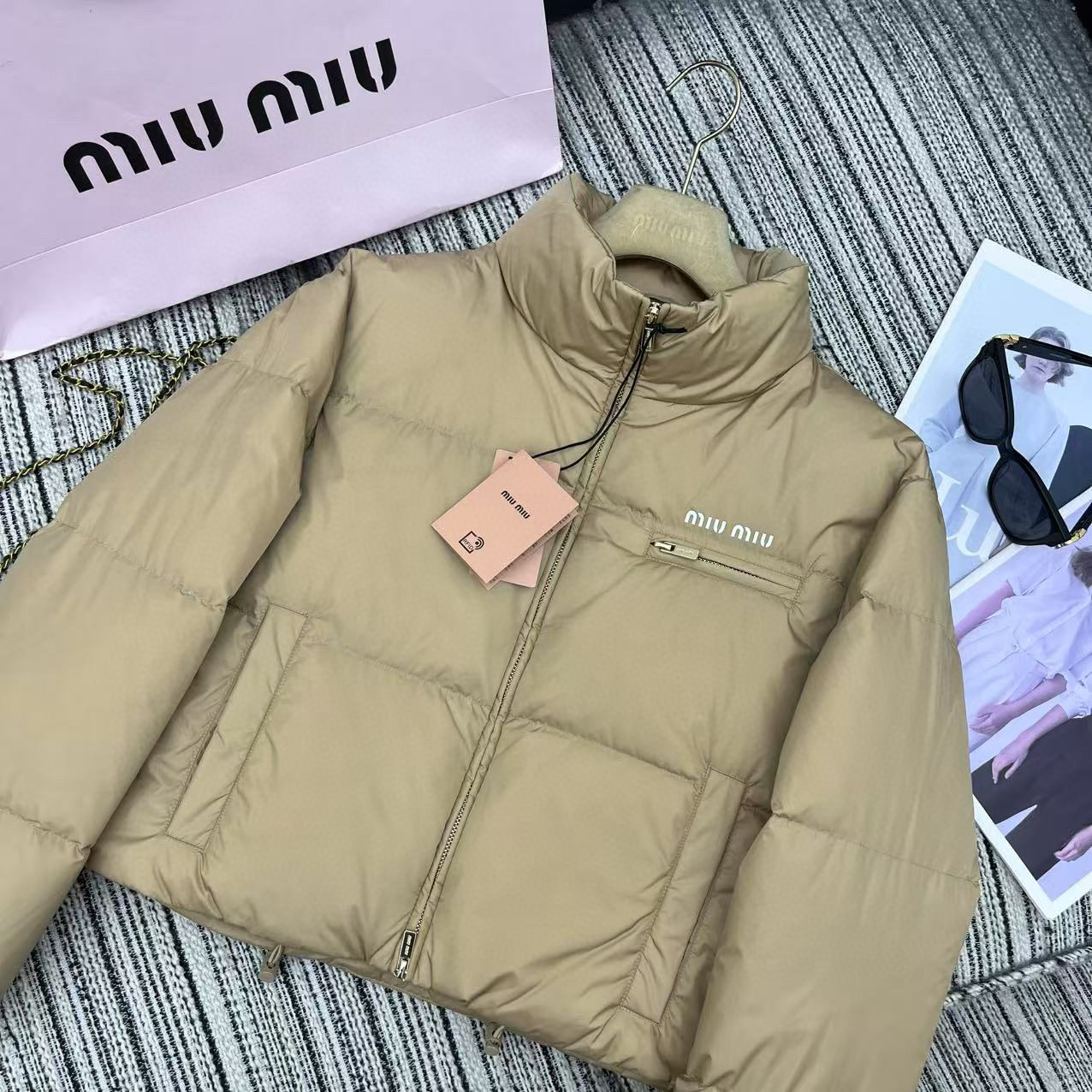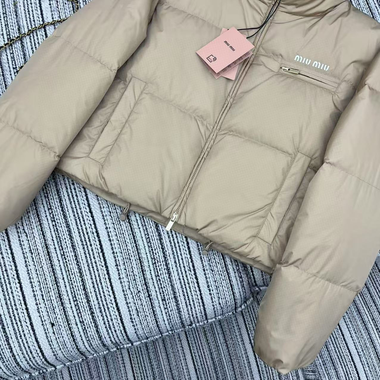 这款衣服是AAAAA 1:1 质量 (非常棒). 使用了和原版一模一样的材料. 商标部分也保持了和缪缪/Miu Miu一样. 图片拍摄是实物衣服拍摄, 您所收到的实物保证和我们图片一模一样.