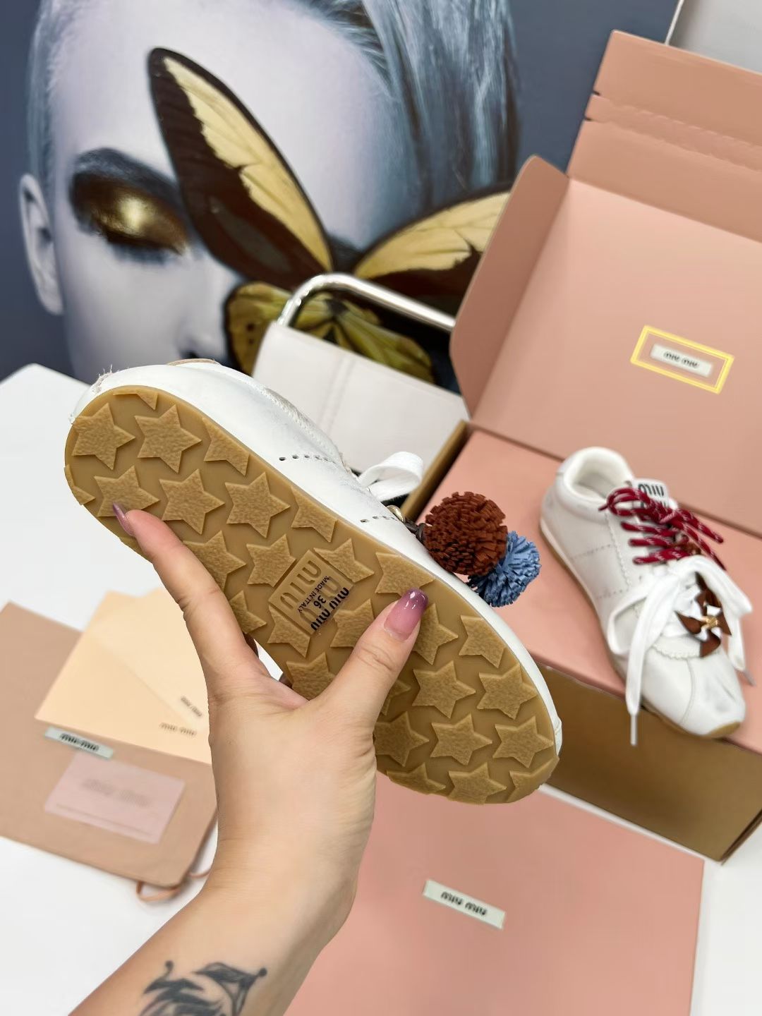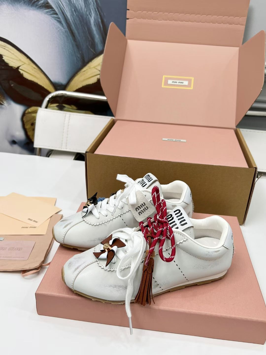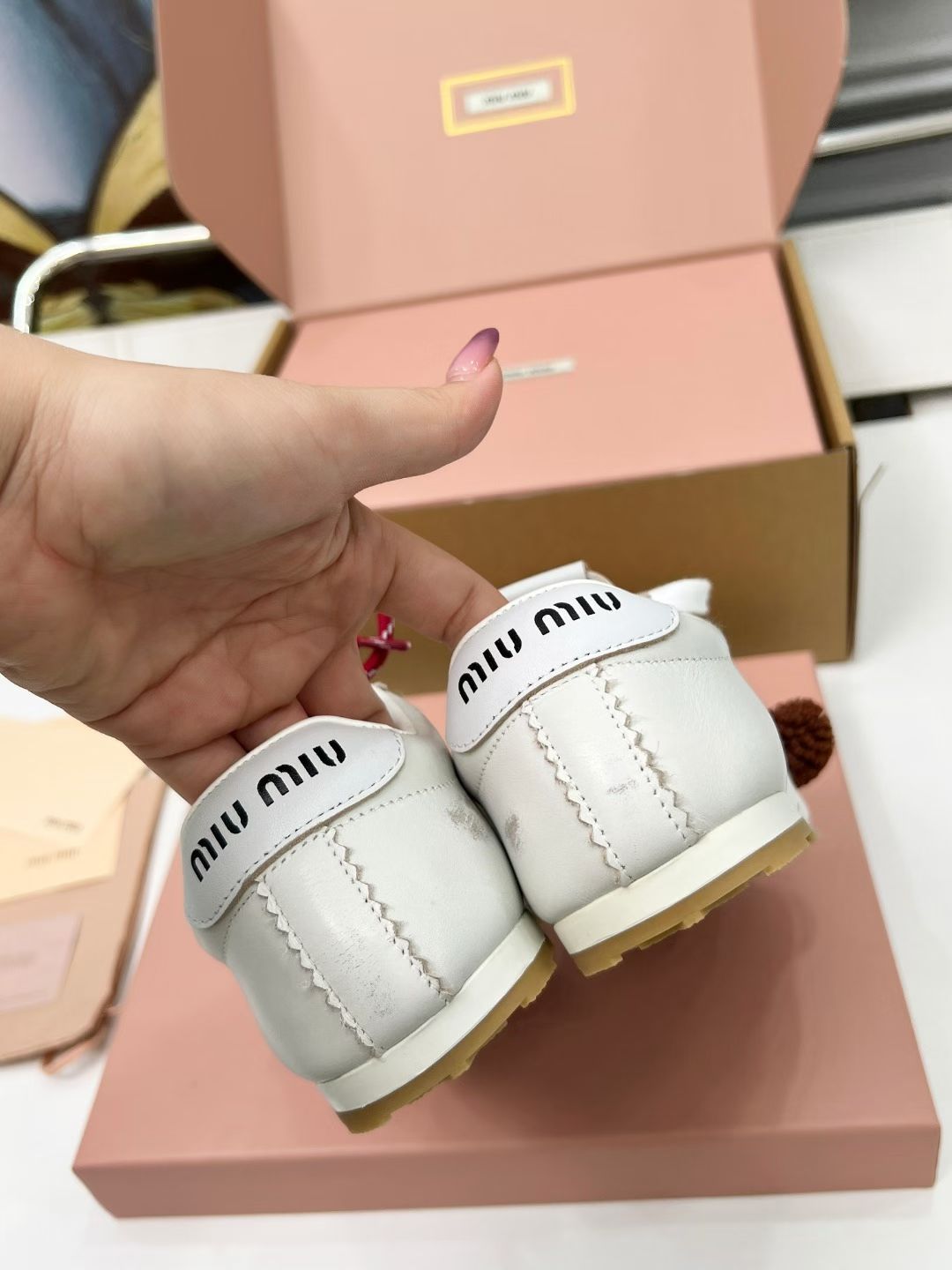这款鞋子是AAAAA 1:1 质量 (非常棒). 使用了和原版一模一样的材料. 商标部分也保持了和缪缪/Miu Miu一样. 图片拍摄是实物鞋子拍摄, 您所收到的实物保证和我们图片一模一样.