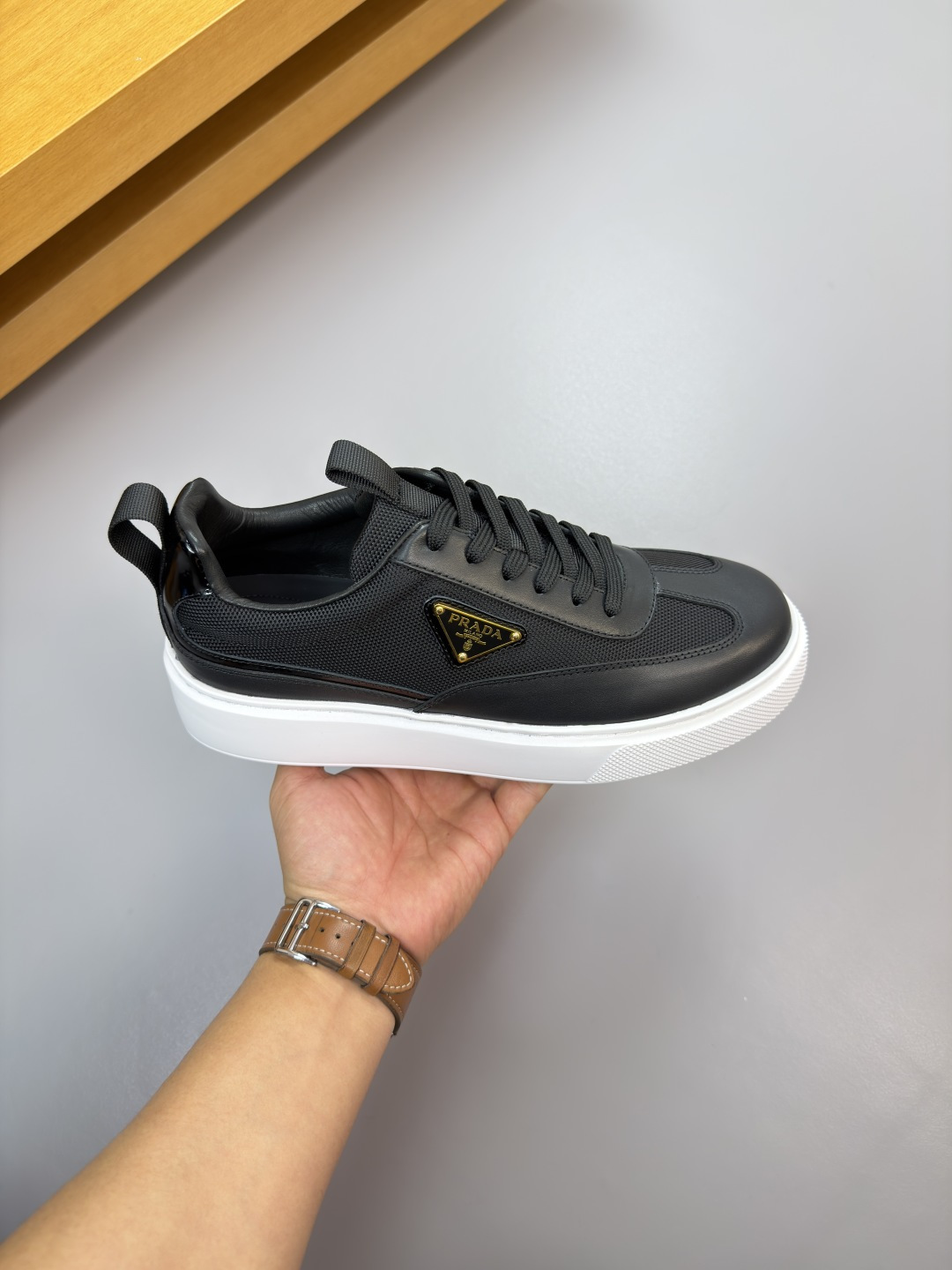 这款鞋子是AAAAA 1:1 质量 (非常棒). 使用了和原版一模一样的材料. 商标部分也保持了和普拉达/Prada一样. 图片拍摄是实物鞋子拍摄, 您所收到的实物保证和我们图片一模一样.