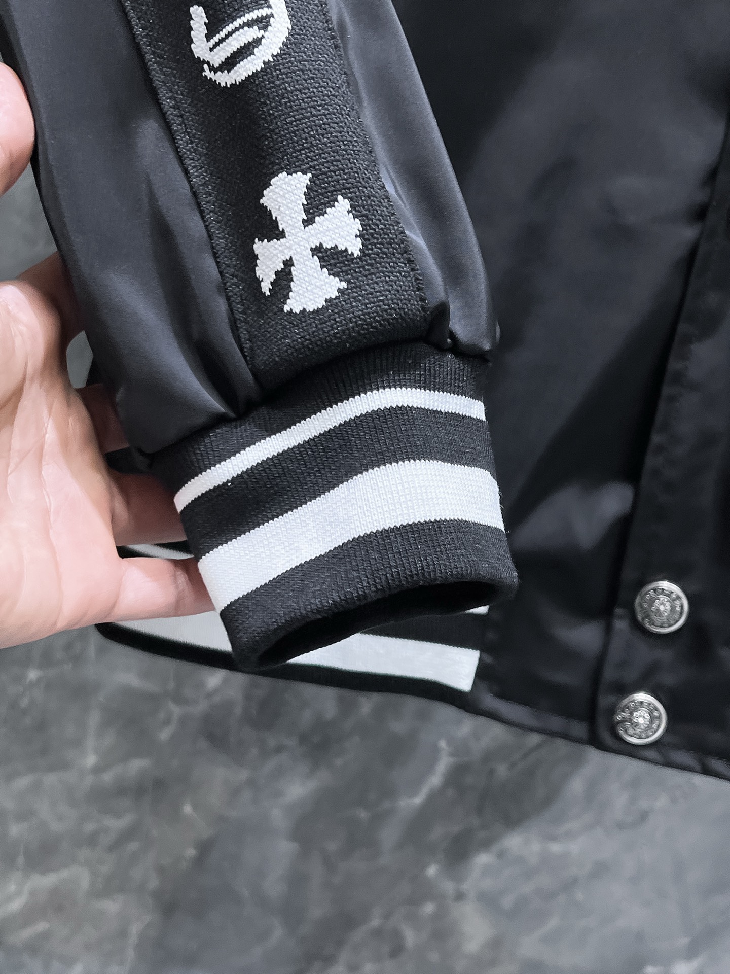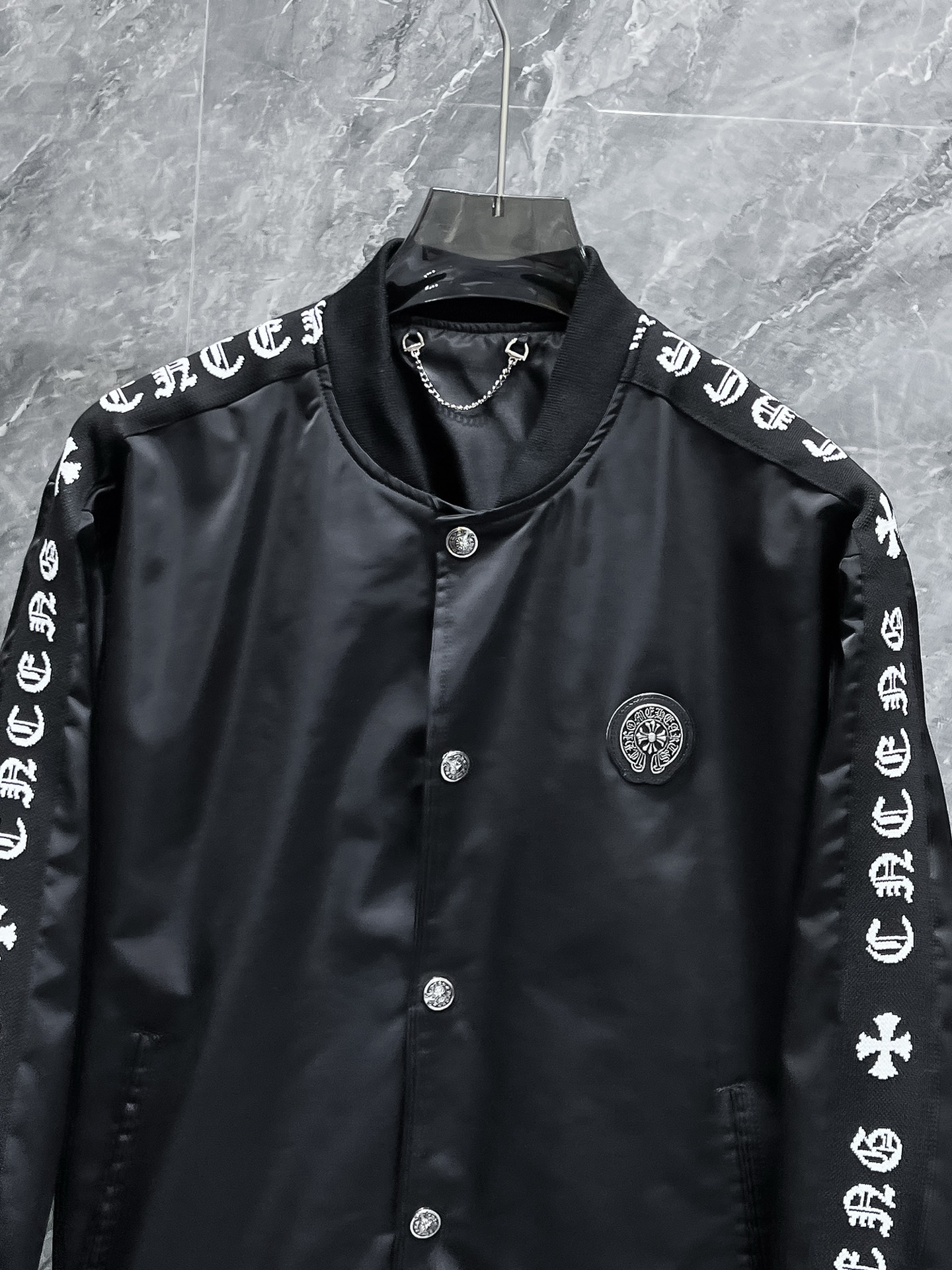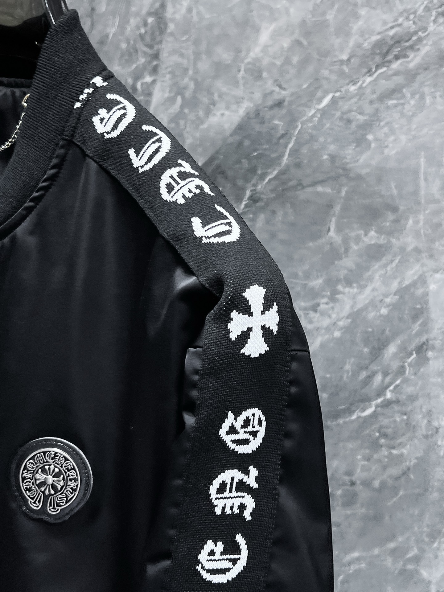 这款衣服是AAAAA 1:1 质量 (非常棒). 使用了和原版一模一样的材料. 商标部分也保持了和克罗心/Chrome Hearts一样. 图片拍摄是实物衣服拍摄, 您所收到的实物保证和我们图片一模一样.